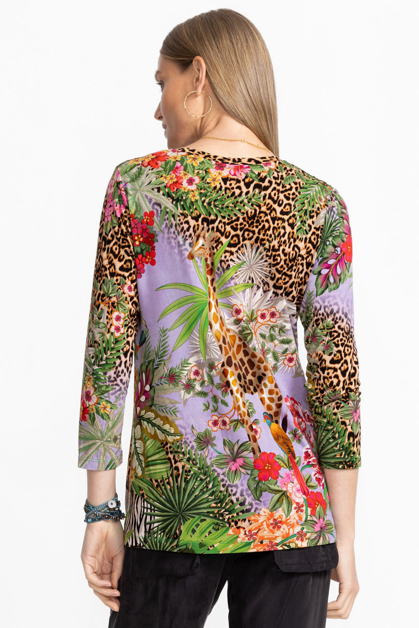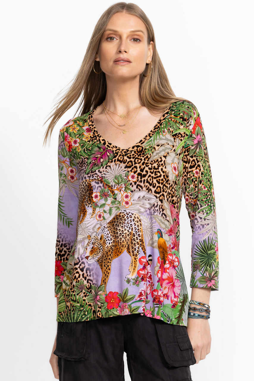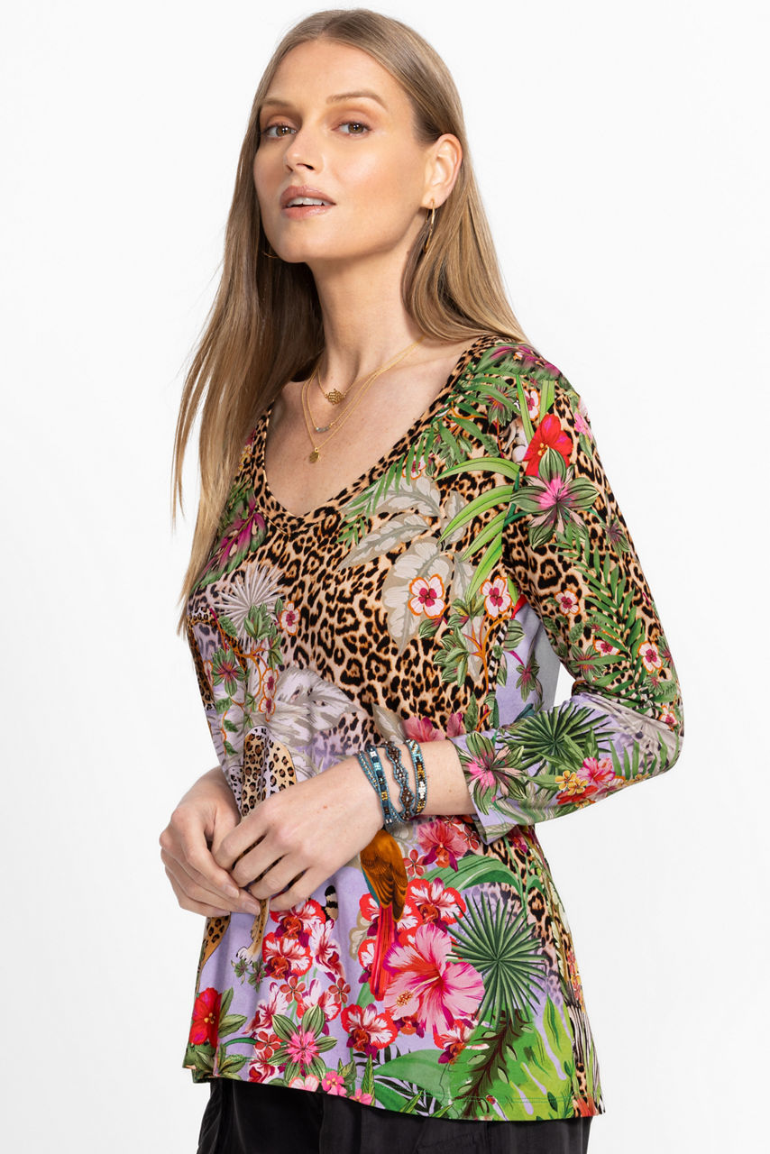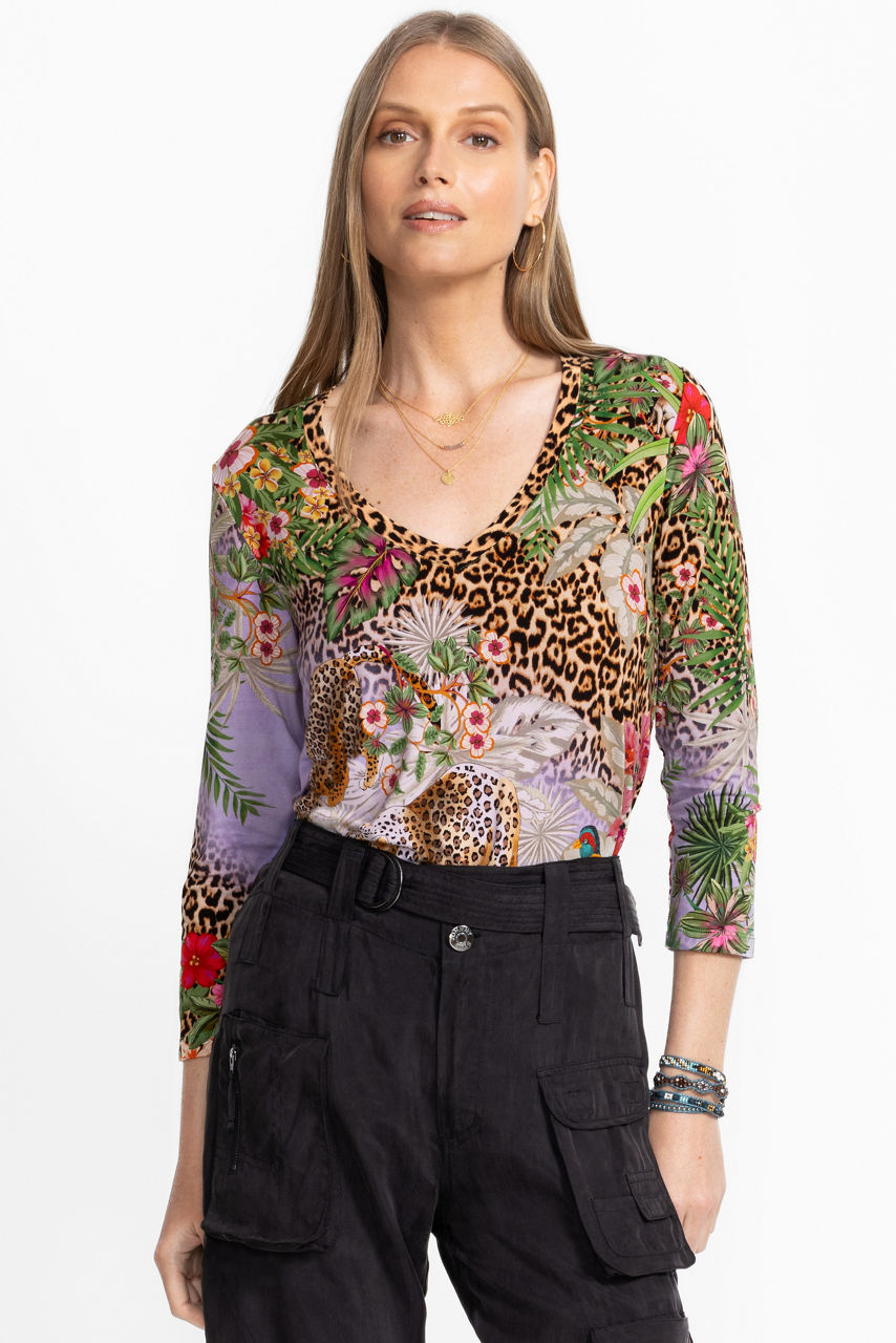 The Janie Favorite 3/4 Sleeve V-Neck Swing Tee is crafted from an incredibly soft lightweight stretch fabric. Designed with a V-neckline and 3/4 sleeves, this top is embellished with vibrant florals and bold leopard print and finished with a swing hemline. Pair with black pants and fashion sneakers for a bold casual look.