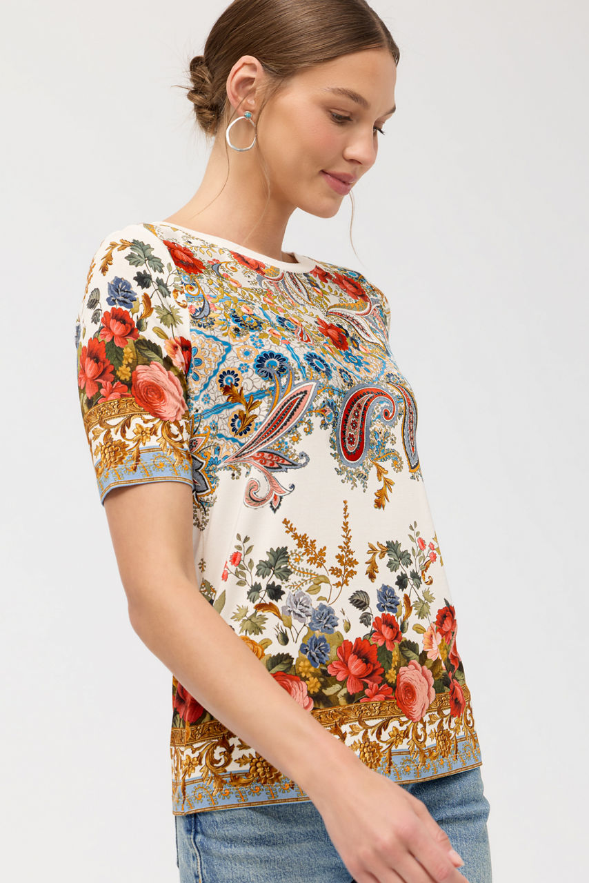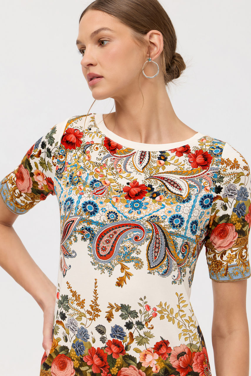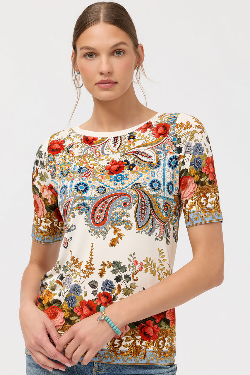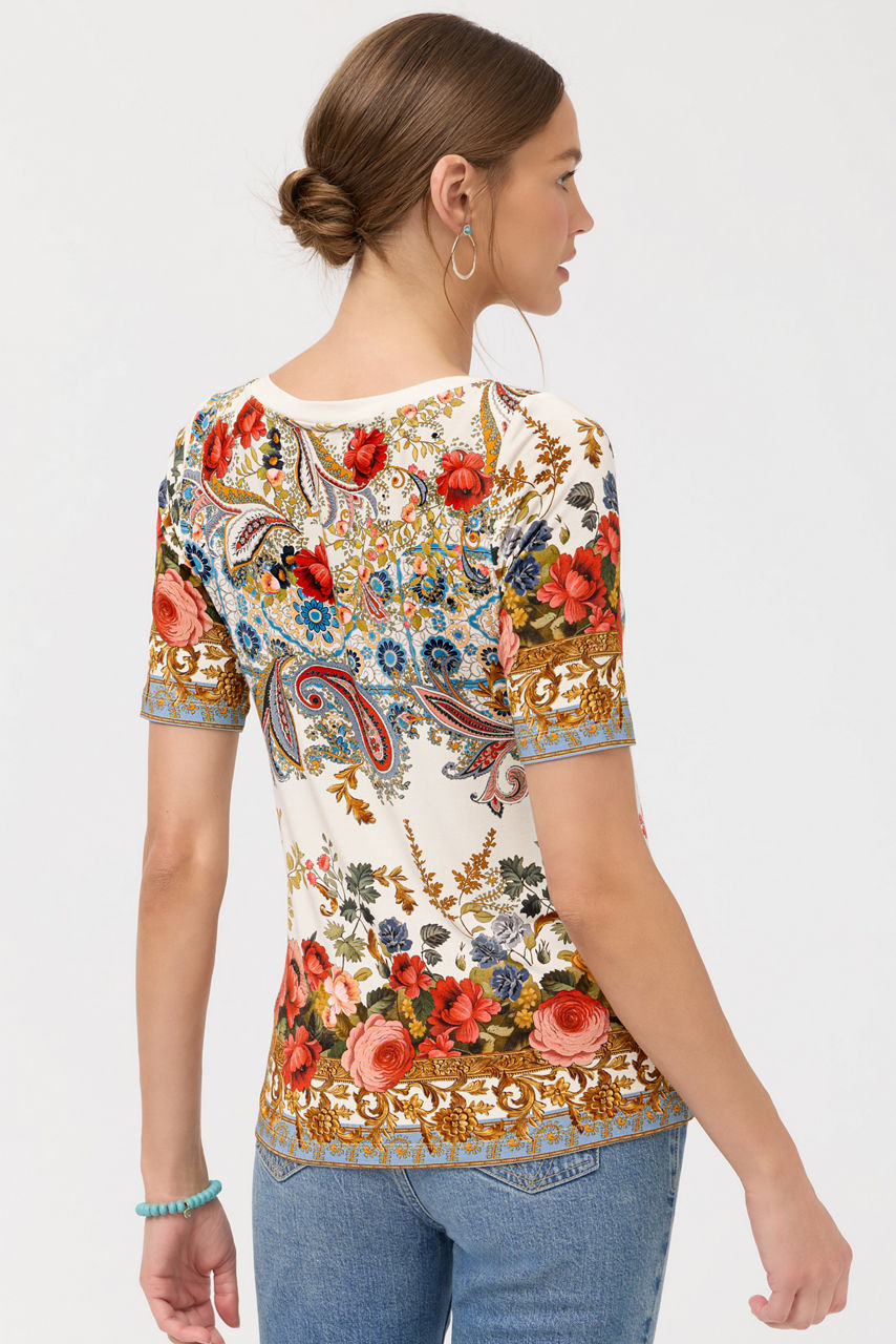 Thoughtfully embellished with an ornate pattern in a bold array of color, the Janie Favorite Boatneck Tee expresses personality and style. Designed with a boat neckline and 3/4 sleeves, this casual tee is finished with a fitted silhouette. Pair with linen shorts and fashion sneakers for a resort-inspired vacation look.
