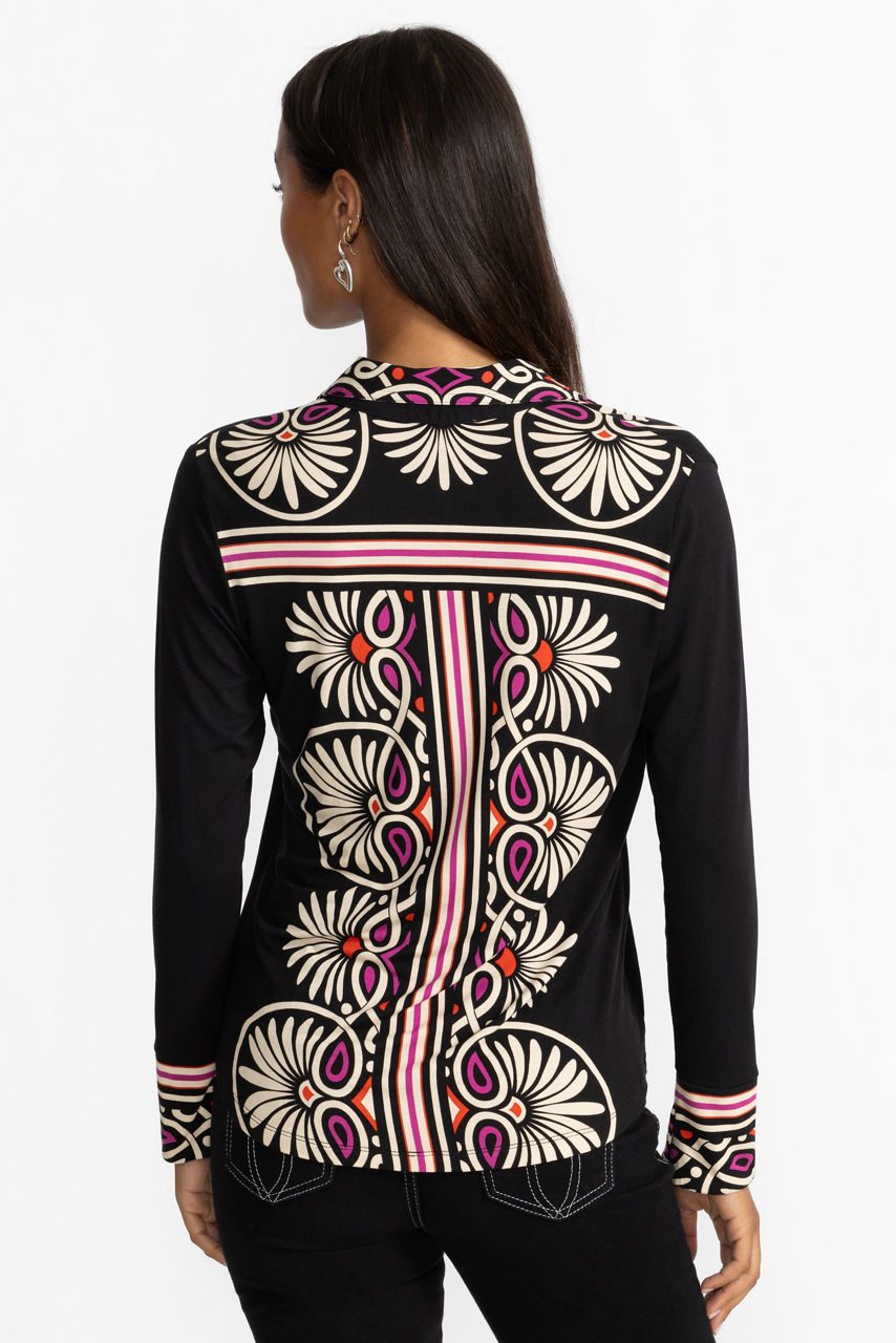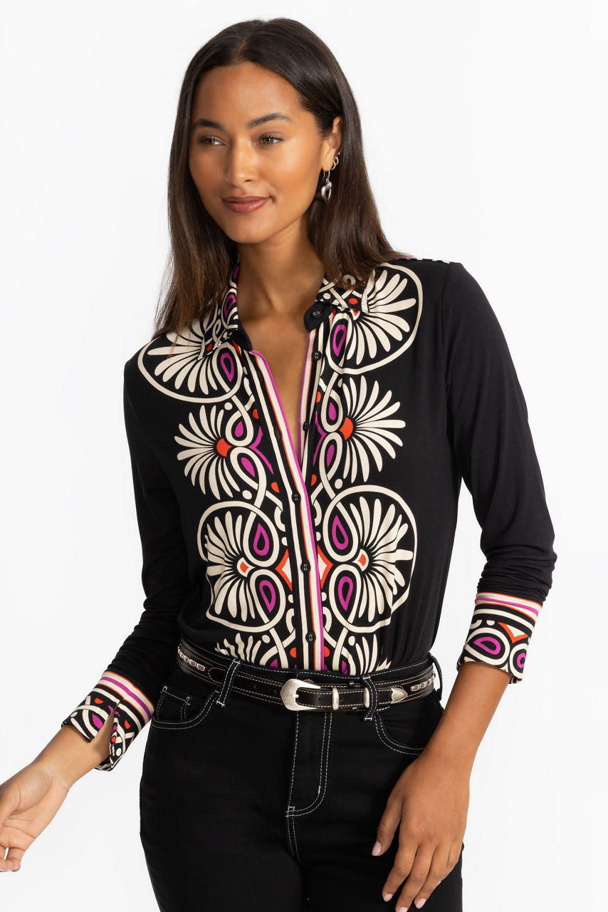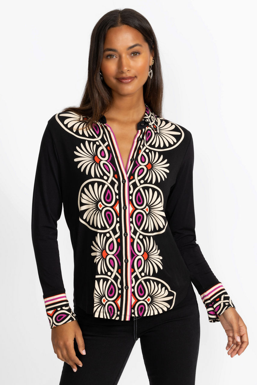Crafted from a lightweight fabric with a hint of stretch, the Janie Favorite Button Front Shirt is adorned with a bold, eye-catching pattern sure to be the highlight of any look. Designed with a traditional standing collar and long sleeves, this button-front shirt is highlighted with graphic accents. Pair with linen pants and sandals for an elevated weekend ensemble.
