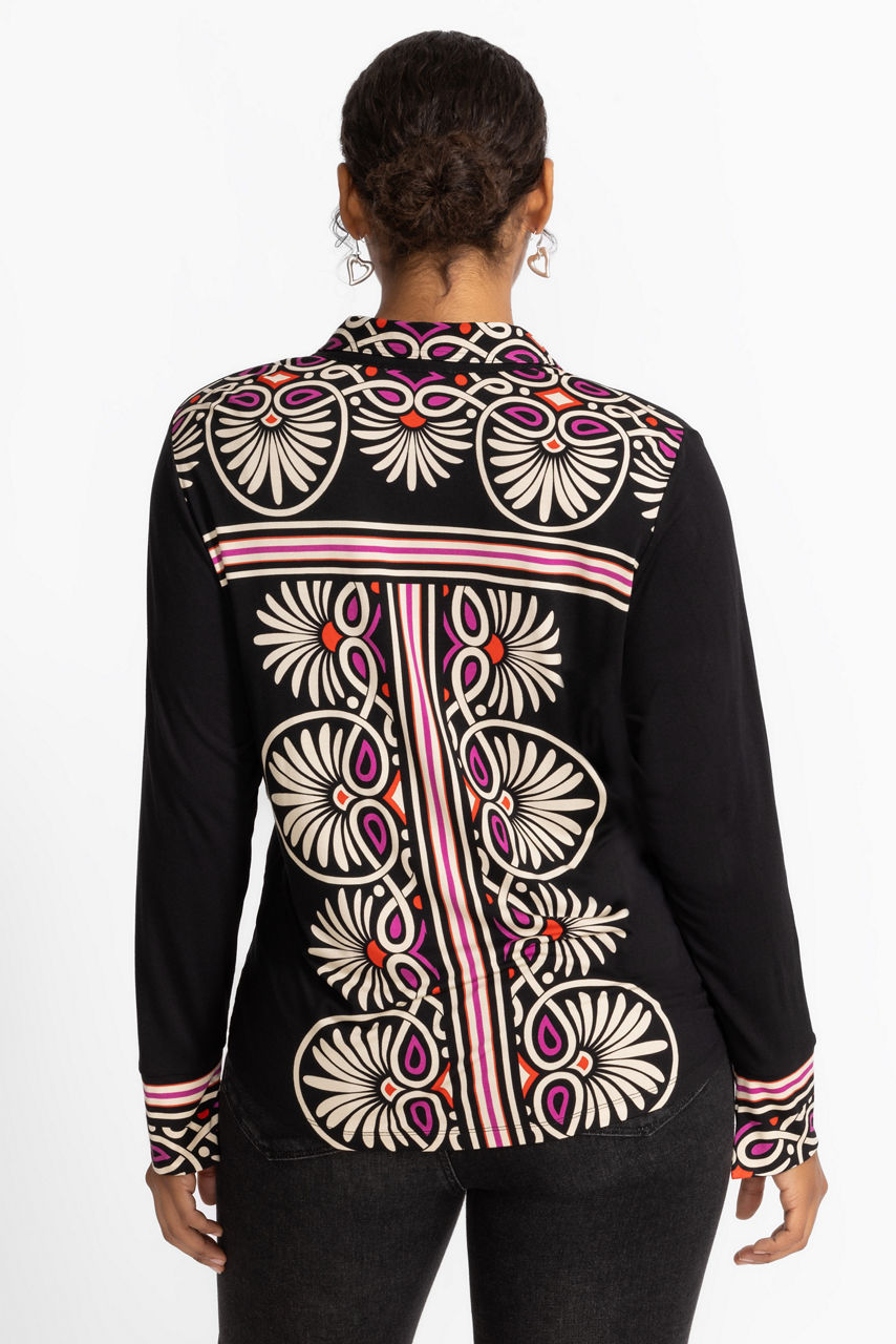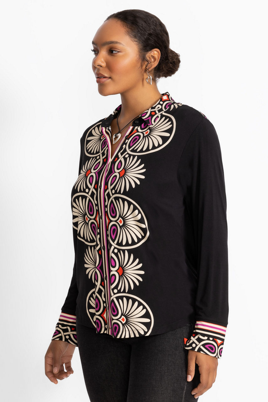 Crafted from a lightweight fabric with a hint of stretch, the Janie Favorite Button Front Shirt is adorned with a bold, eye-catching pattern sure to be the highlight of any look. Designed with a traditional standing collar and long sleeves, this button-front shirt is highlighted with graphic accents. Pair with linen pants and sandals for an elevated weekend ensemble.