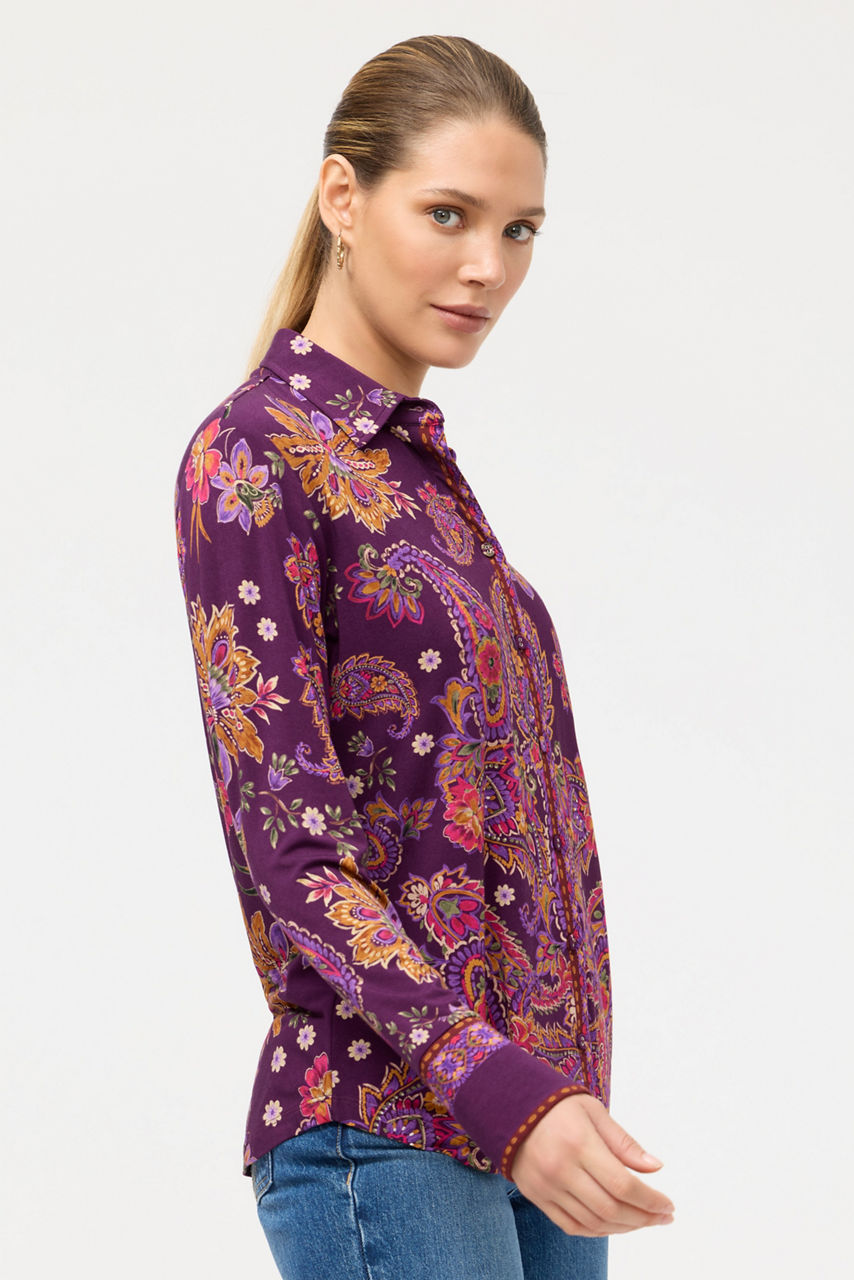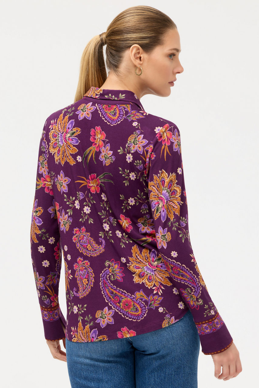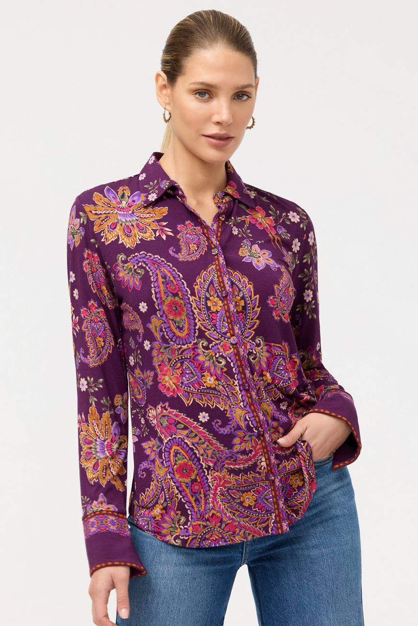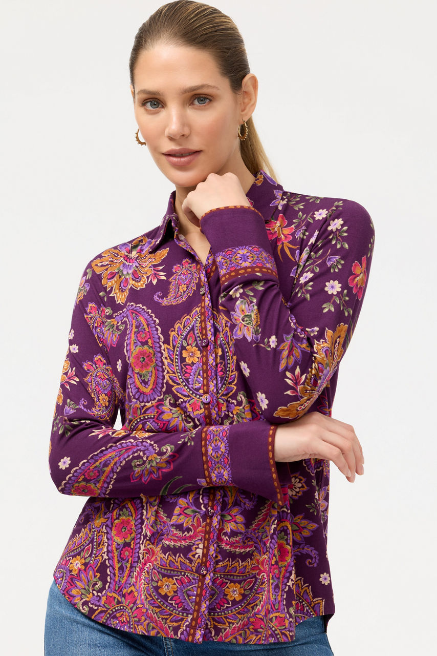 Boldly embellished with a vibrant paisley and floral pattern on a rich aubergine backdrop, the Janie Favorite Button Front Shirt offers a fresh take on classic shirting. Featuring a standing collar and a traditional button front, this colorful top is finished with a gently curved hemline. Pair with trousers and kitten heels for a streamlined workday look.