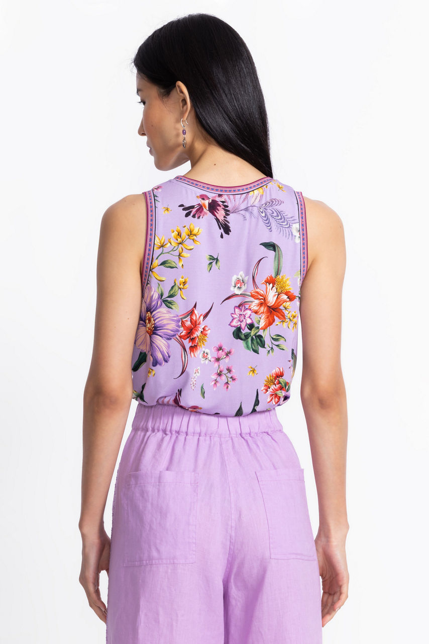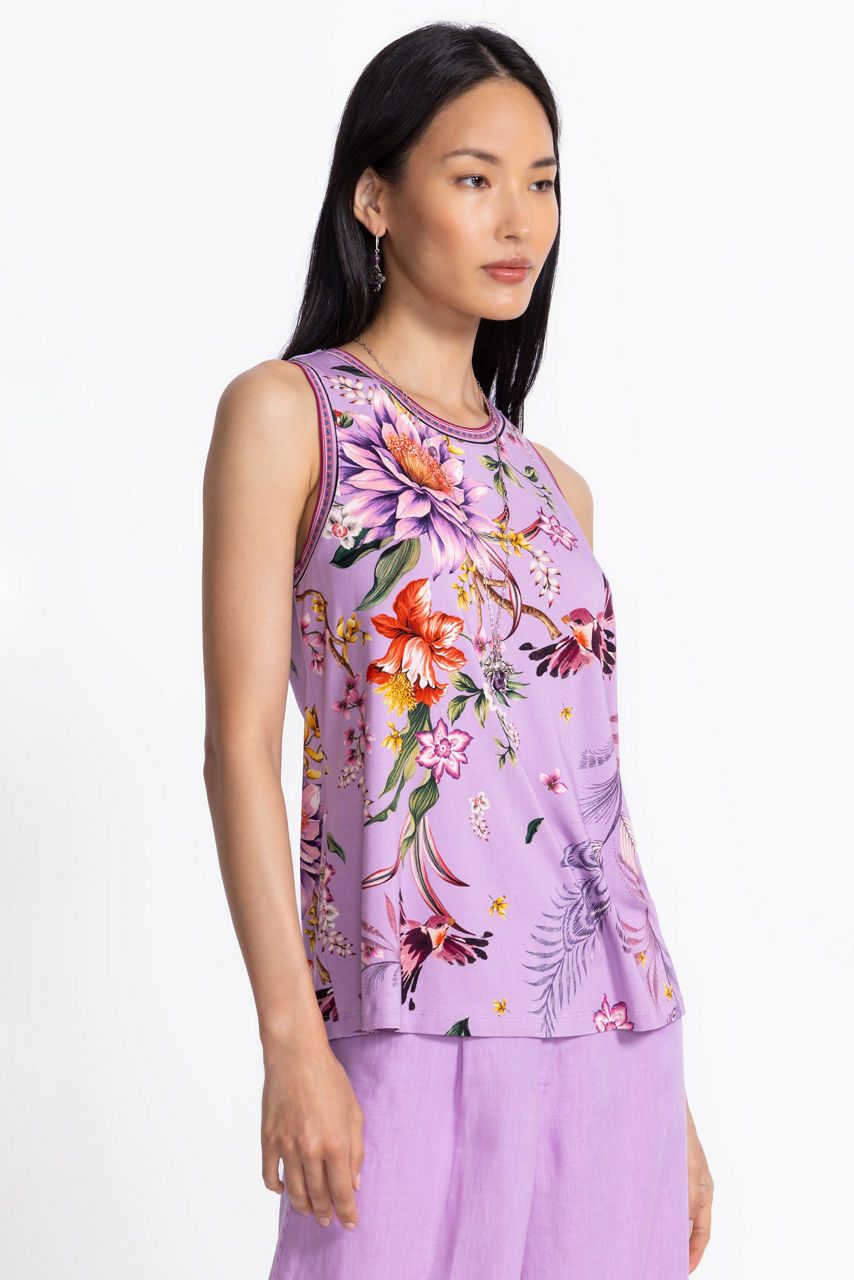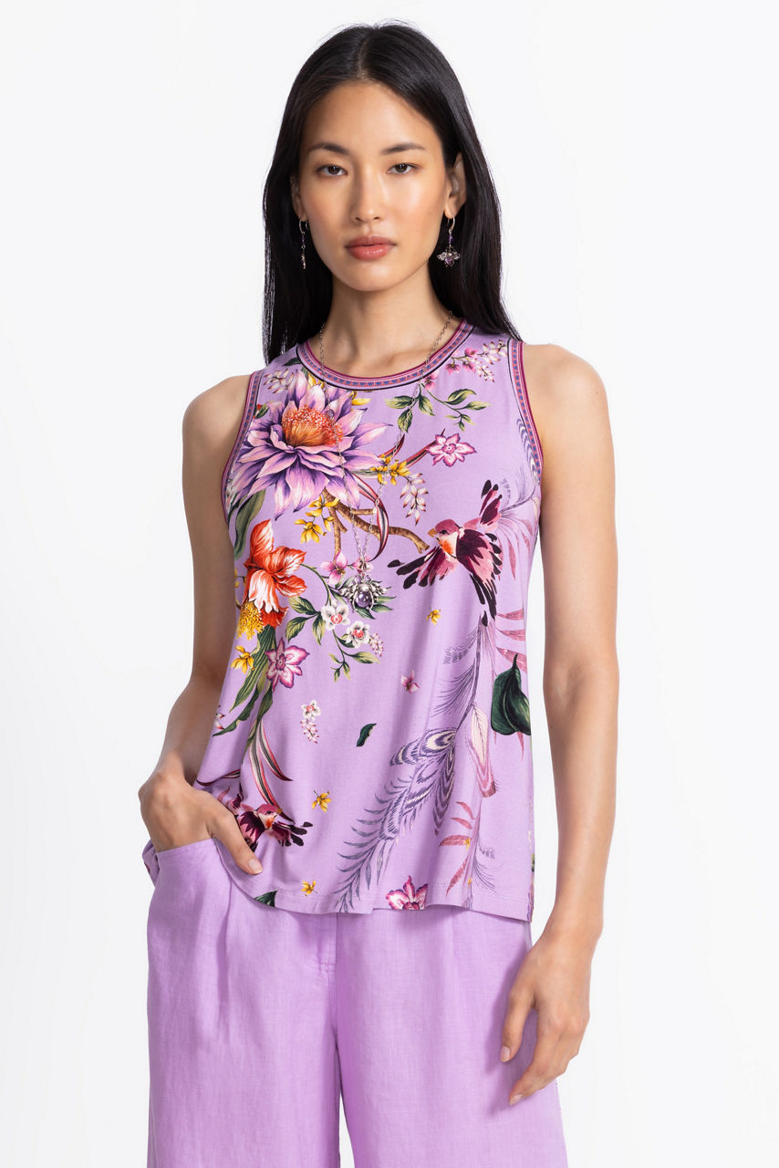 The Janie Favorite Crew Neck Swing Tank is crafted from a rich fabric with a hint of stretch. Featuring a crew neckline and a relaxed swing silhouette, this sleeveless tank is embellished with a vibrant floral design. Pair with olive green chinos and classic loafers for a weekend brunch with friends.