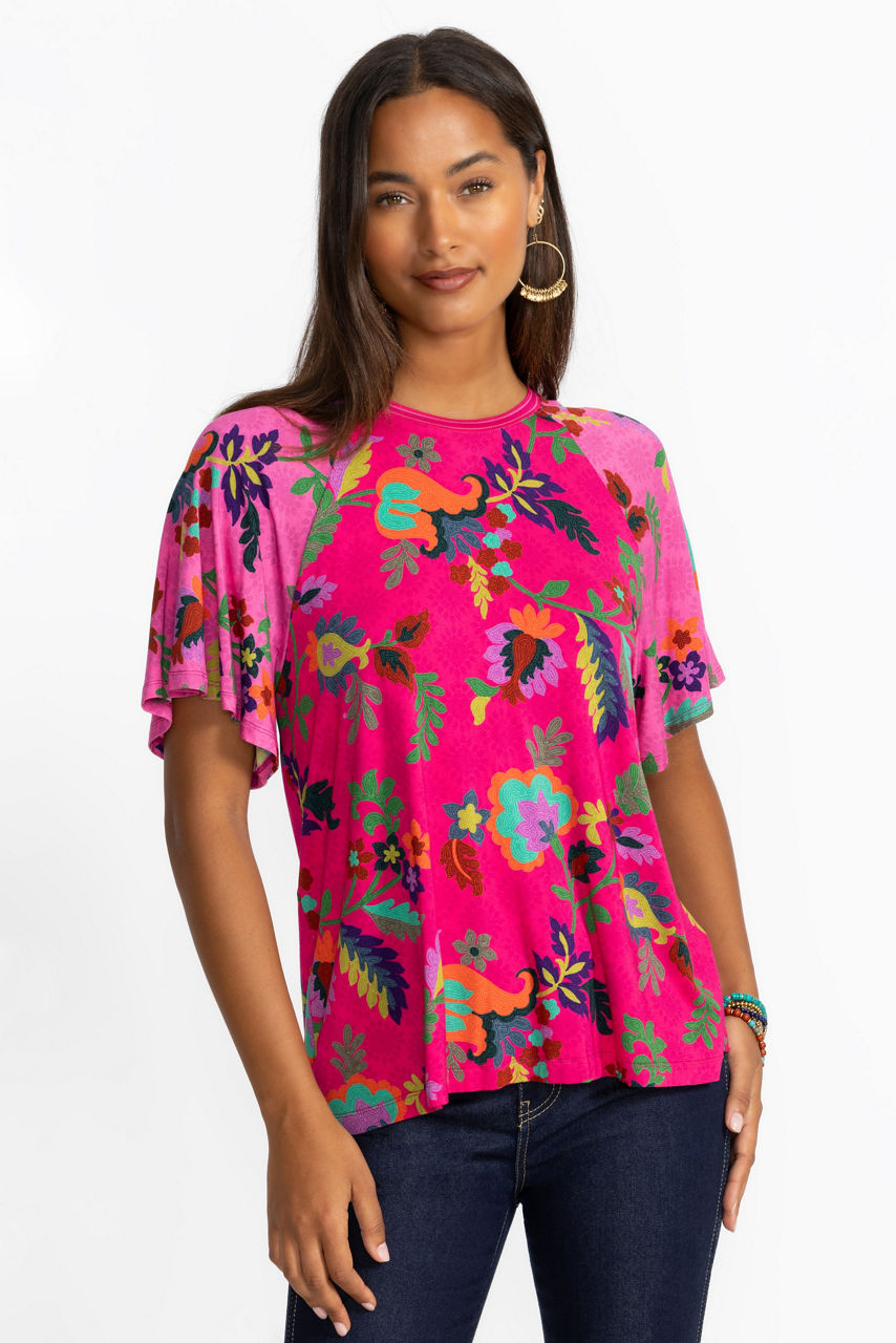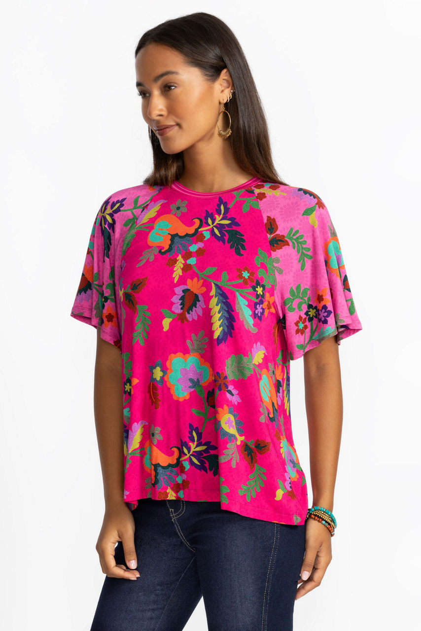 Washed in rich color and a bold floral pattern, the Janie Favorite Flutter Raglan Sleeve Top adds a pop of color to any look. Designed with a crew neckline and flutter sleeves, this Raglan style top offers a loose fit that drapes easily across the body. Pair with skinny jeans and trendy ankle boots for a fun girls' night out.