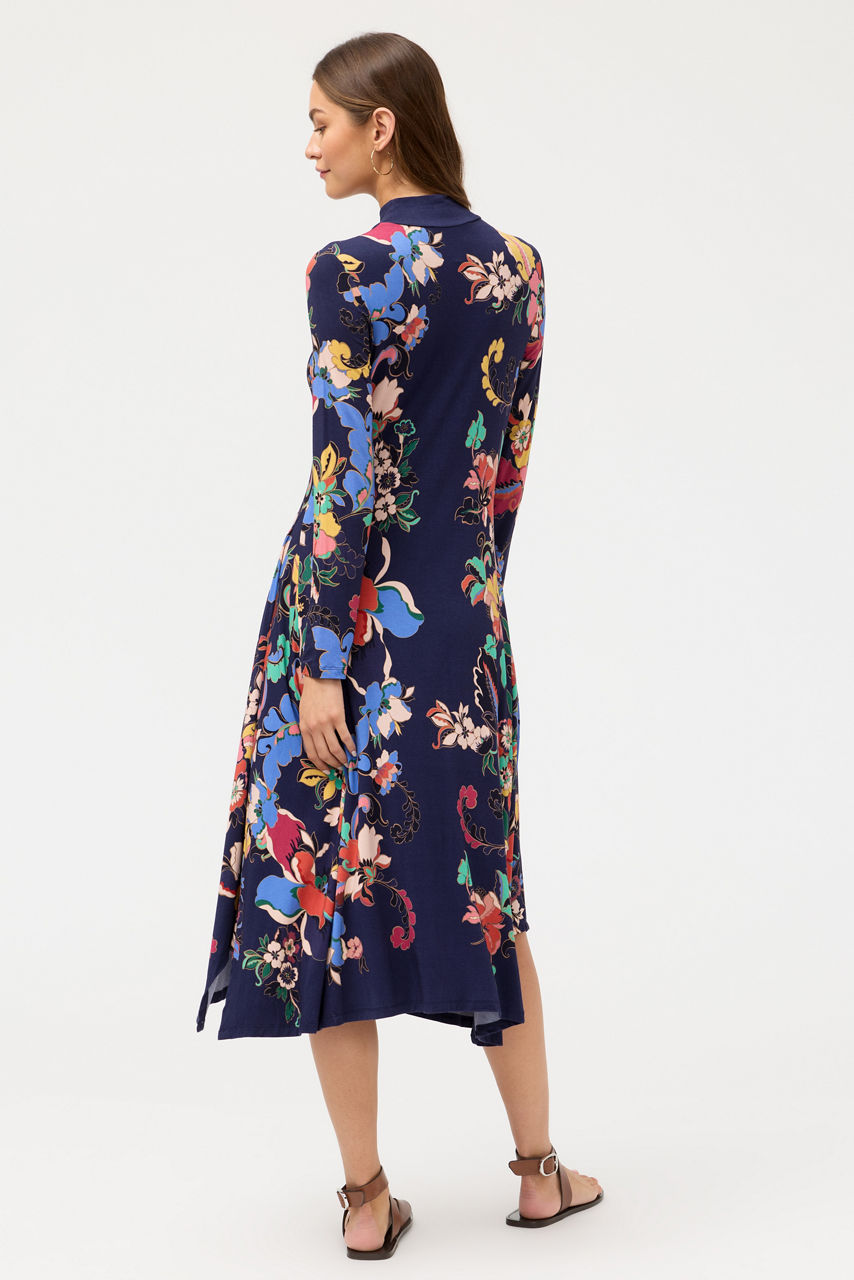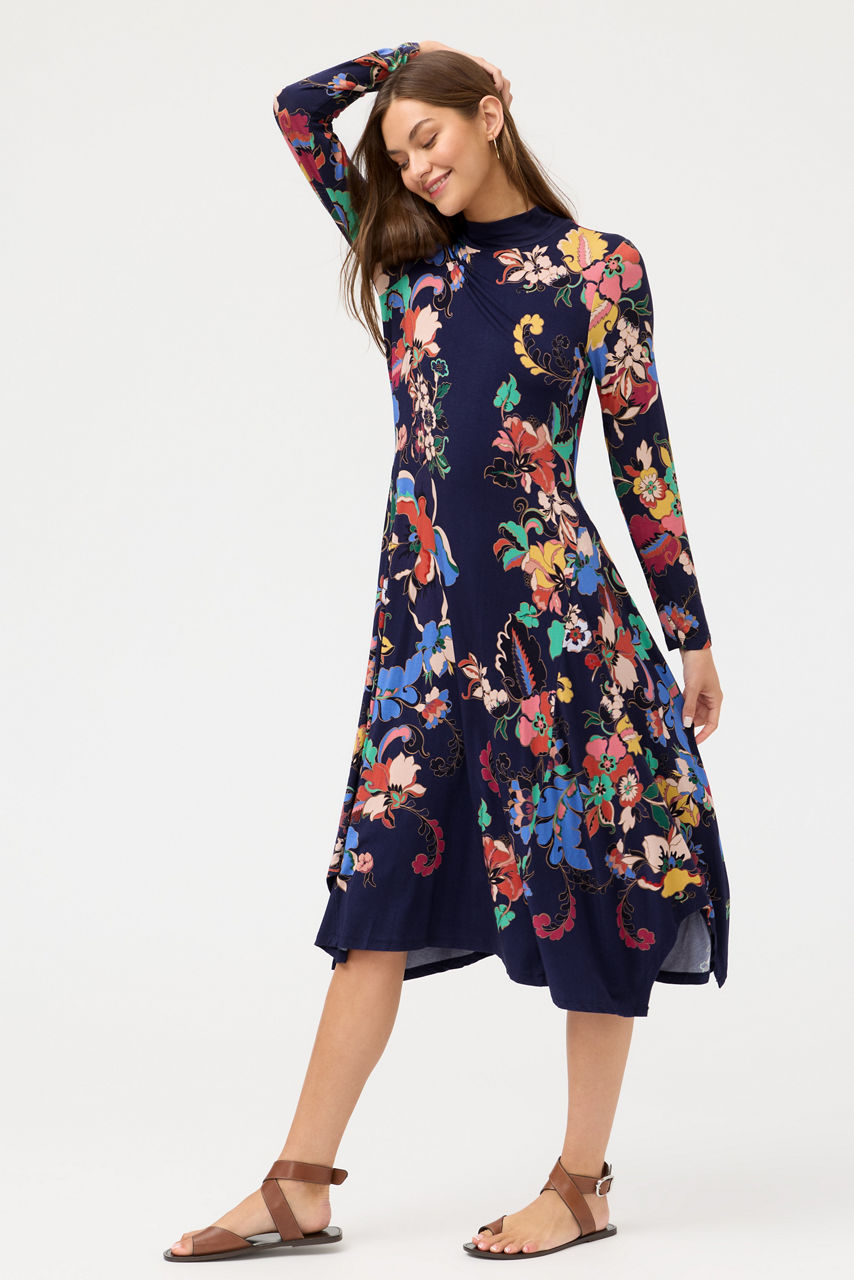 Beautifully crafted from a lightweight fabric with a hint of stretch, the Janie Favorite Handkerchief Hem Mock Neck Dress is embellished with a vibrant floral motif in bold colors. Featuring a mock neck and long sleeves, this unique dress is finished with a handkerchief hemline that moves as you do. Pair with coordinating flats and glittering silver jewelry accents for a polished dinner look.