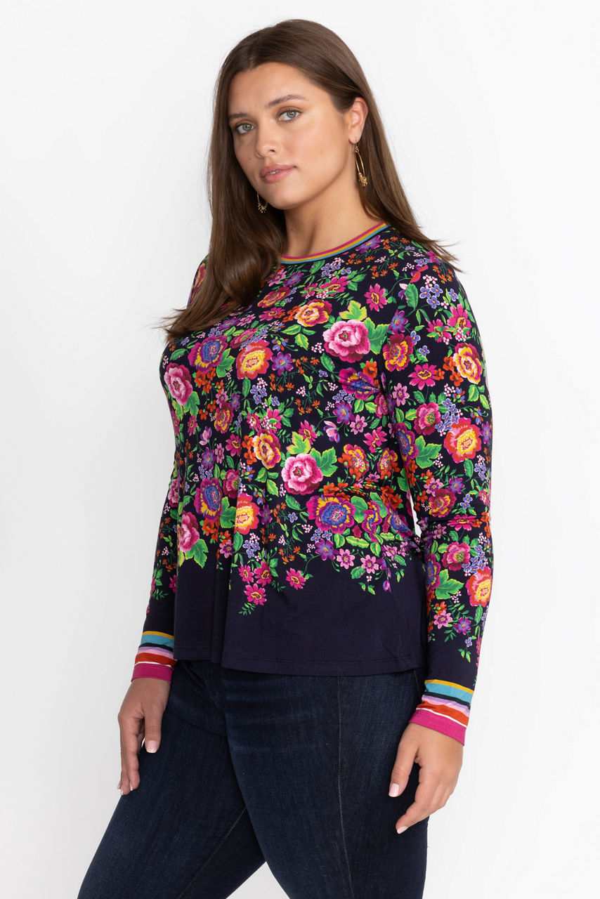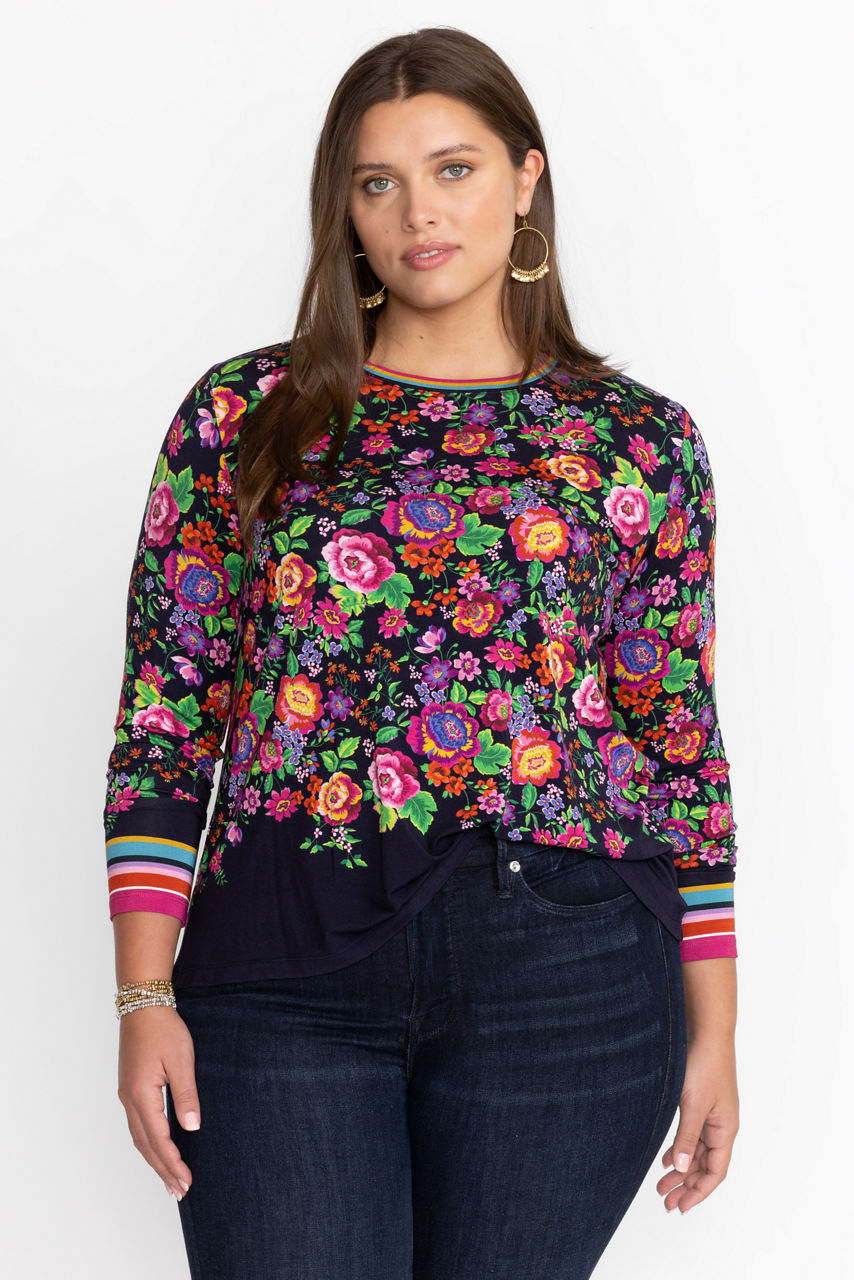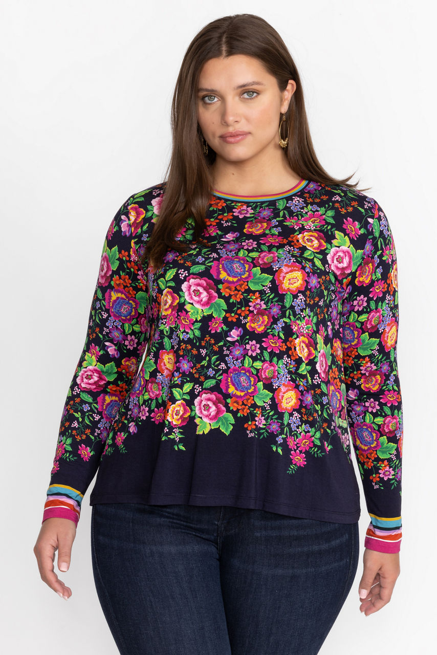 An unexpected interplay of patterns and tones, the Janie Favorite Long Sleeve Crew Neck Tee puts a refreshing spin on a timeless wardrobe basic. Made from rayon with a touch of stretch, this tee features a crew neck and a captivating mix of florals and monochrome patterns. Style with denim for a laid-back daytime outfit that can be worn year-round.