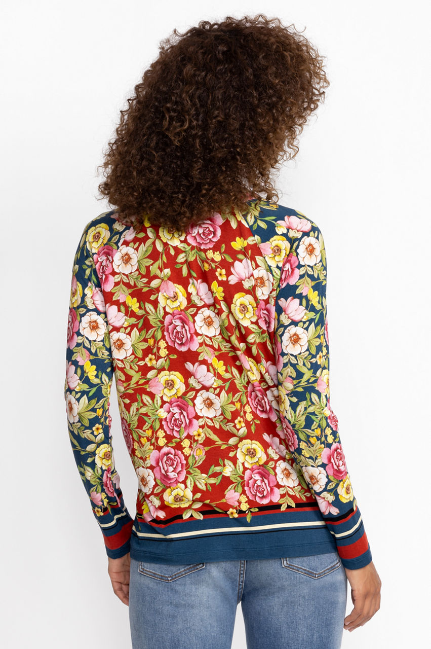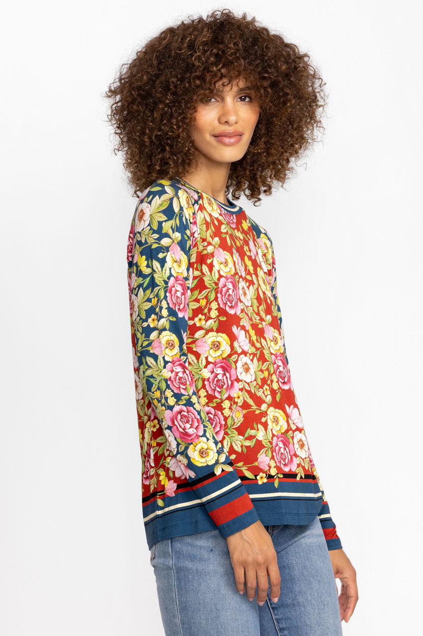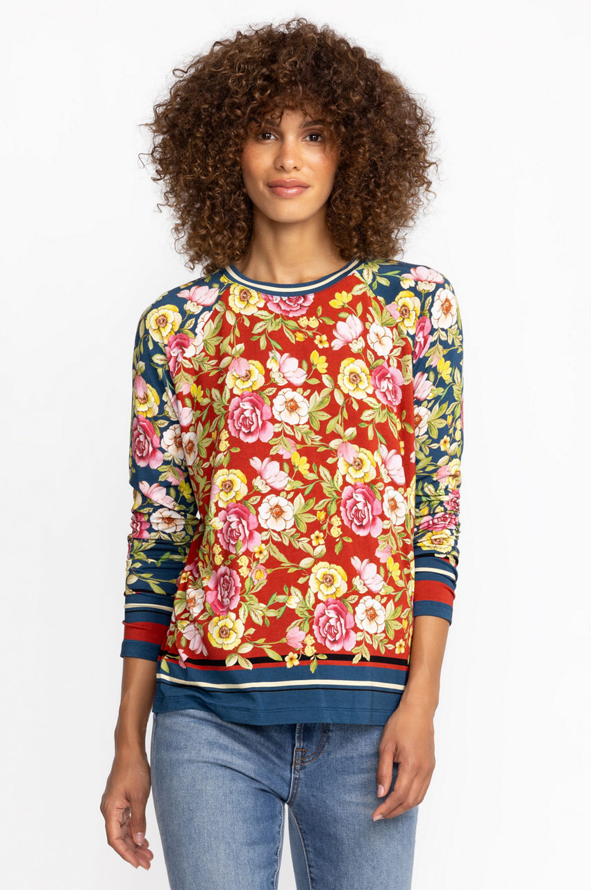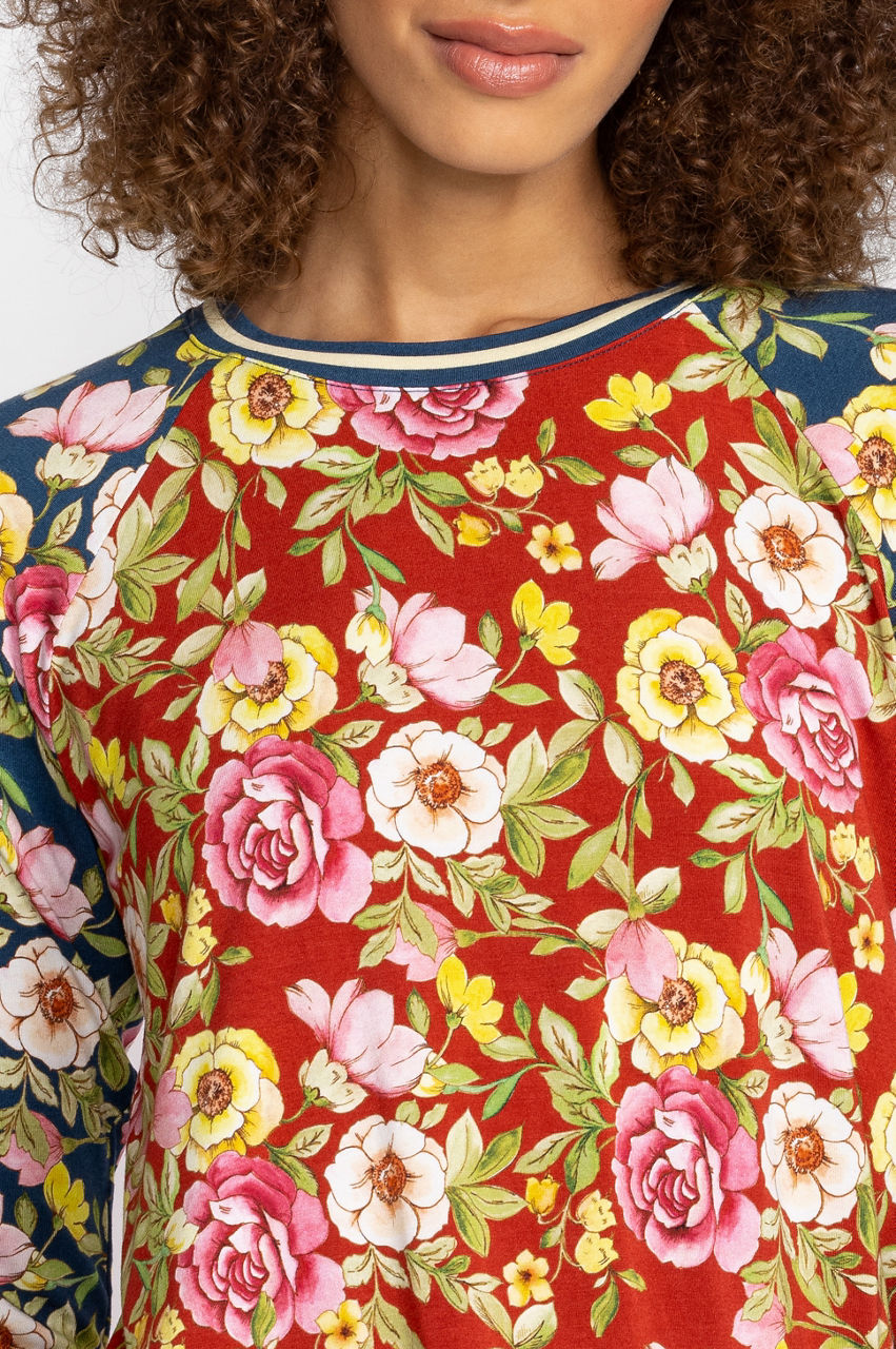 Equal parts sporty and stylish, the Ortega Slim Raglan Tee redefines a perennial wardrobe staple. Designed from a comfortable fabric with added stretch, this tee features a round neck, long sleeves, bold florals in green and pink shades, and stripes at the edges. Wear this tee with joggers or dress up with wide leg pants.