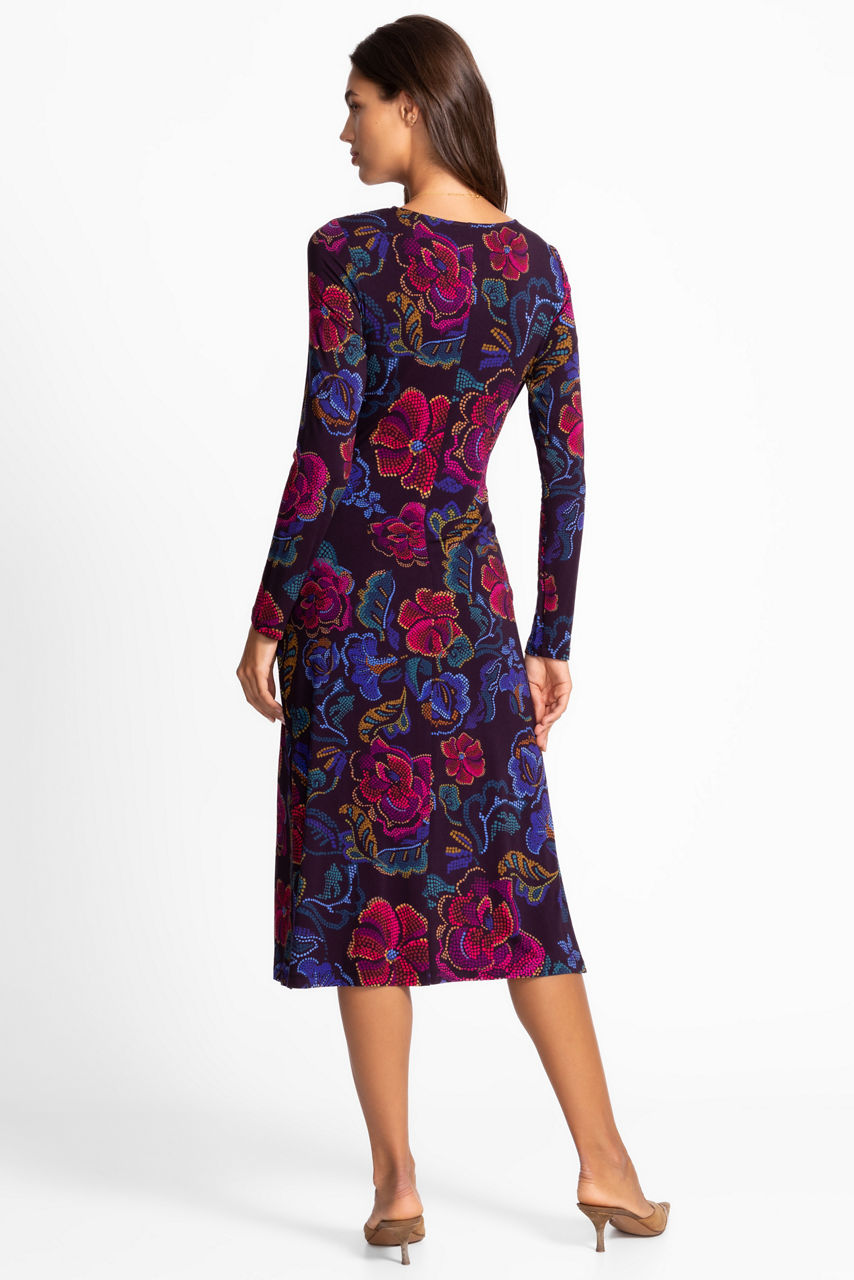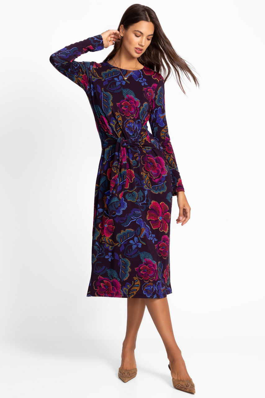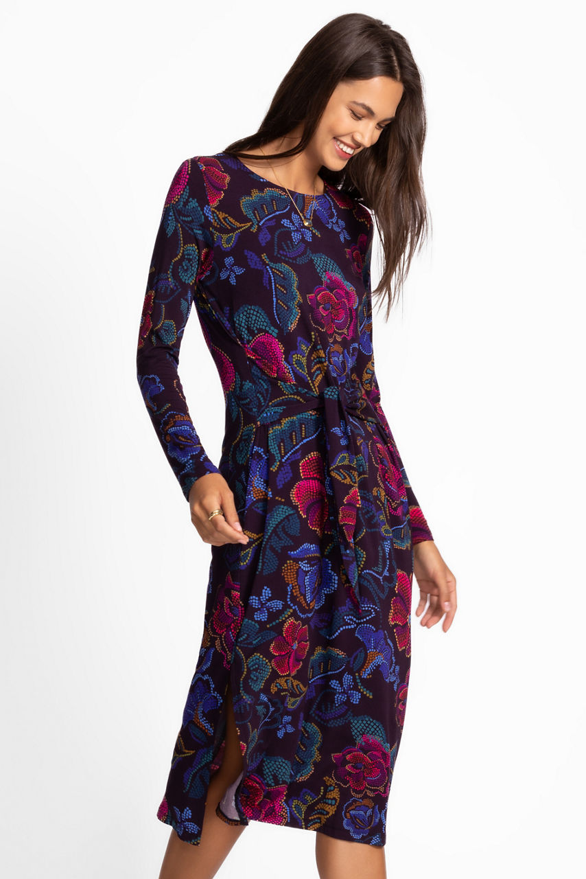 Embellished with brilliant hues of blue and purple, the Janie Favorite Long Sleeve Tie Front Knit Dress is adorned with a bold floral pattern. Designed with a crew neckline and long sleeves, this lightweight dress is finished with a tie-front detail that accents the waist. Pair with vibrant heels and an elegant clutch for a night out.