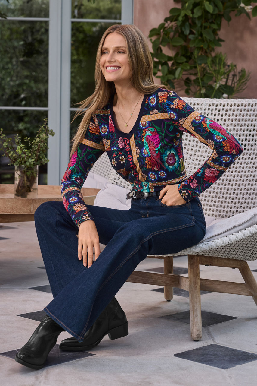 Crafted from a versatile and comfortable blend fabric, the Janie Favorite Long Sleeve V-Neck Tee is an effortless style for cooler days. Featuring an open V-neckline and straight hem, this versatile tee is destined to become a go-to in your wardrobe. Pair with a denim skirt and cozy cardigan for winning casual look.