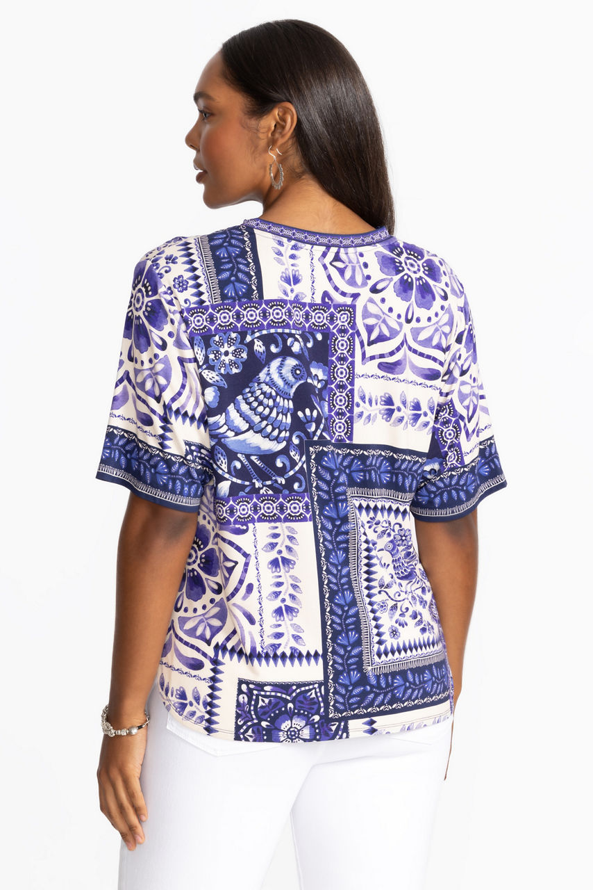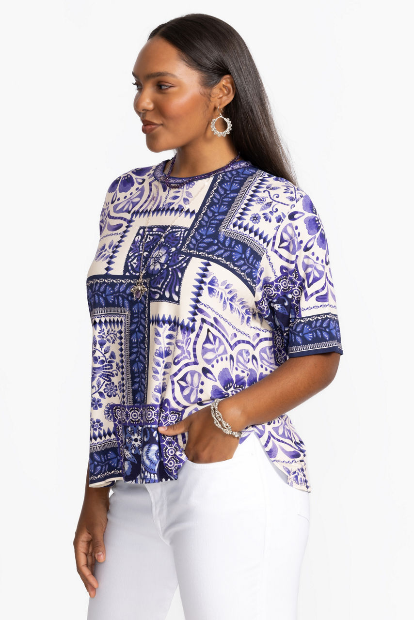 Emanating a relaxed vibe, the Janie Favorite Oversized Cropped Tee is a versatile choice for off-duty days and weekend pursuits. Cut in a roomy fit, this tee is made from bamboo with added stretch for comfort and features a round neck, short sleeves, and a hypnotic floral pattern in various blue shades. pair with shorts or pair with jeans for a versatile wear-anywhere look.