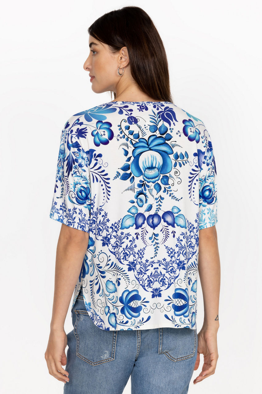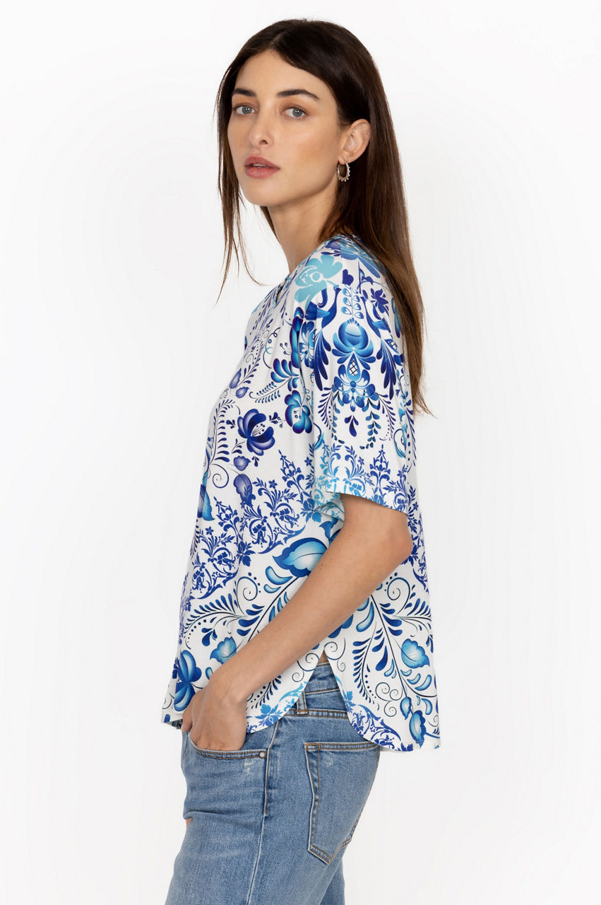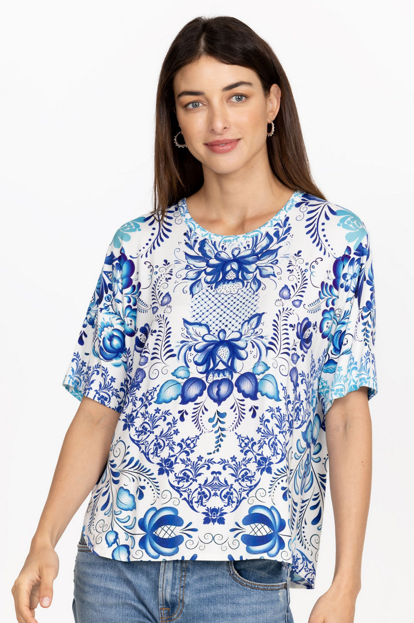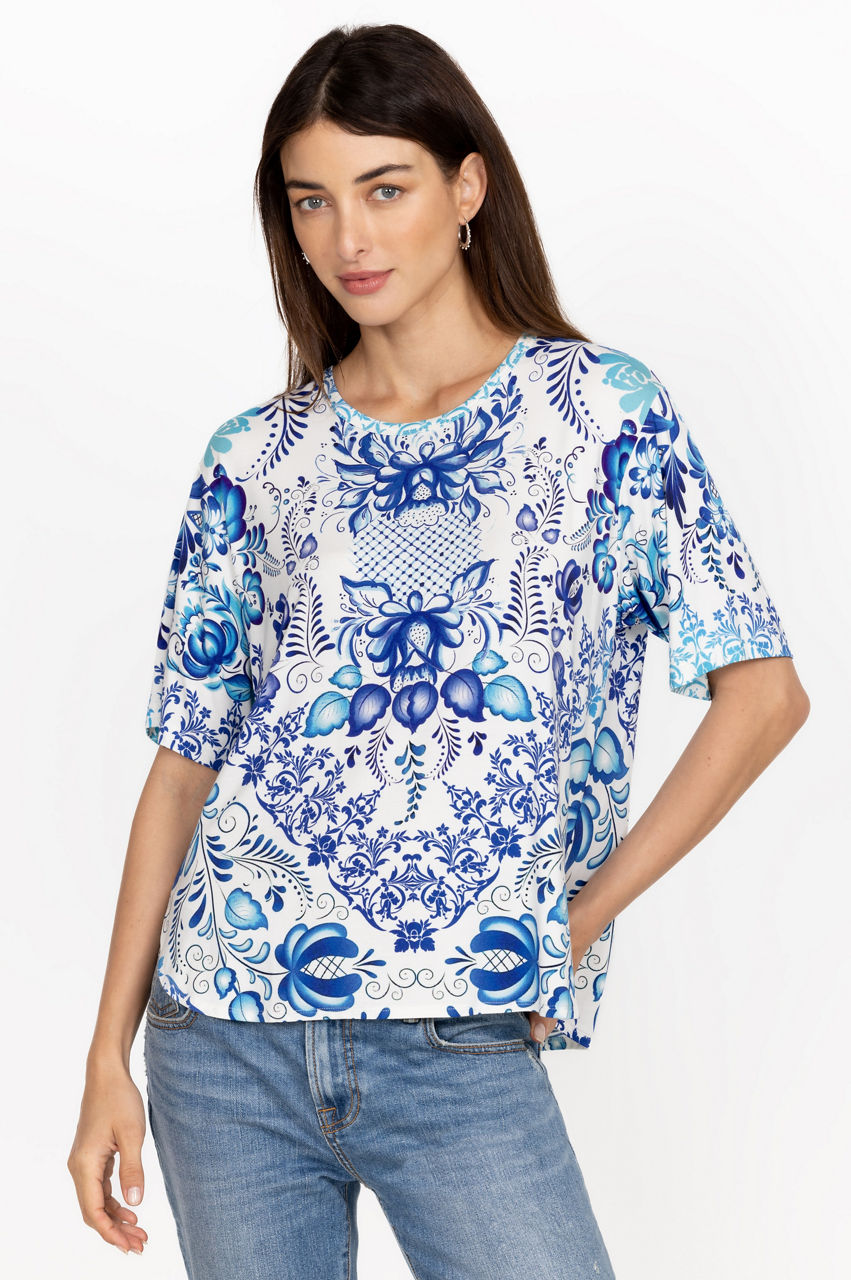 Emanating a relaxed vibe, the Janie Favorite Oversized Cropped Tee is a versatile choice for off-duty days and weekend pursuits. Cut in a roomy fit, this tee is made from bamboo with added stretch for comfort and features a round neck, short sleeves, and a hypnotic floral pattern in various blue shades. pair with shorts or pair with jeans for a versatile wear-anywhere look.