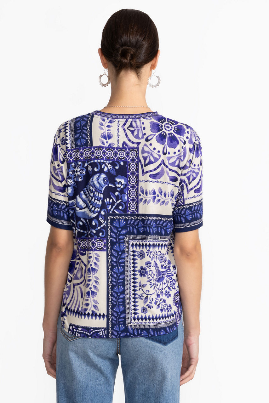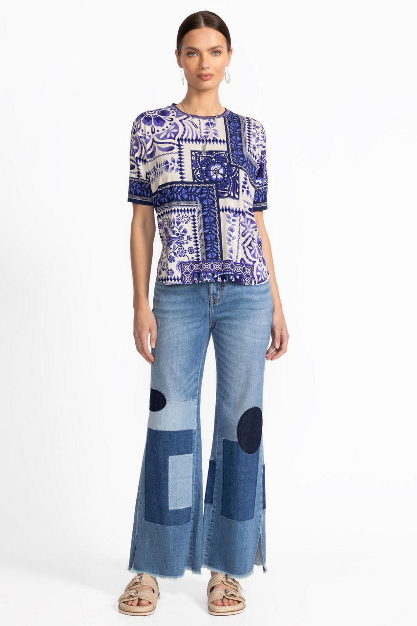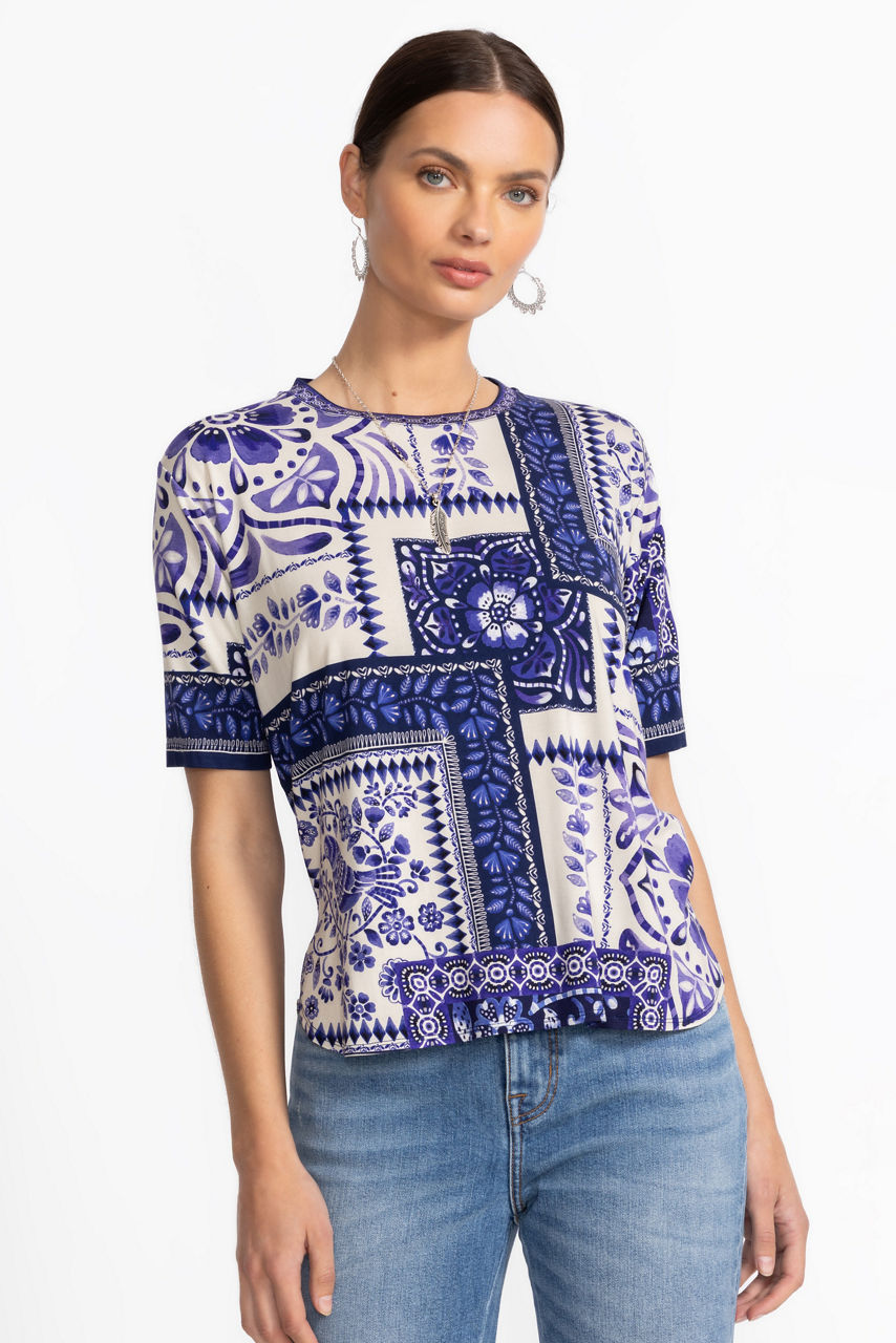 Emanating a relaxed vibe, the Janie Favorite Oversized Cropped Tee is a versatile choice for off-duty days and weekend pursuits. Cut in a roomy fit, this tee is made from bamboo with added stretch for comfort and features a round neck, short sleeves, and a hypnotic floral pattern in various blue shades. pair with shorts or pair with jeans for a versatile wear-anywhere look.