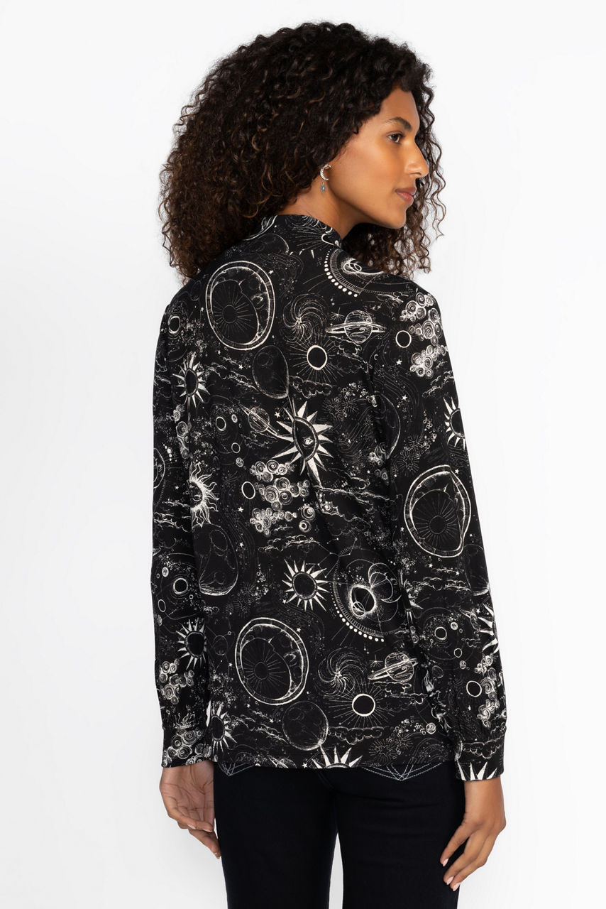 Casual dressing with a hint of drama, the Janie Favorite Puff Sleeve Mock Neck is adorned with celestial imagery from the night sky. Featuring a mock neck and billowing bishop sleeves, this lightweight top is finished with slits at the sides. Pair with a skirt and silvery jewelry for a polished casual feel.
