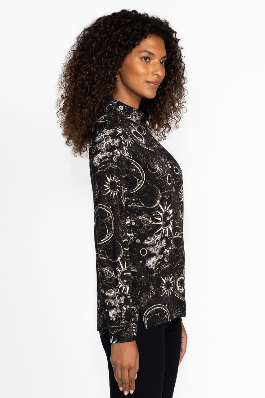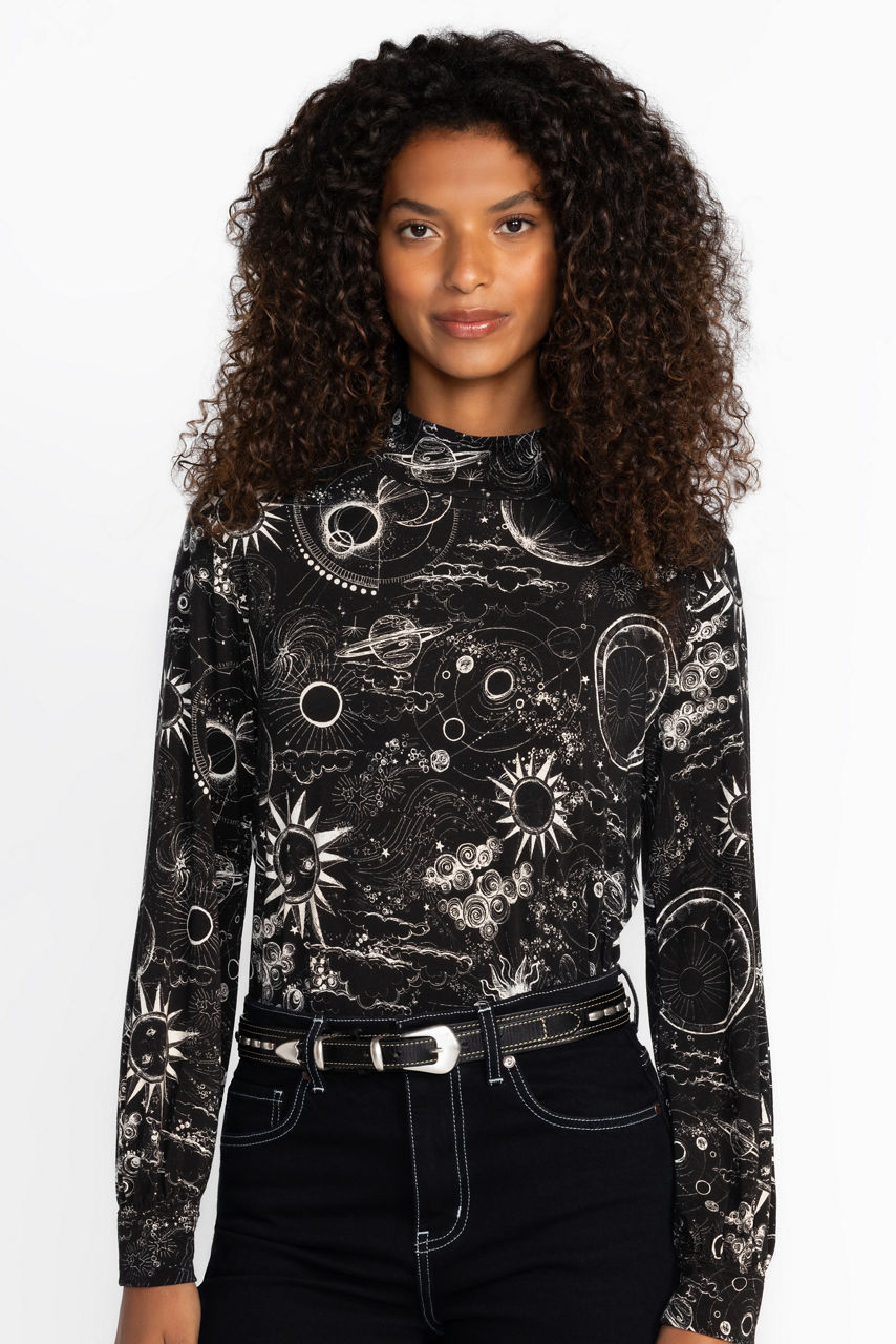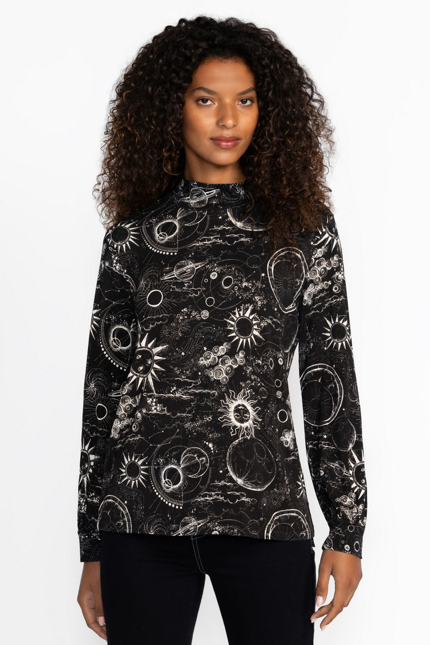Casual dressing with a hint of drama, the Janie Favorite Puff Sleeve Mock Neck is adorned with celestial imagery from the night sky. Featuring a mock neck and billowing bishop sleeves, this lightweight top is finished with slits at the sides. Pair with a skirt and silvery jewelry for a polished casual feel.