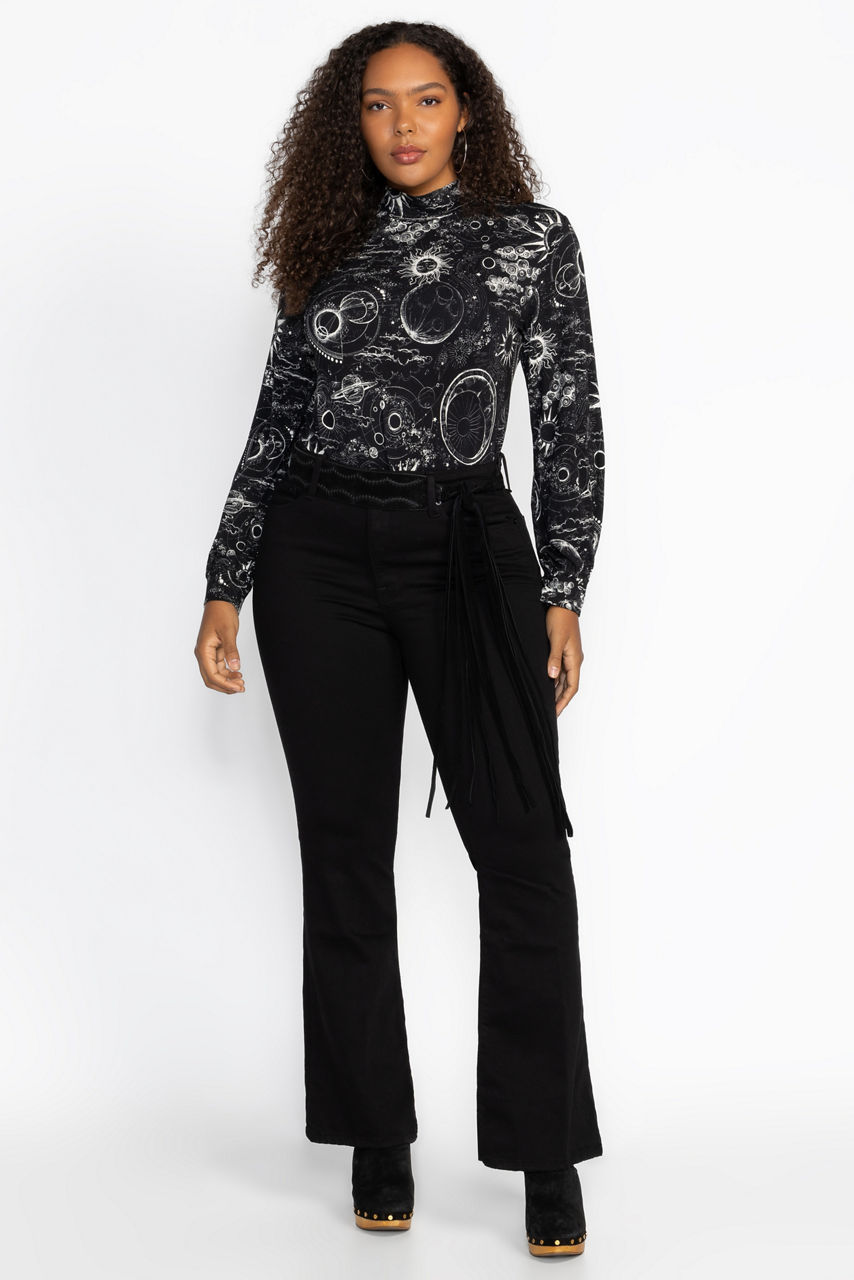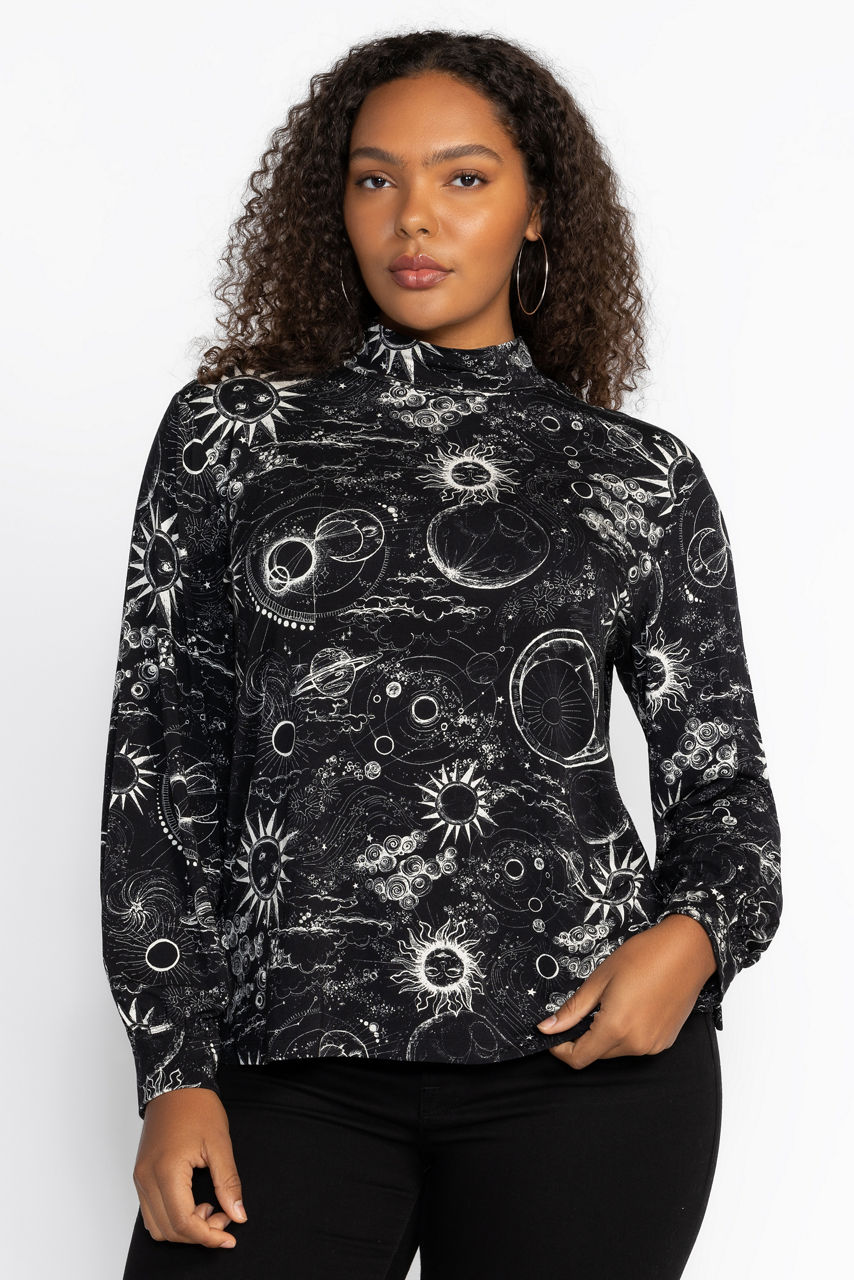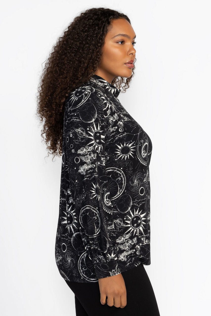 Casual dressing with a hint of drama, the Janie Favorite Puff Sleeve Mock Neck is adorned with celestial imagery from the night sky. Featuring a mock neck and billowing bishop sleeves, this lightweight top is finished with slits at the sides. Pair with a skirt and silvery jewelry for a polished casual feel.