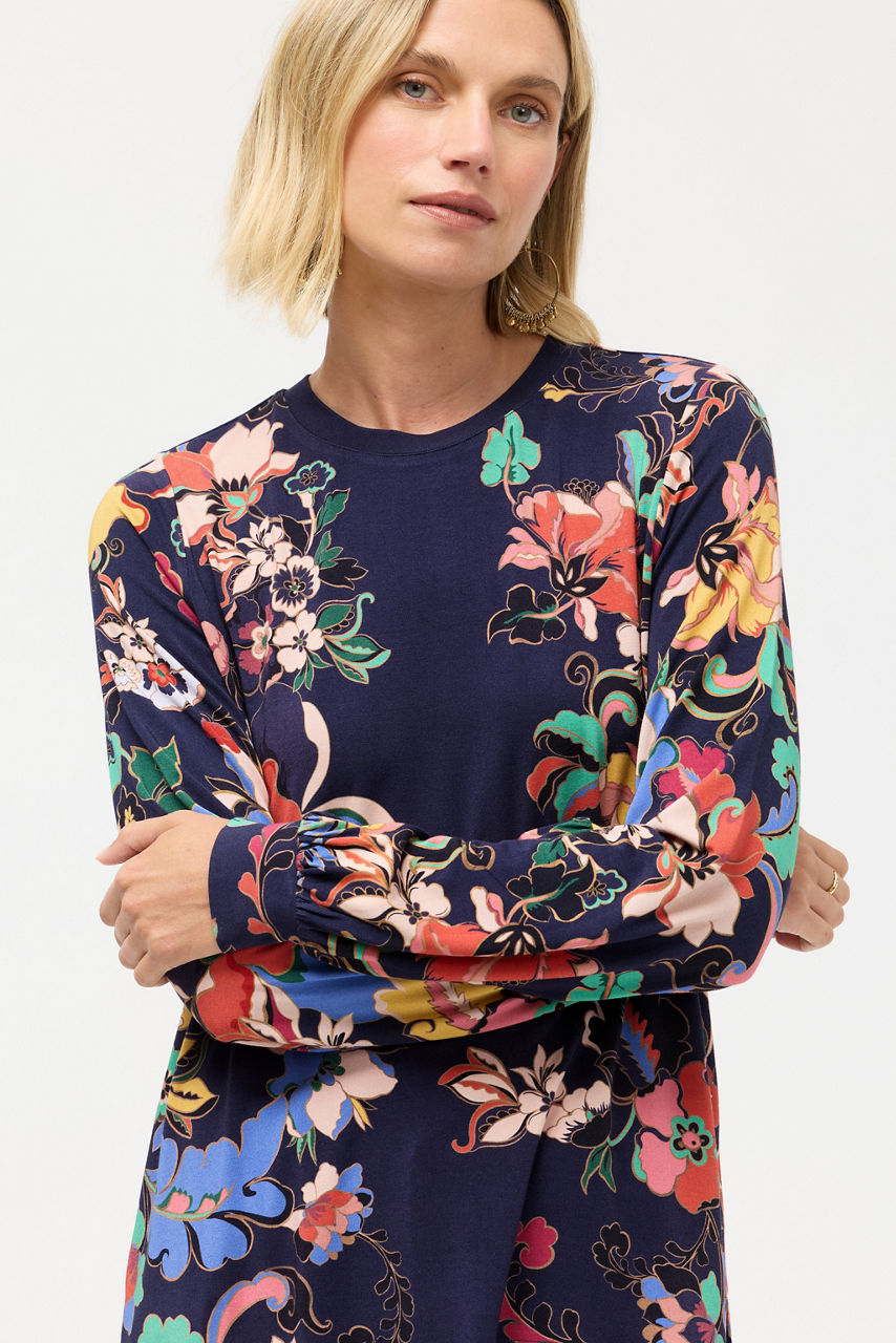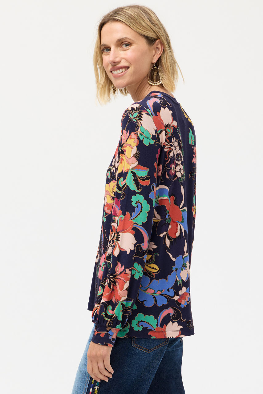 Thoughtfully embellished with a series of vibrant blooms, the Janie Favorite Puff Sleeve Mock Neck offers both casual comfort and elevated style. Designed with a mock neck and gently puffed sleeves, this colorful blouse is finished with a straight hemline. Pair with a skirt and wedge heels for a girls' night out.