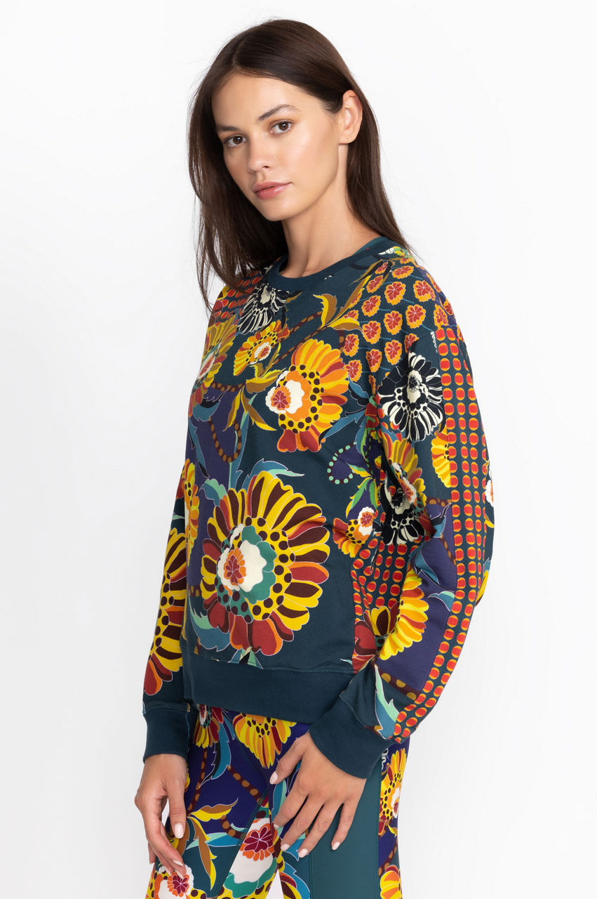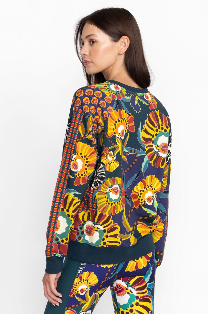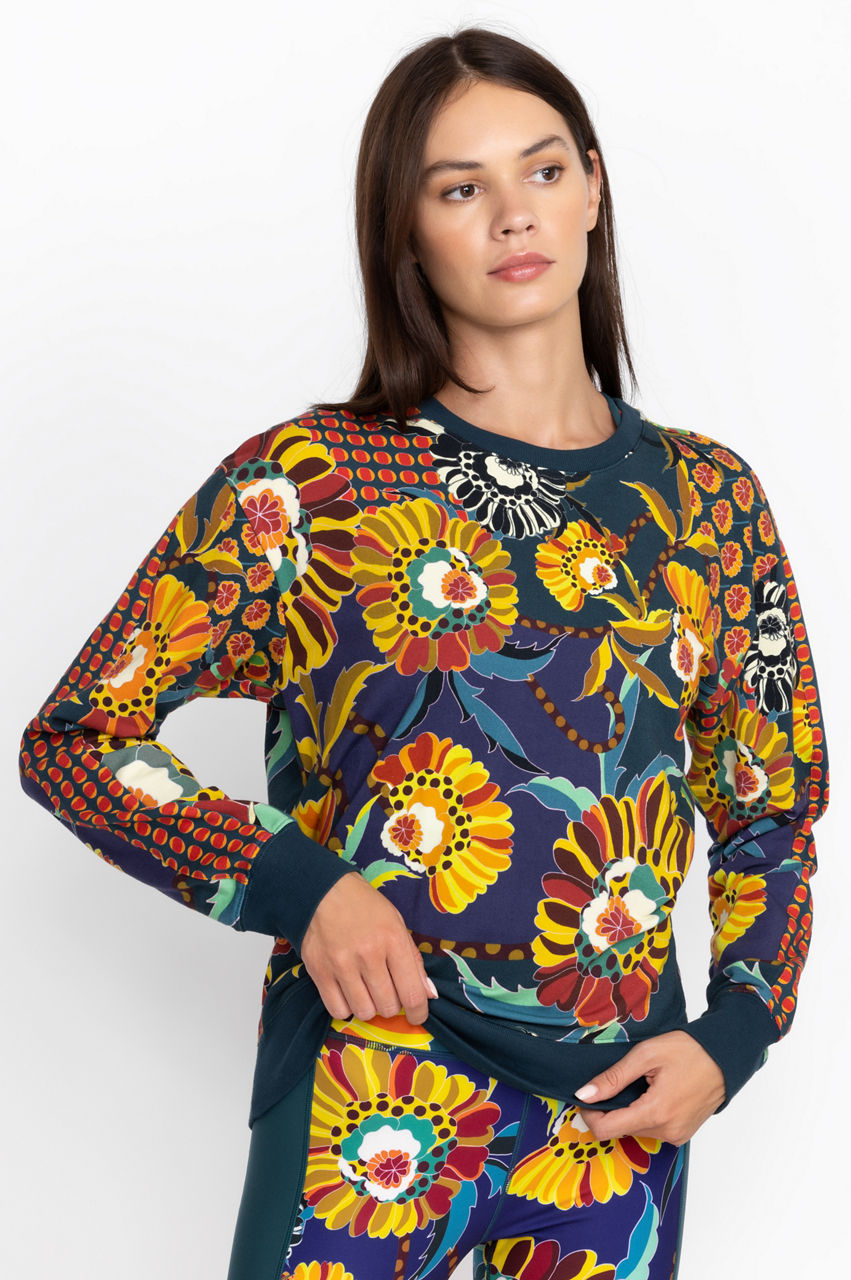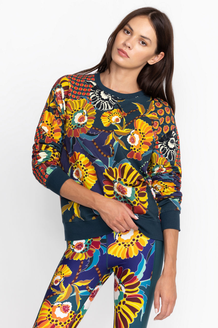 Introduce a dose of leisurely glamour to your wardrobe with the Kimbra Relaxed Sweatshirt. A feminine take on a sporty icon, this sweatshirt is made from pure cotton with a touch of stretch and features a round neck, long sleeves, ribbed edges, and an eccentric floral pattern. Style this sweatshirt with joggers or throw on with a pair of jeans and sneakers outside the house.