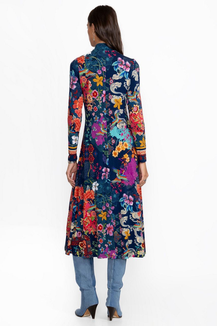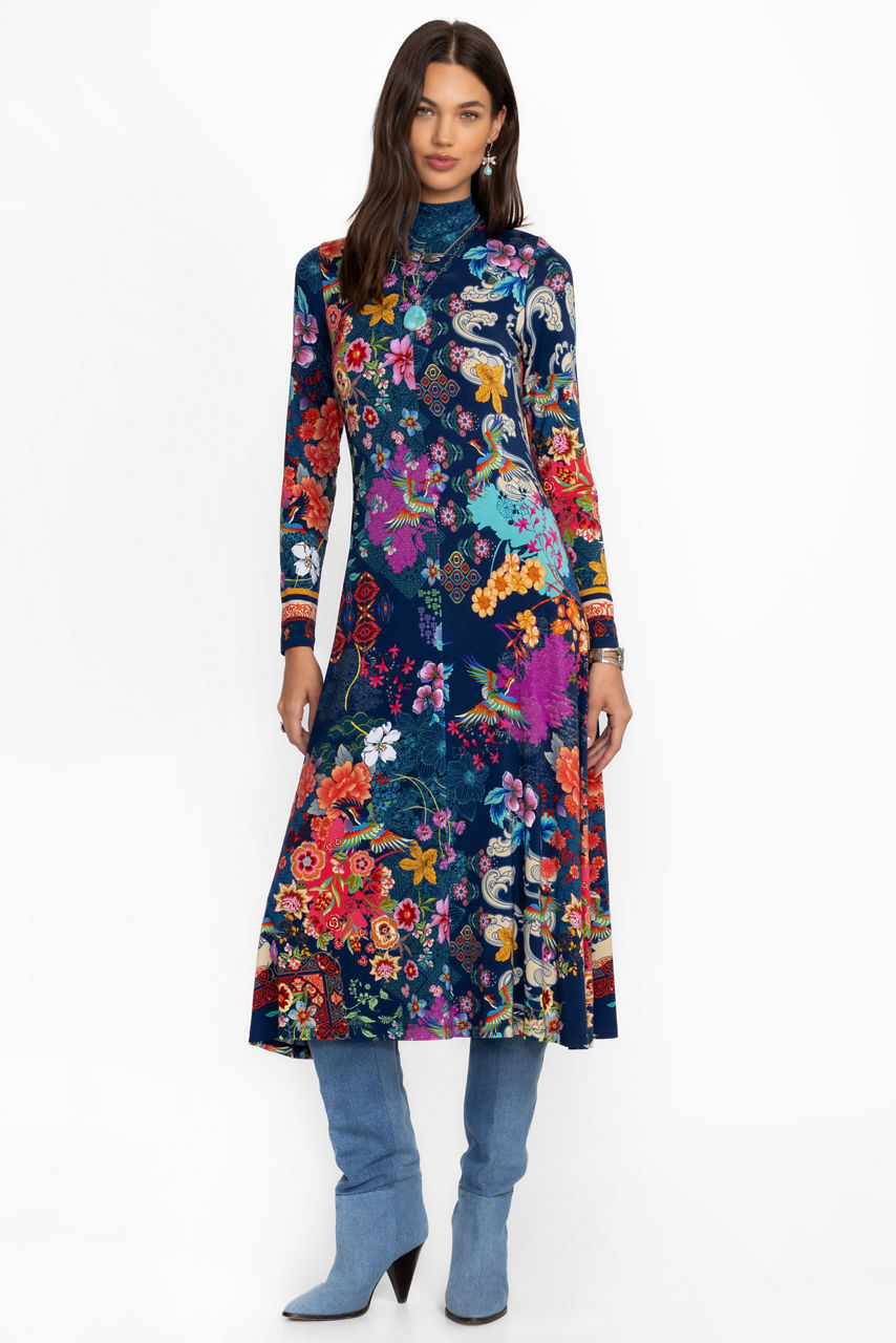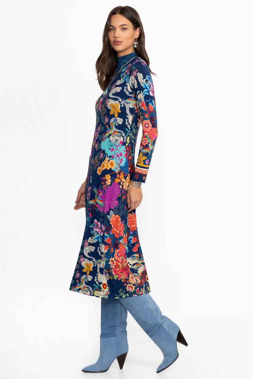 Embellished with bold floral blooms on a rich blue backdrop, the Janie Favorite Seamed Mock Neck Dress perfectly combines casual comfort and elevated style. Featuring a mock turtleneck and long sleeves, this pullover dress features seaming detail for added texture and definition. Pair with strappy heels and colorful jewelry for a polished brunch look.