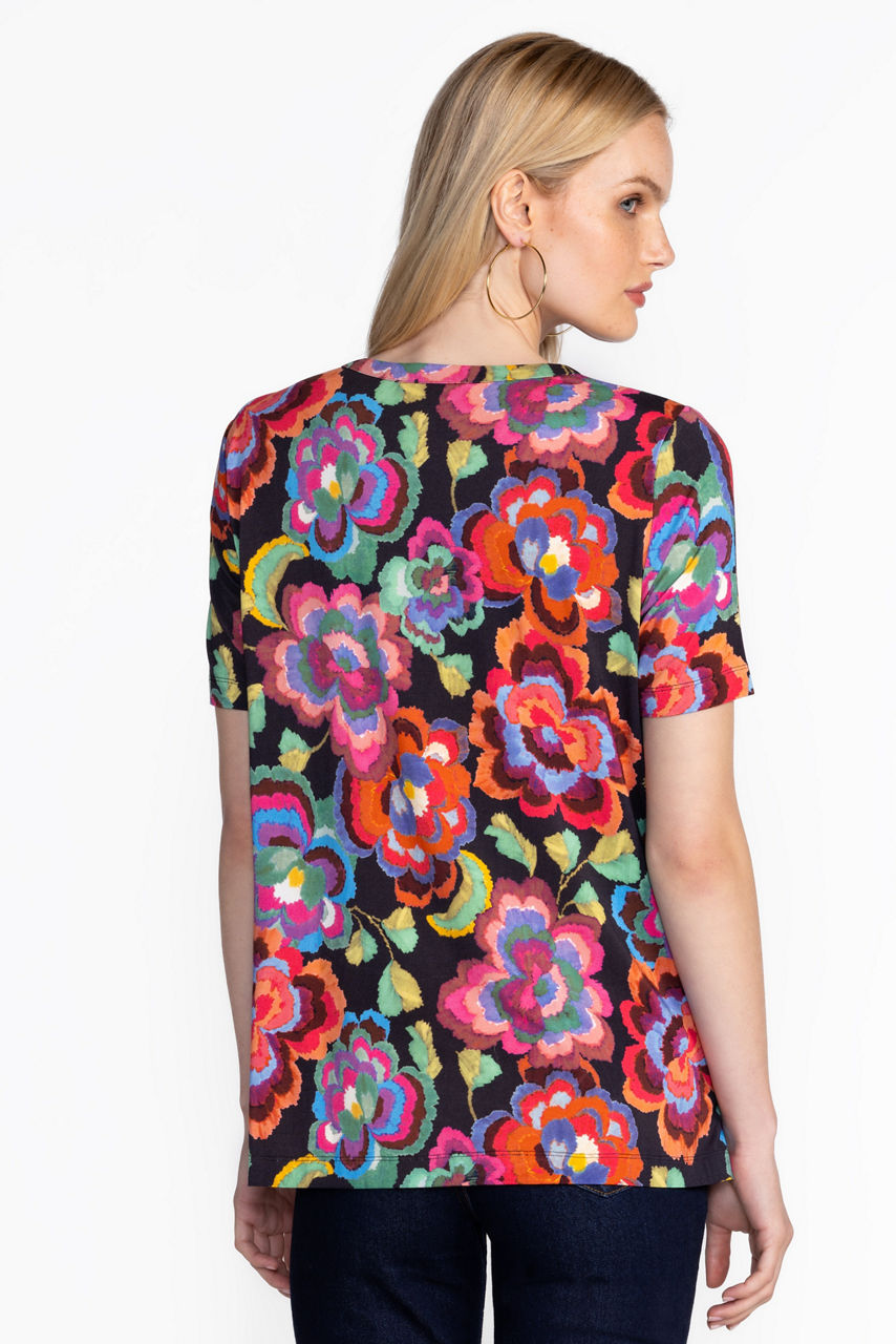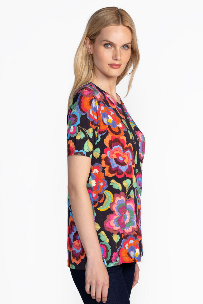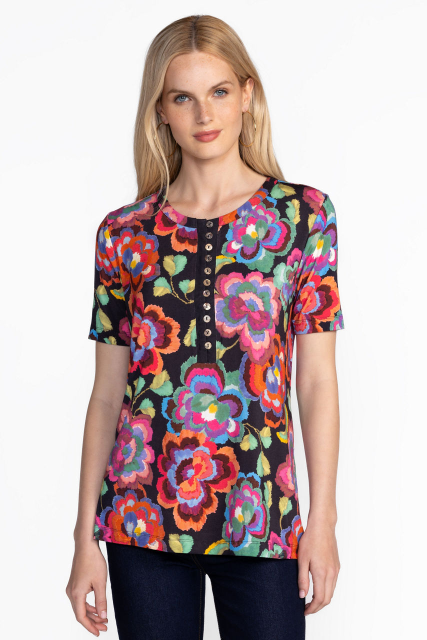 Adorned with bold colorful florals, the Janie Favorite Short Sleeve Button Henley Tee is crafted from a lightweight fabric with a hint of stretch. Featuring a classic Henley neckline and short sleeves, this tee offers a relaxed fit complete with side slits at the hemline. Pair with boyfriend jeans and fashion sneakers for a fresh weekend look.