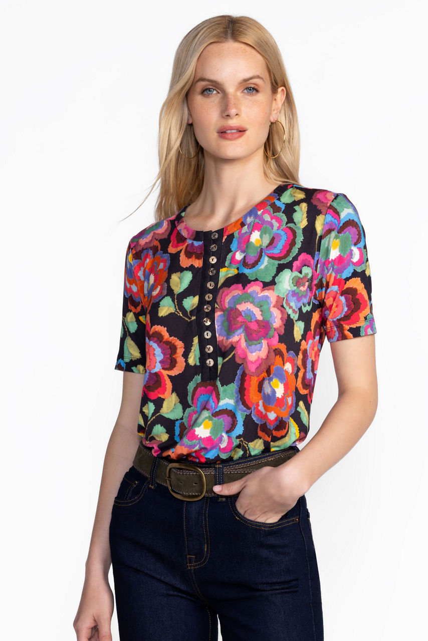 Adorned with bold colorful florals, the Janie Favorite Short Sleeve Button Henley Tee is crafted from a lightweight fabric with a hint of stretch. Featuring a classic Henley neckline and short sleeves, this tee offers a relaxed fit complete with side slits at the hemline. Pair with boyfriend jeans and fashion sneakers for a fresh weekend look.