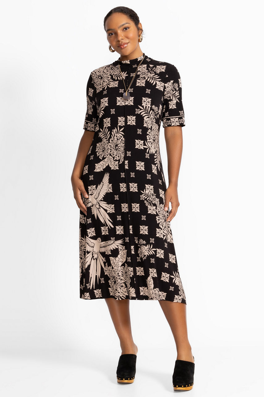 Designed with a distinctly feminine silhouette, the Janie Favorite Short Sleeve Seamed Mock Neck Dress is embellished with a stunning contrasting black and white pattern. Featuring a crew neckline and short sleeves, this full-length knit dress is accented with detailed seaming. Pair with kitten heels and delicate glittering jewelry for an elegant evening out.