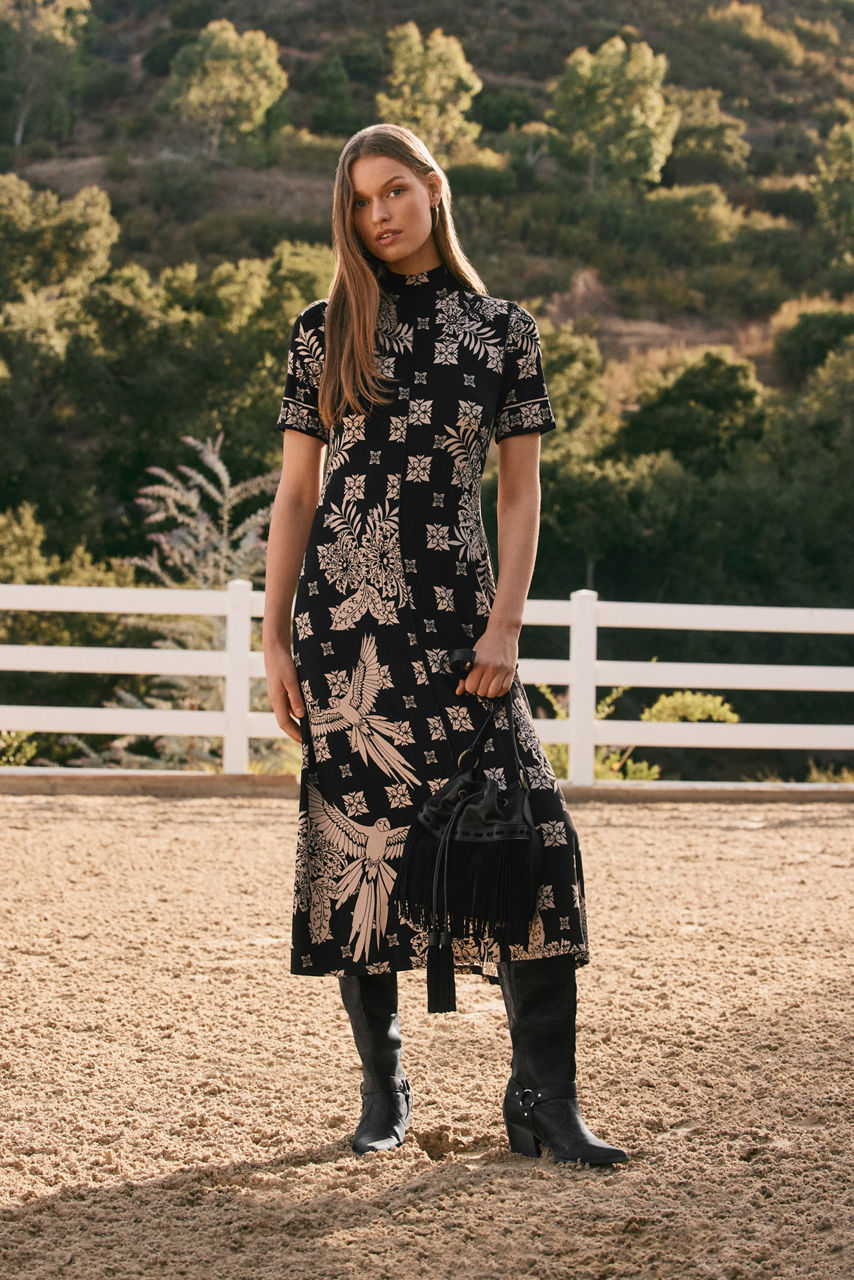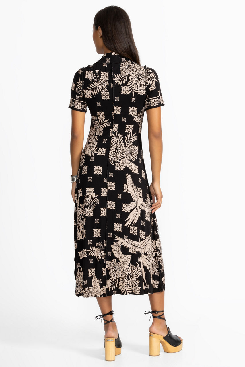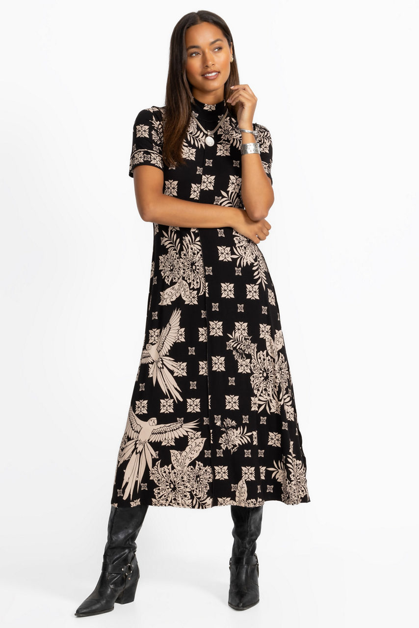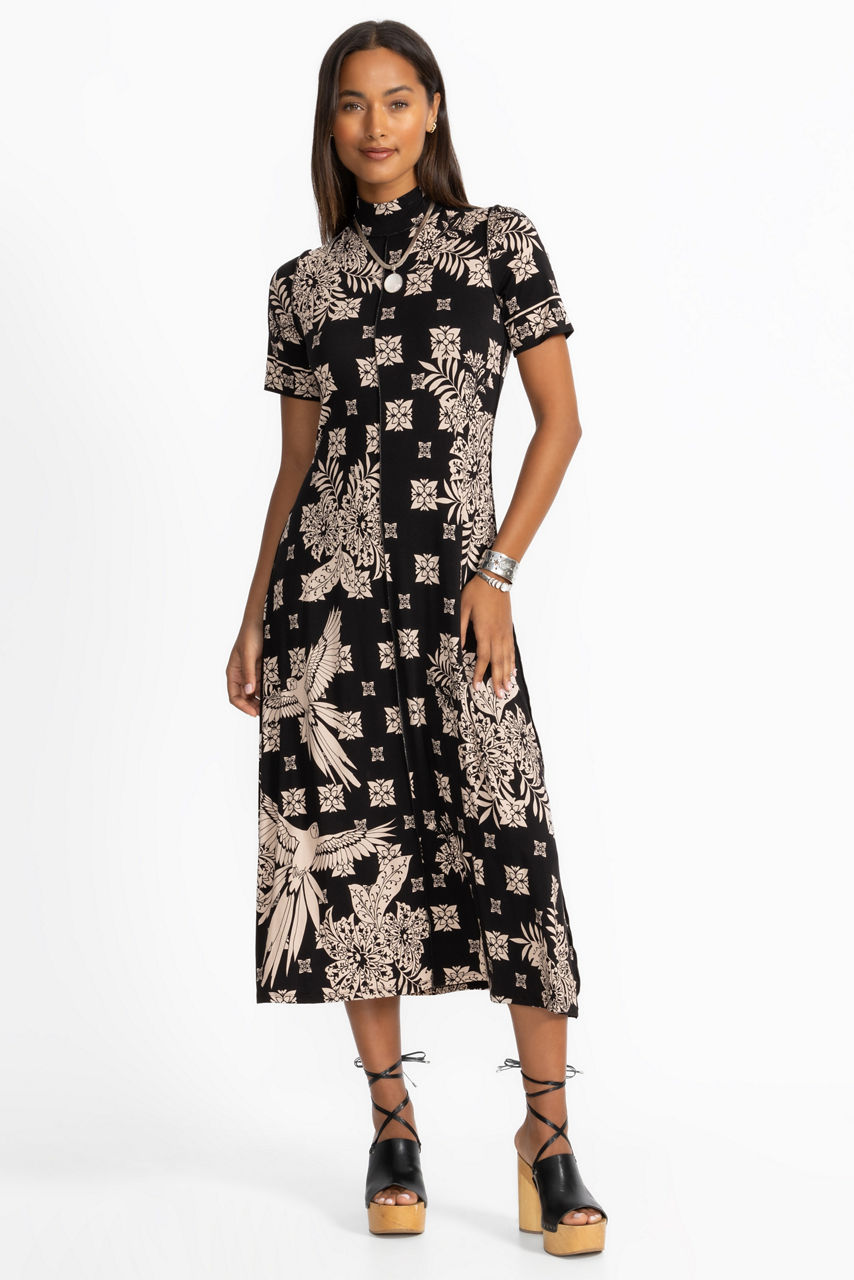Designed with a distinctly feminine silhouette, the Janie Favorite Short Sleeve Seamed Mock Neck Dress is embellished with a stunning contrasting black and white pattern. Featuring a crew neckline and short sleeves, this full-length knit dress is accented with detailed seaming. Pair with kitten heels and delicate glittering jewelry for an elegant evening out.