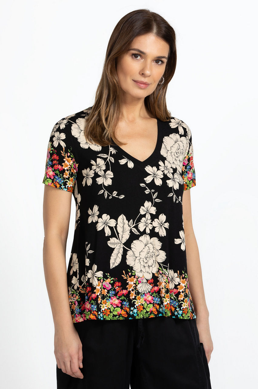 A charming take on the classic t-shirt, the Janie Favorite Short Sleeve V-Neck Swing Tee is an effortless addition to your style repertoire. Created from a comfortable blend fabric with a hint of stretch, this tee is a breezy everyday look. Wear it with relaxed chinos and slip-on sandals for a fresh casual ensemble.