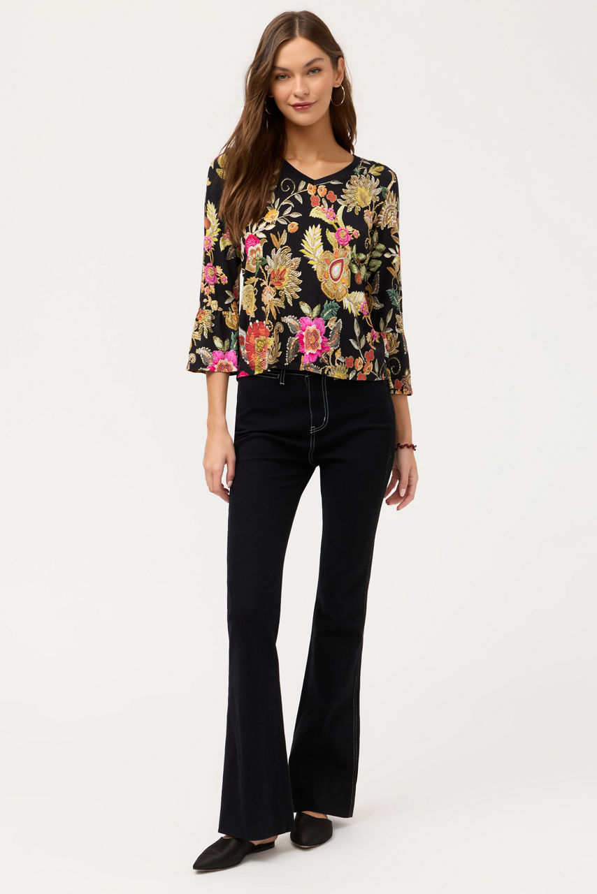 Beautifully embellished with a rich floral array, the Janie Favorite V-Neck Flute Sleeve Tee merges wearability with sophistication. Featuring a V-neckline and a relaxed bodice, this tee is accented by flutter flute sleeves for an elegant flair. Pair with classic trousers and polished flats for an elevated casual ensemble.