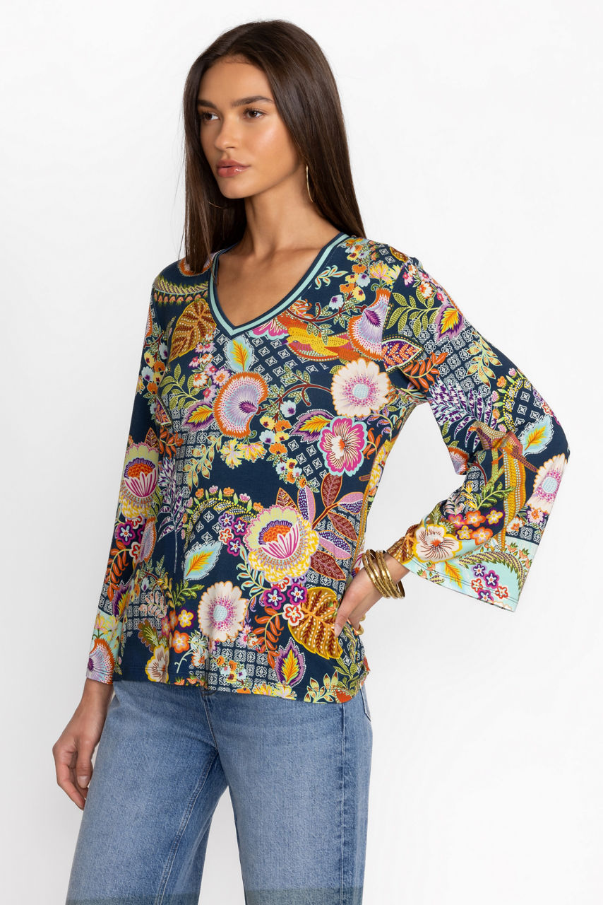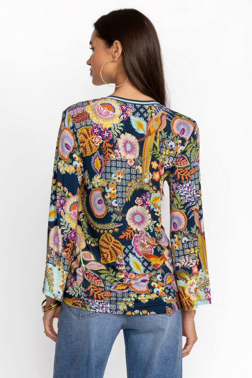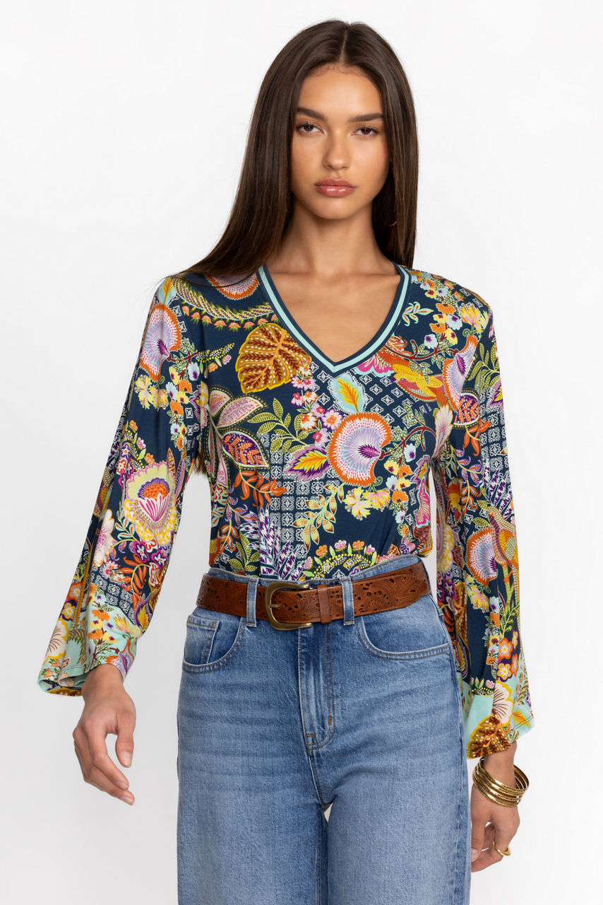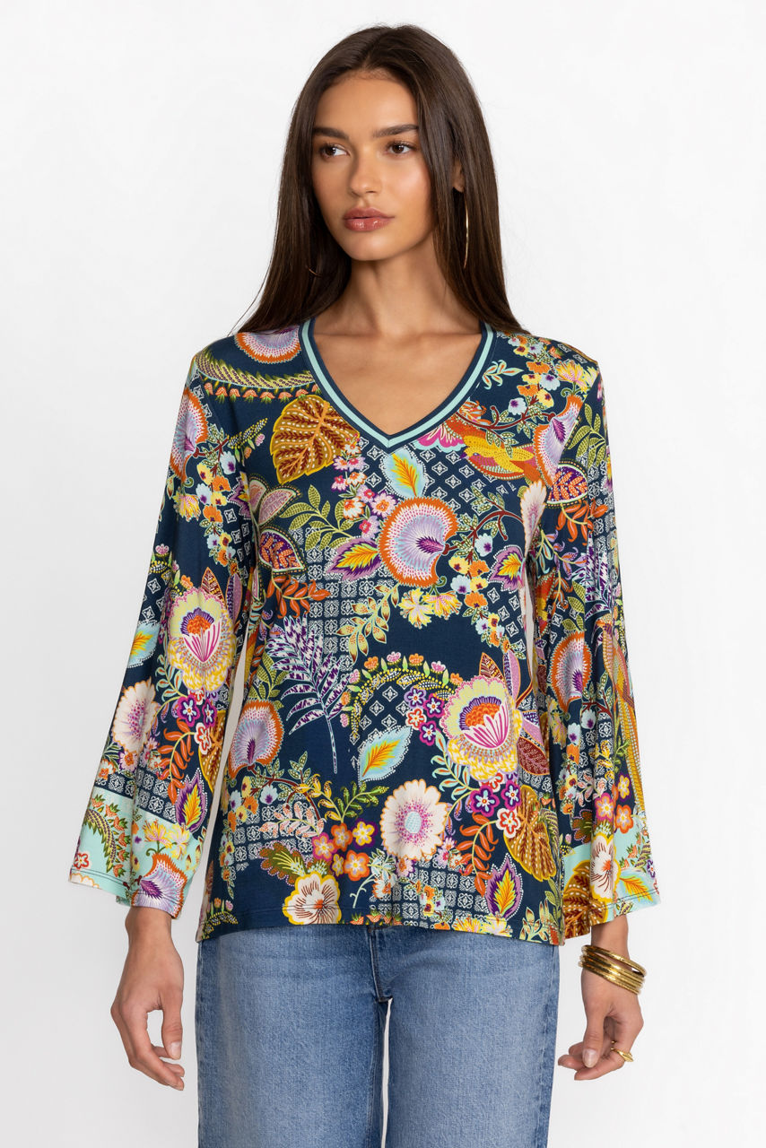 Featuring a lively kaleidoscope of color, the Wild Bird V-Neck Kimono Sleeve Tee is an elevated take on a traditional tee. Featuring an open V-neckline and generous bodice, this tee is finished with flowing kimono sleeves for the perfect combinations of style and comfort. Pair with relaxed joggers and sandals for a casual outing with friends.
