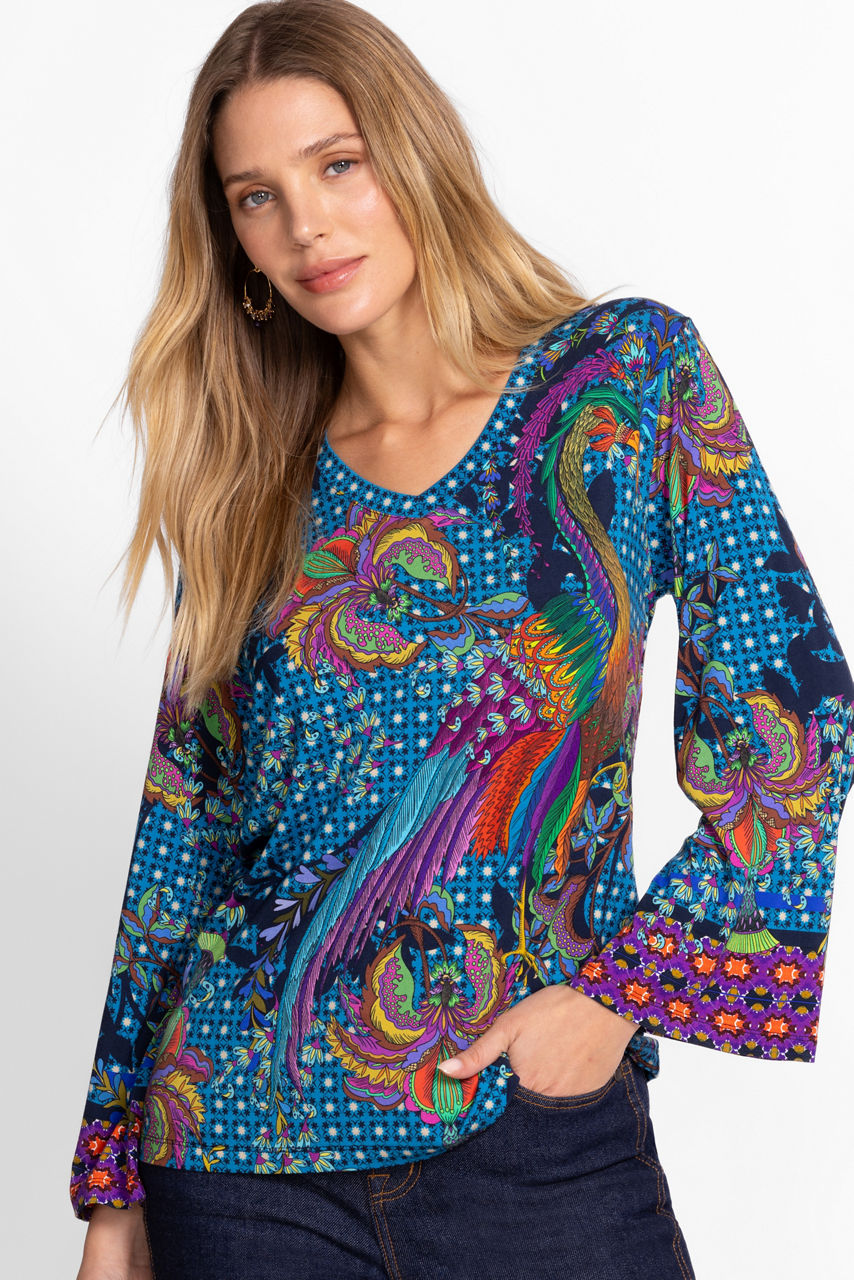 Crafted from a lightweight fabric with a hint of stretch, the Janie Favorite V-Neck Kimono Sleeve Tee is embellished with brilliant color and a bold pattern. Designed with a V-neckline and flowing kimono sleeves, this relaxed-fit tee is finished with contrasting detailing at the sleeve cuffs. Pair with denim trousers and coordinating flats for an elevated casual look.