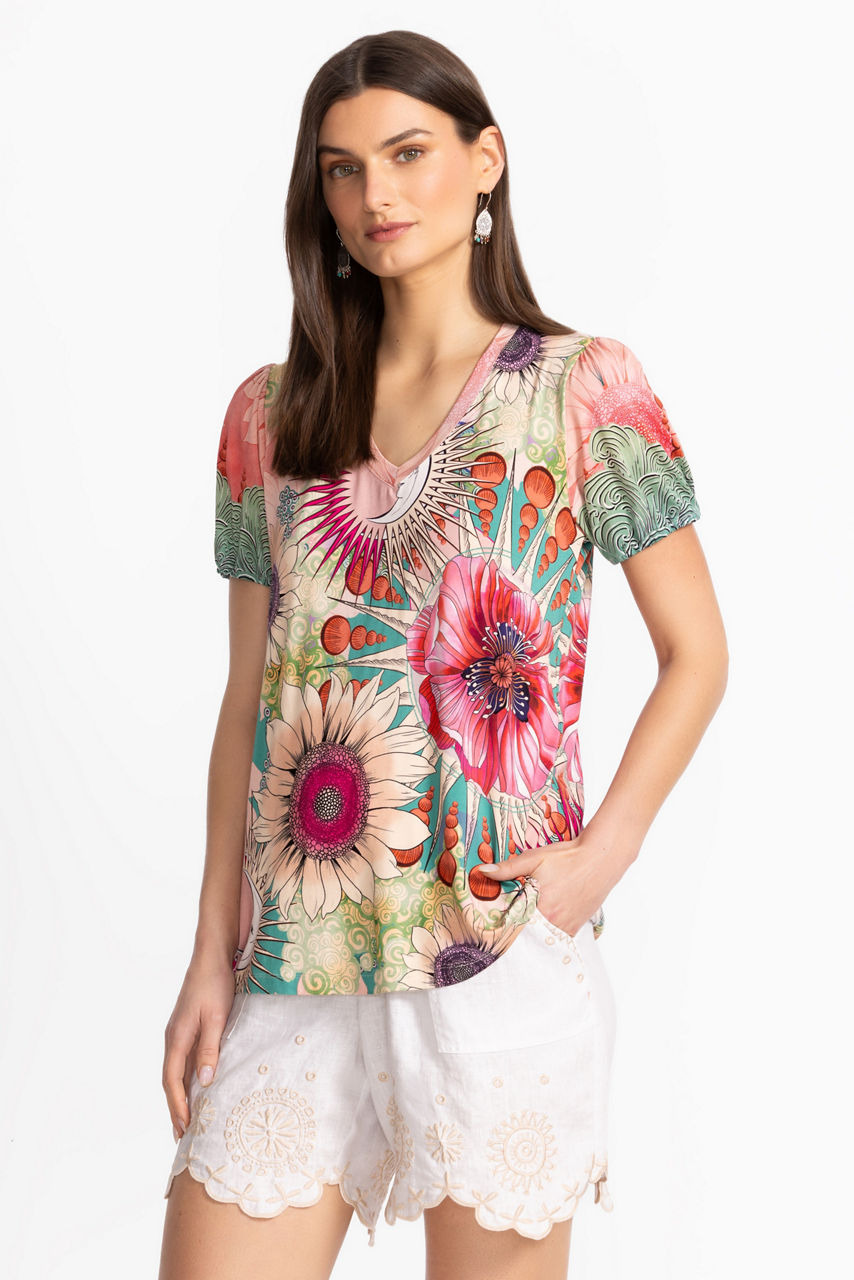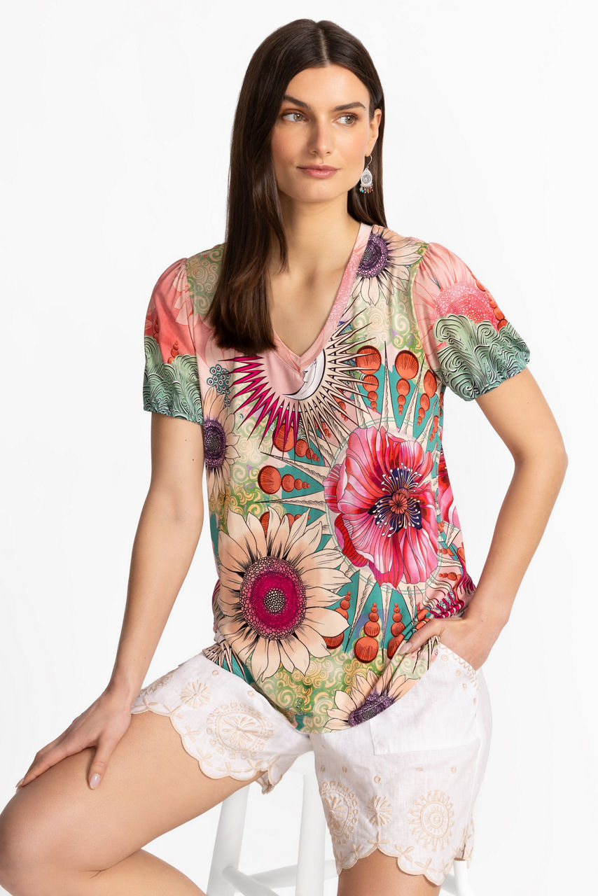 Offering a fresh take on a classic wardrobe staple, the Janie Favorite V-Neck Puff Sleeve Tee is adorned with a vibrant floral pattern. Designed with a V-neckline and relaxed-fit bodice, this modern tee is finished with elastic at the cuffs for a gently puffed sleeve. Pair with cropped jeans and fashion sneakers for a day of errands.