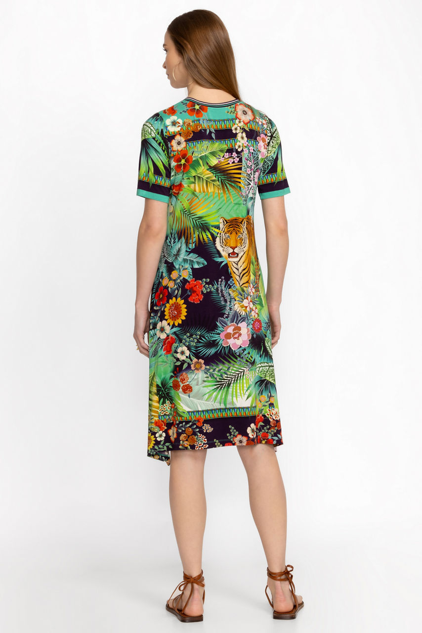 Crafted from a lightweight fabric, the Tigres V-Neck Swing Dress offers the perfect blend of comfort and bold style. Featuring an open V-neckline and straight bodice, this midi length dress is saturated with beautiful scenes in vibrant color. Pair with a casual denim jacket and the Tigres Mule Espadrilles for a perfectly coordinated weekend look.