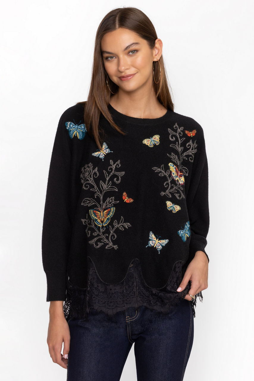 Crafted from a unique wool and cashmere blend, the Luciana Lace Butterfly Pullover creates a cozy oversized look. Featuring a crew neckline and boxy silhouette, this vibrant pullover is finished with a lace trim scalloped hemline and intricately embroidered butterflies in flight. Pair with relaxed-fit jeans and trendy ankle boots for a modern casual look.
