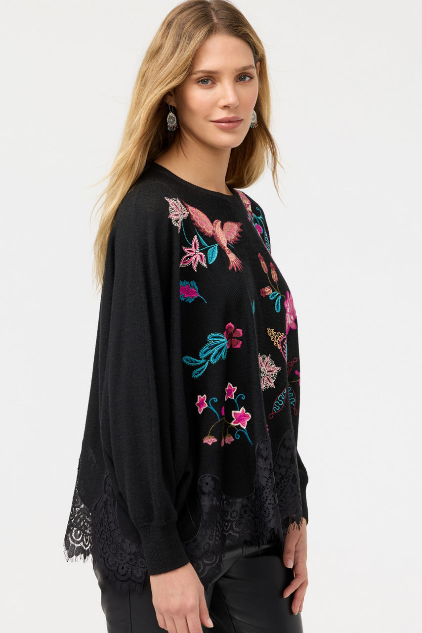 Crafted from 100% cozy wool, the Lace Oversized Pullover features a unique oversized silhouette. Designed with a crew neckline and Dolman sleeves, this pullover is embellished with vibrant embroidered details and finished with lace panel insets at the hemline. Pair with skinny jeans and ankle boots for an evening out with friends.