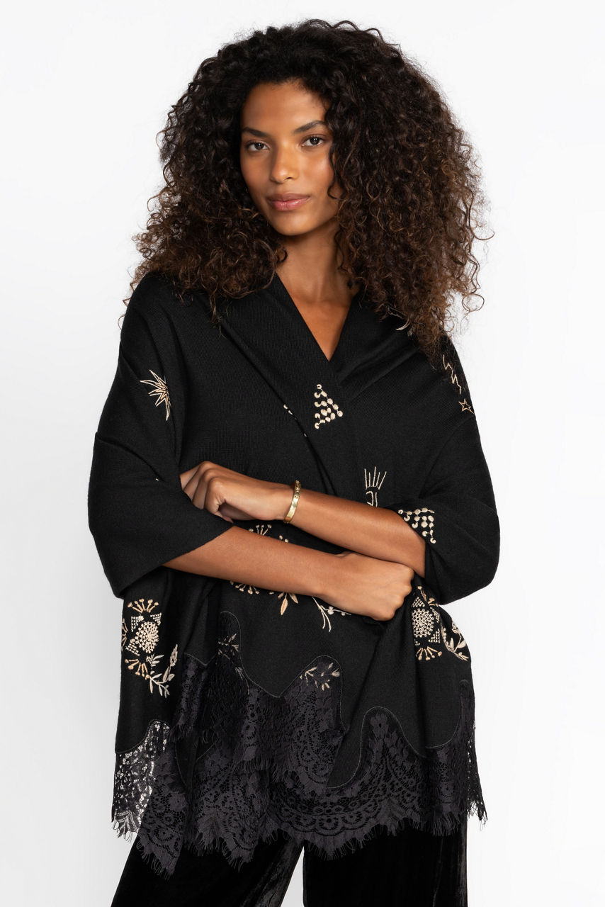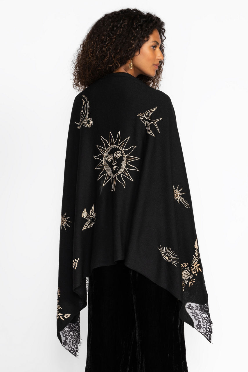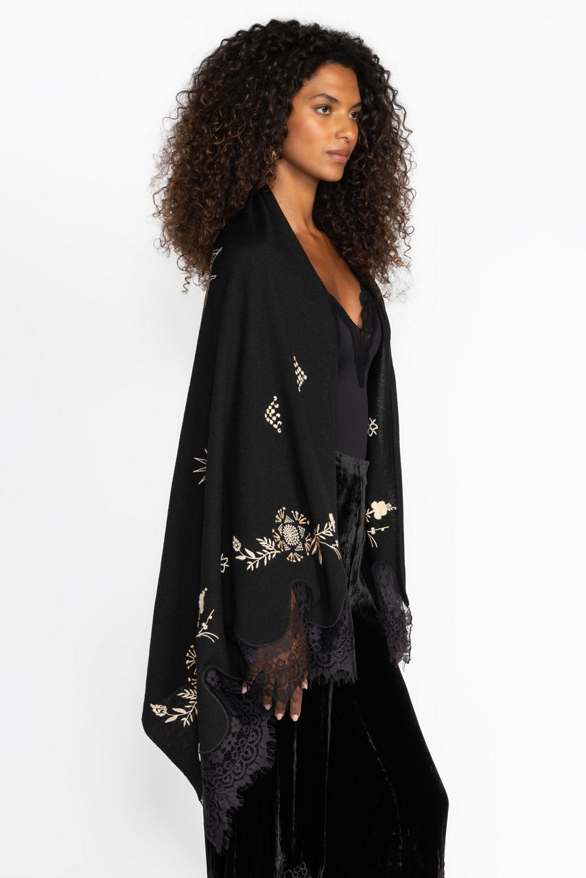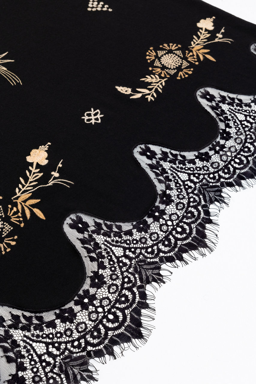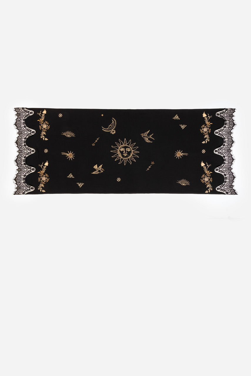 Thoughtfully crafted from rich 100% wool, the Lace Scarf combines texture and ornate detailing for a fresh look. Featuring delicate scalloped edges adorned with intricate lace, this unique scarf is finished with embroidered celestial and floral detailing. Wear knotted at the neck or tied at the handle of a classic handbag for a touch of whimsy.