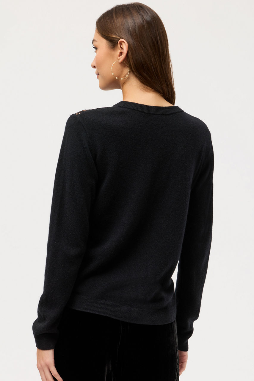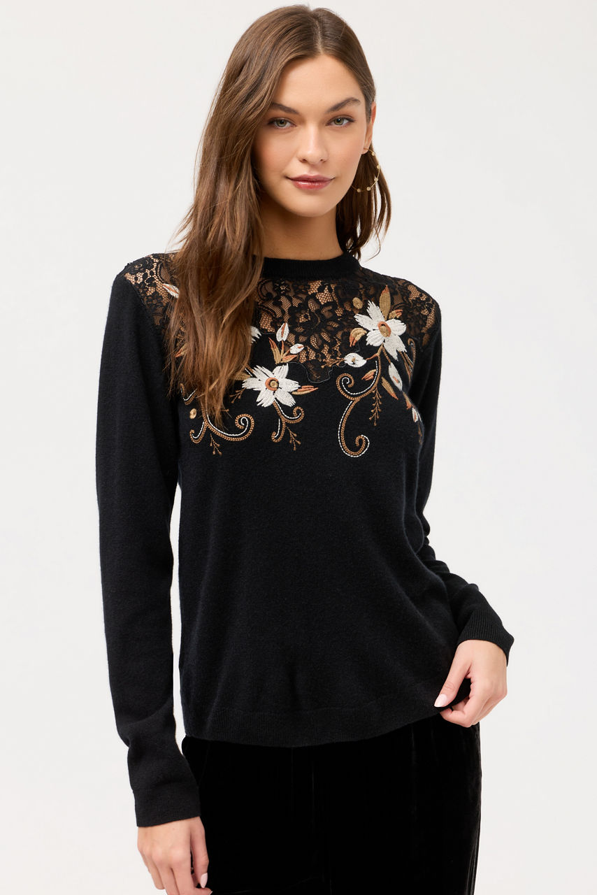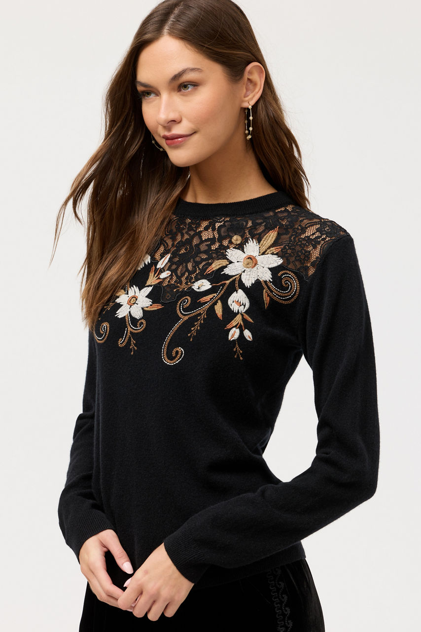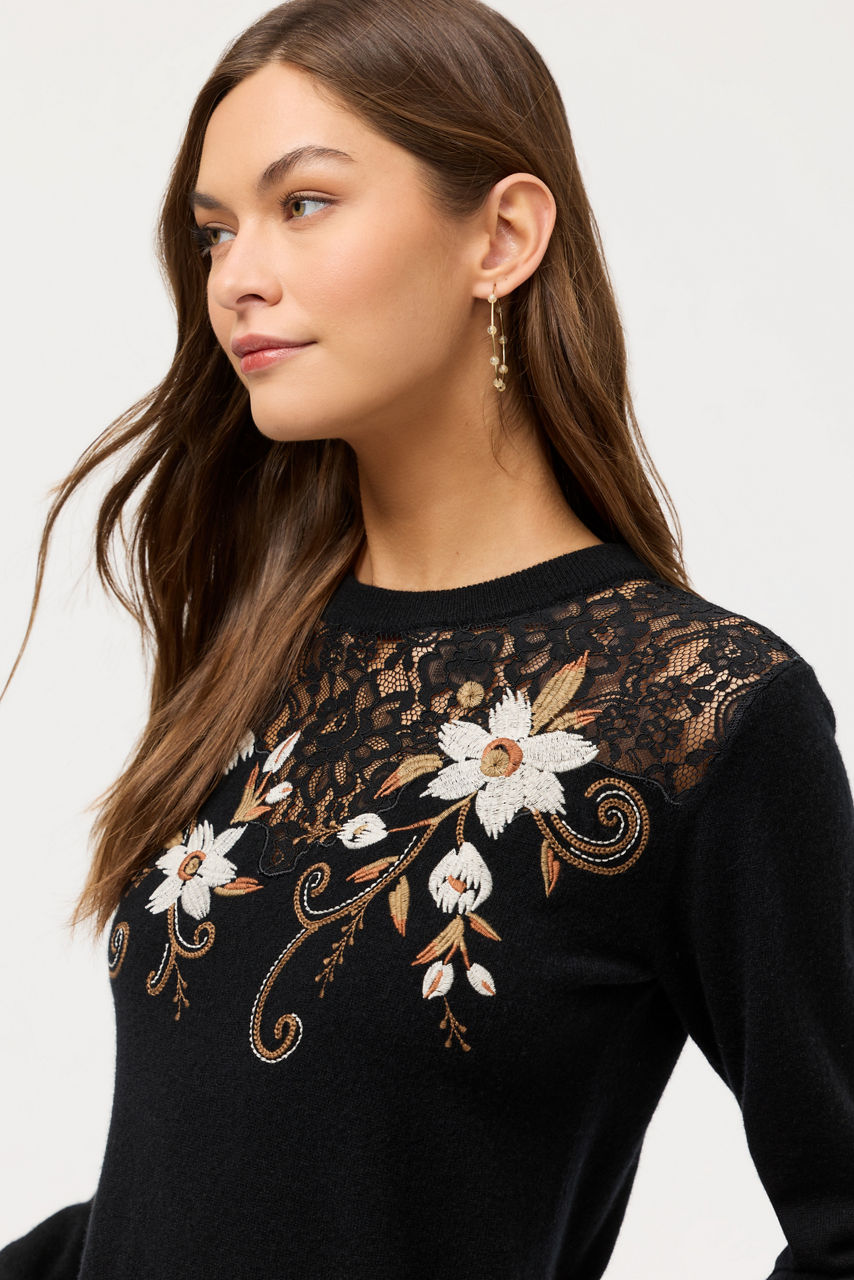 Crafted from a unique wool and cashmere blend, the Corinthe Lace Sweater is equally cozy and elegant. Designed with a crew neckline and long sleeves, this sweater features delicate lace insets at the shoulders and is finished with a vibrant floral embroidered overlay. Pair with trousers and pumps for a polished evening out.