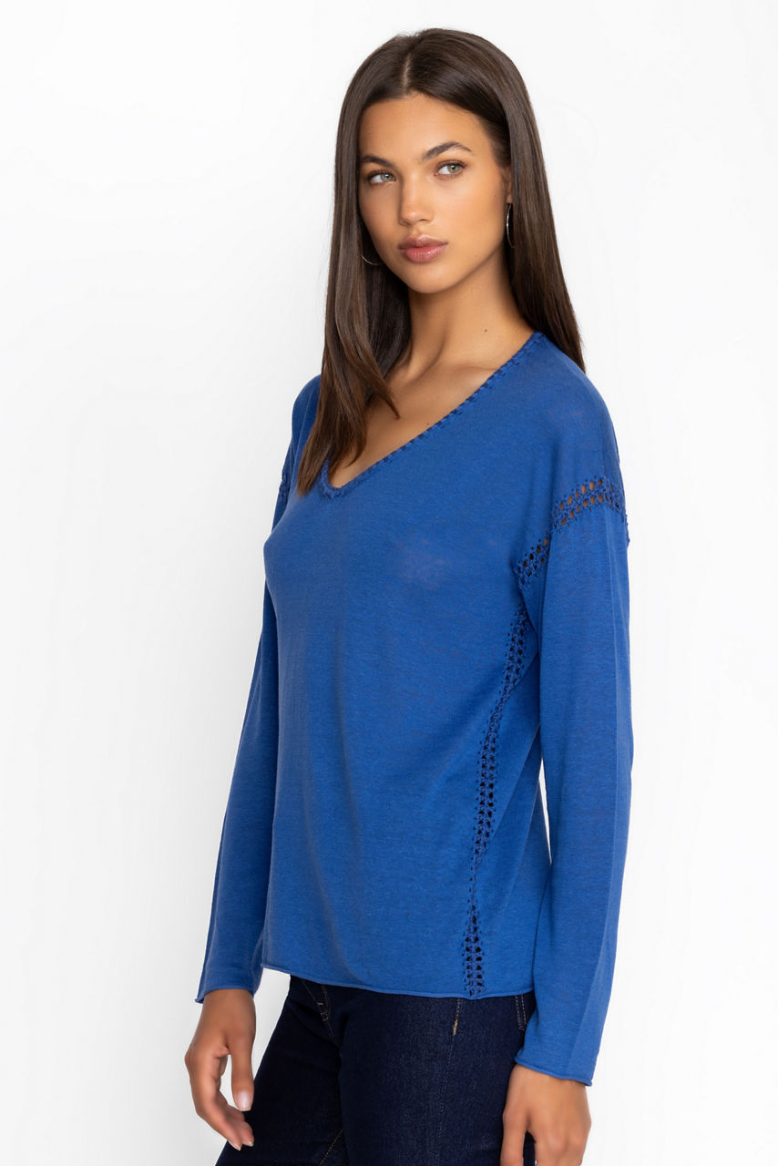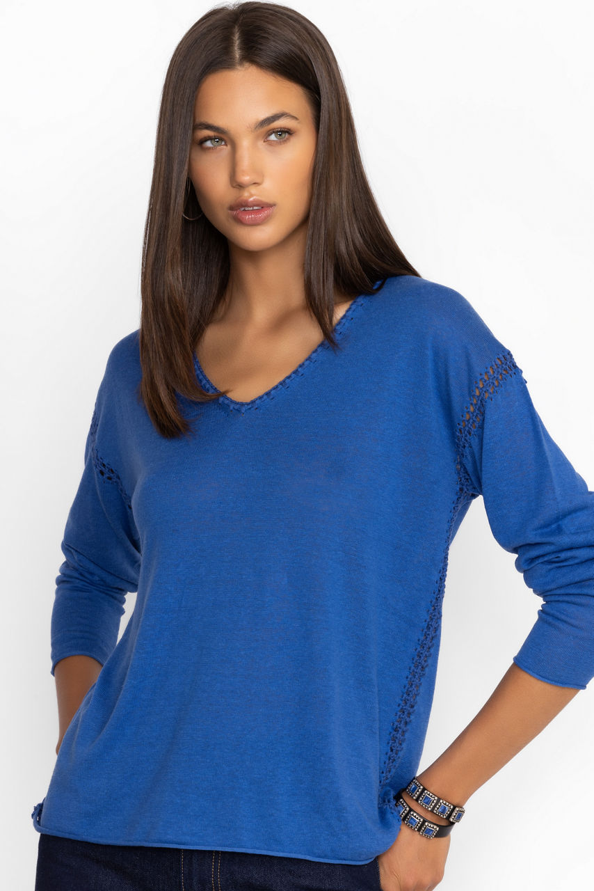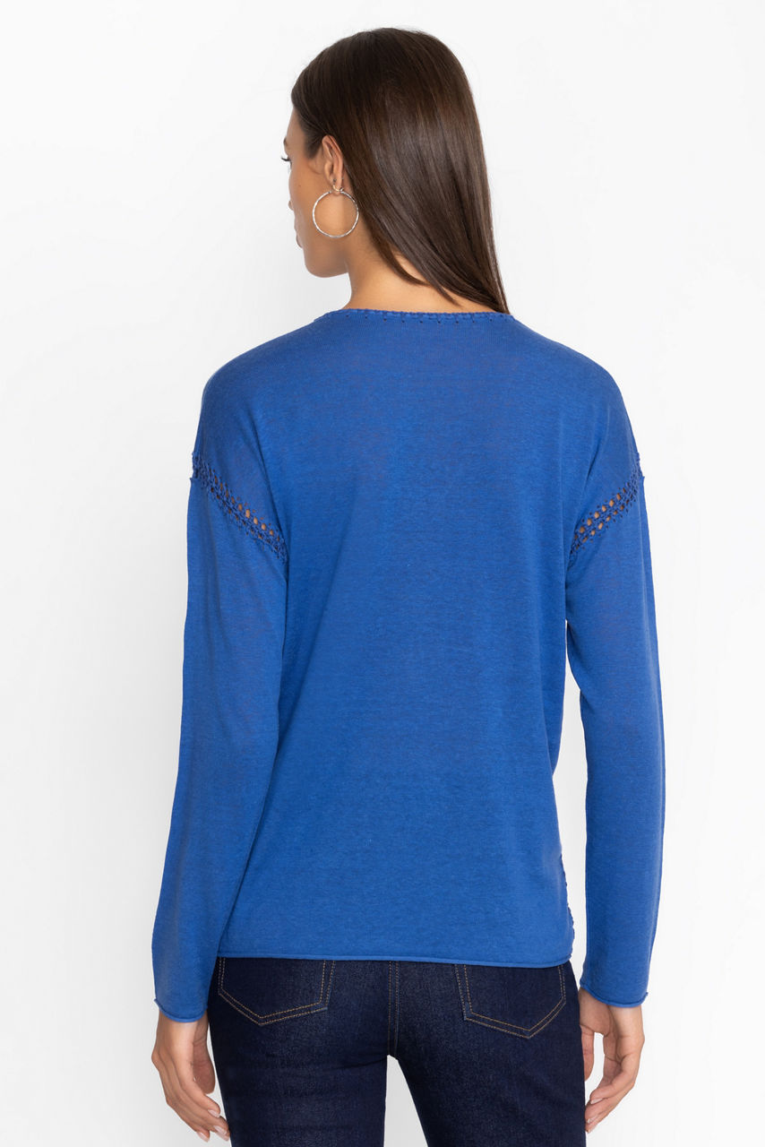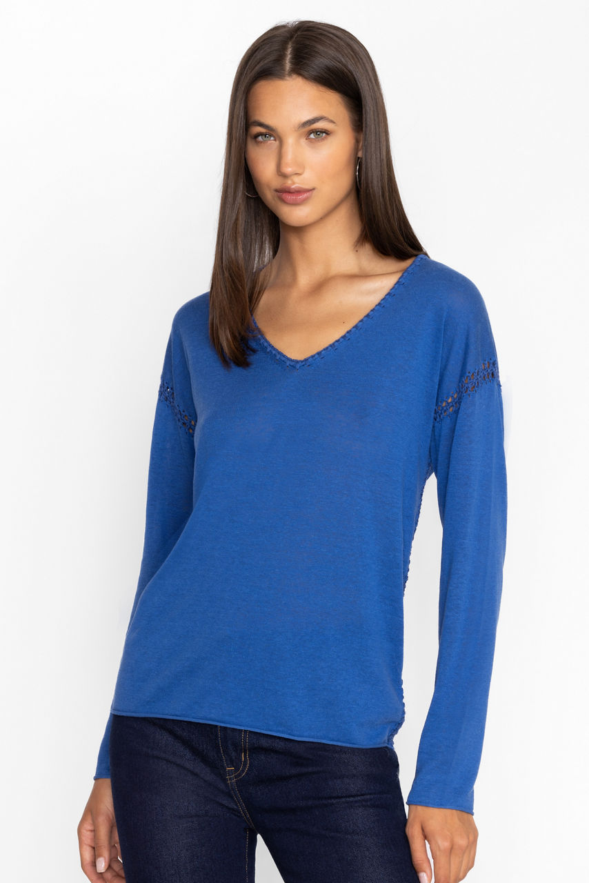 Crafted from a unique silk and linen blend, the Lightweight Classic Whipstitch Pullover is a versatile wardrobe staple. Featuring a V-neckline and drop shoulder seams, both intricately embroidered with whipstitch detailing, this cozy pullover creates a timeless silhouette. Pair with wide-leg trousers and kitten heels for a stylish work look.