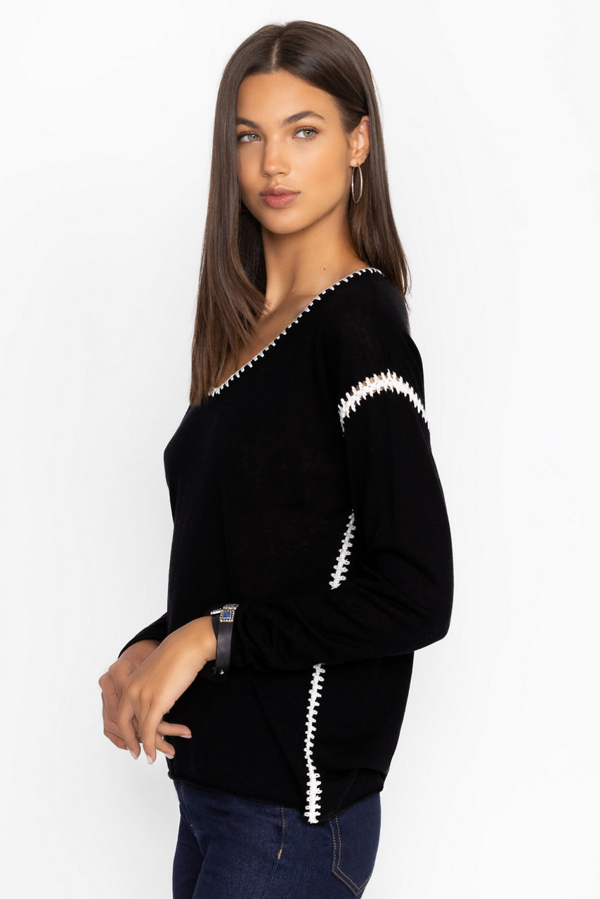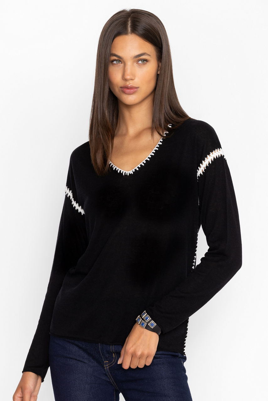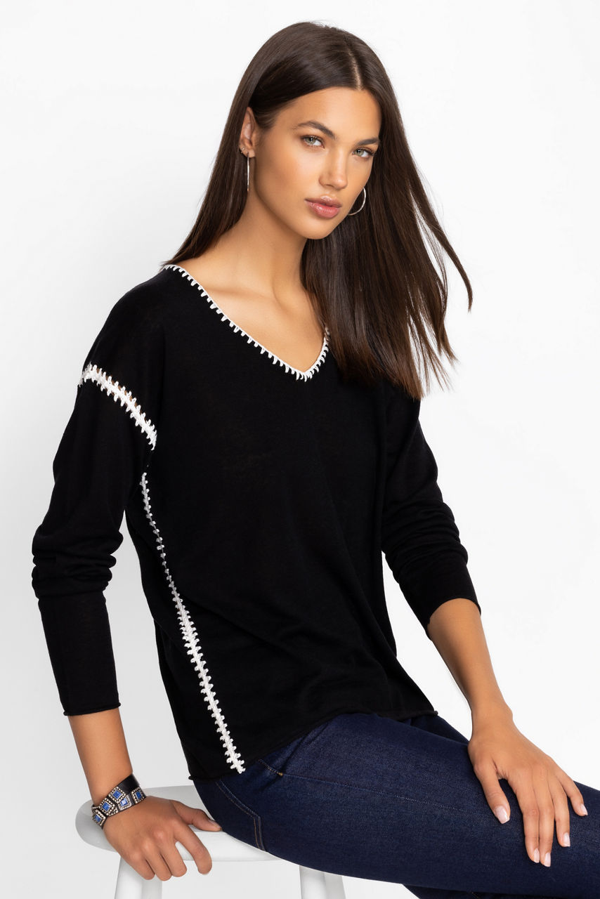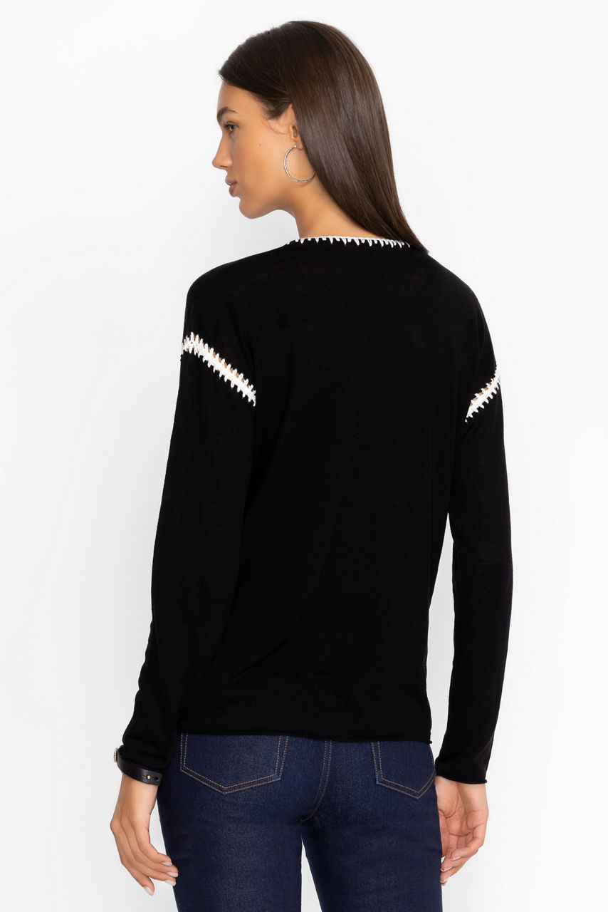 Crafted from a unique silk and linen blend, the Lightweight Classic Whipstitch Pullover is a versatile wardrobe staple. Featuring a V-neckline and drop shoulder seams, both intricately embroidered with whipstitch detailing, this cozy pullover creates a timeless silhouette. Pair with wide-leg trousers and kitten heels for a stylish work look.