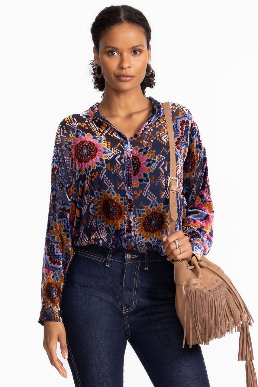 Beautifully embellished with a retro-inspired pattern and burnout detailing, the Oversized Audrey Shirt offers a boyfriend oversized silhouette and a relaxed fit. Crafted from a luxurious silk blend, this button-front shirt is finished with a drop shoulder. Pair with color denim and colored flats for a vibrant casual ensemble.
