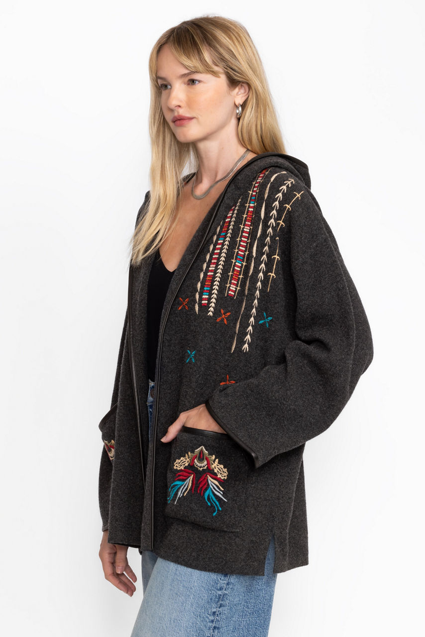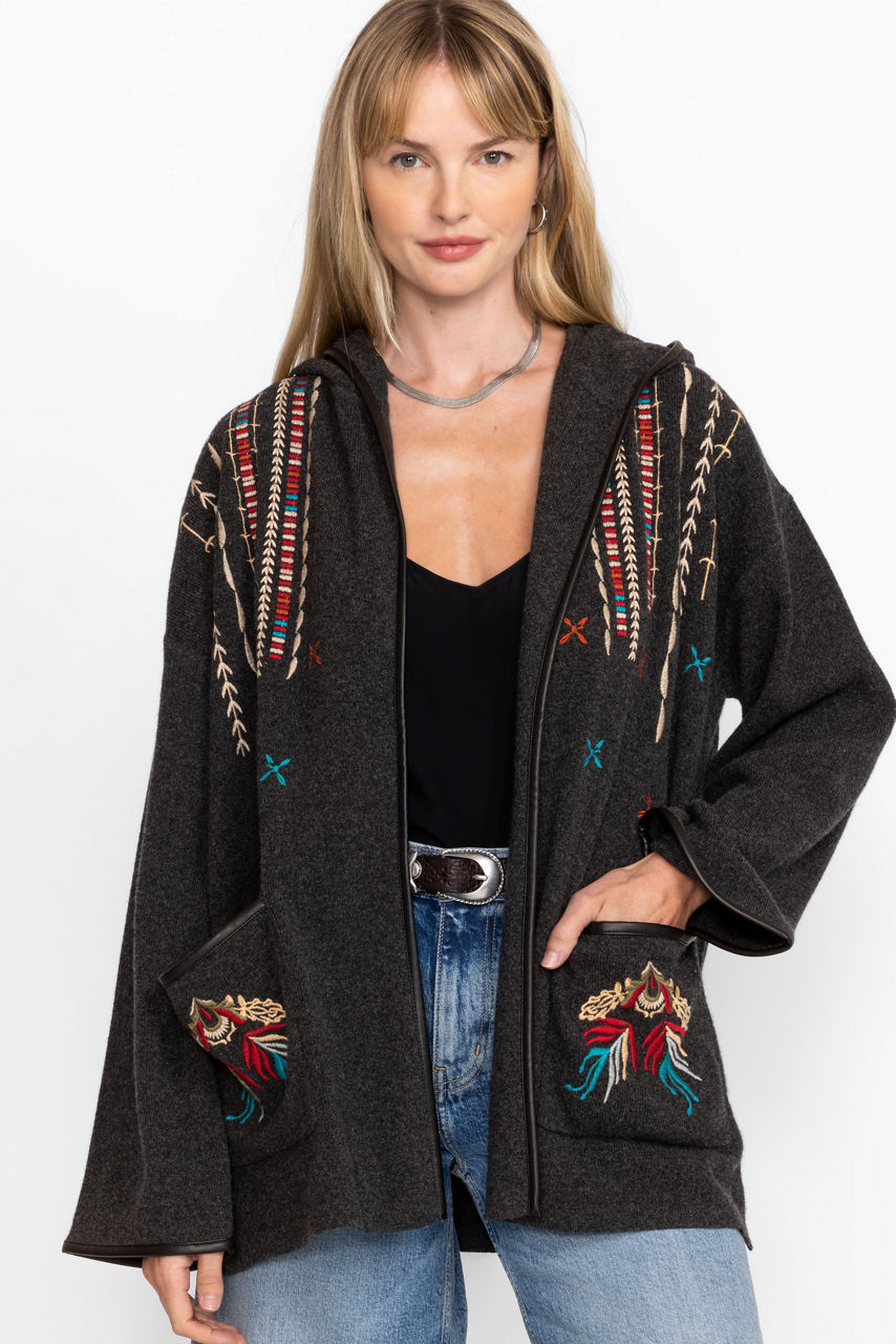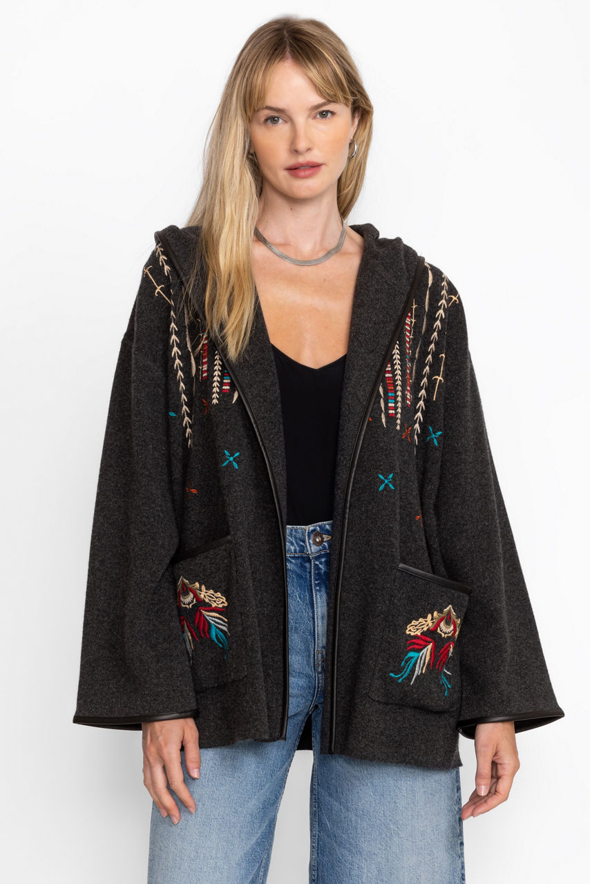 Crafted from 100% cozy wool, the Steffania Oversized Coat is embellished with bold embroidered detailing for a splash of color. Featuring an open front and slit pockets, this deep grey coat is finished with a faux leather belt and trim throughout. Layer over a cashmere pullover and pair with classic trousers for a polished dinner look.
