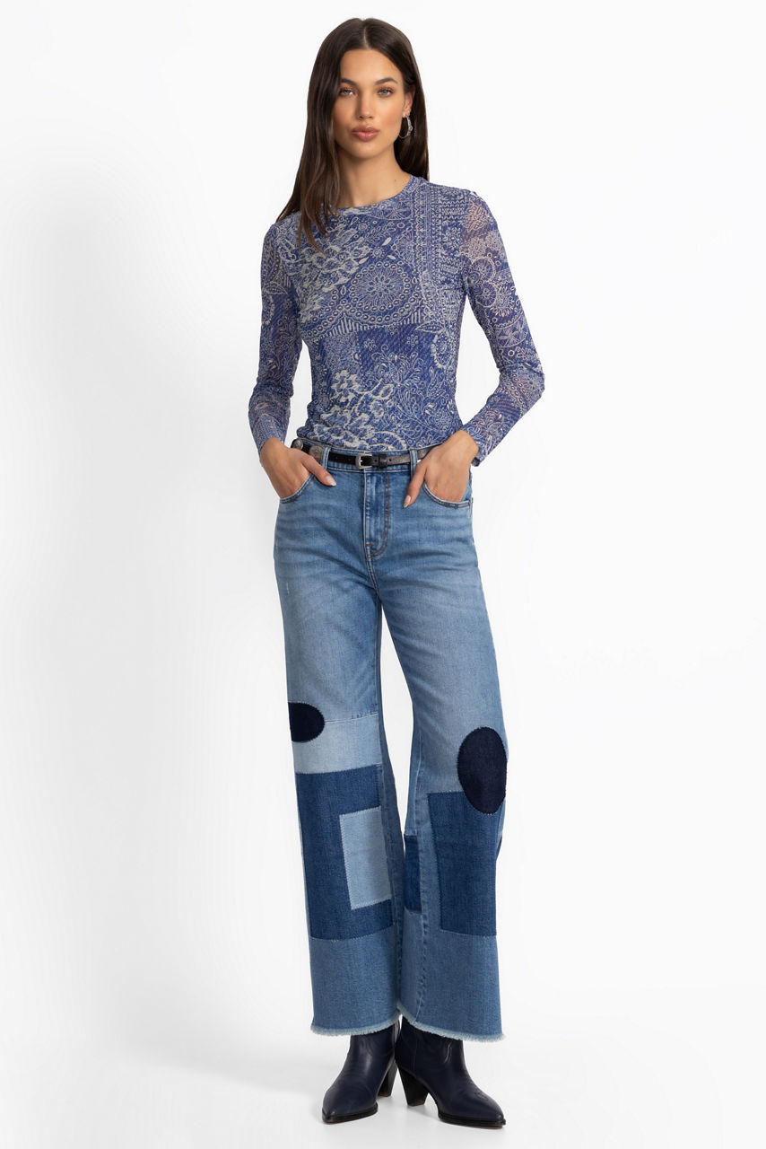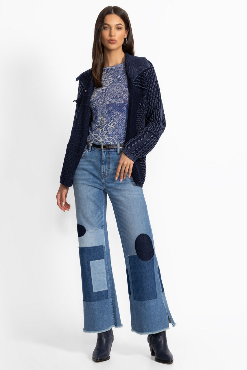 Thoughtfully crafted with a perfect blend of breathable cotton and comfortable stretch, the Patched Straight Flare Jeans are equal parts fashionable and fun. Featuring a button front and a flared leg line vented at the sides, these unique jeans are embellished with a playful patchwork of denim in a variety of blue hues. Pair with a silk button-down and bold heels for a girls' night out.