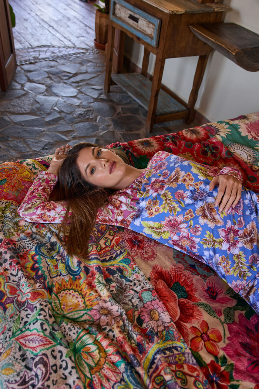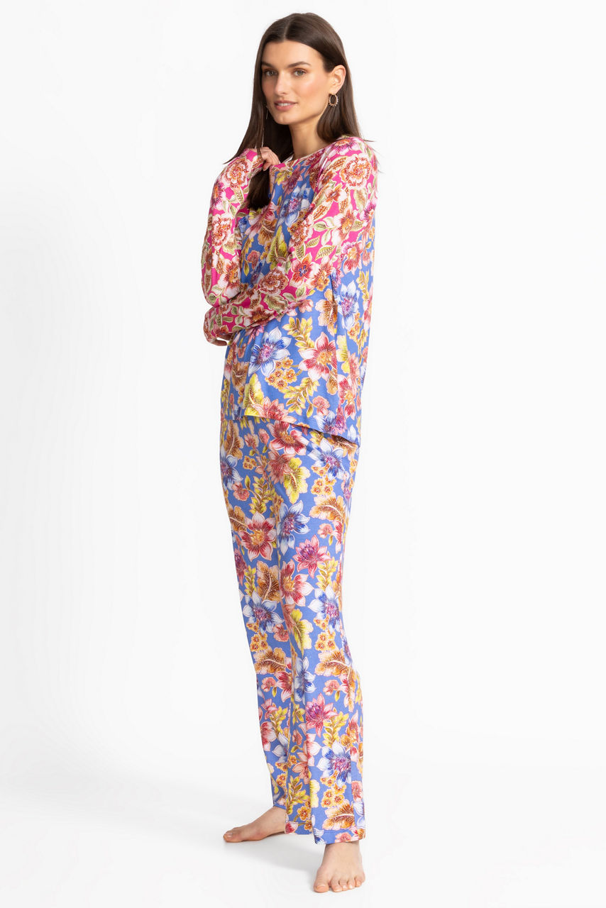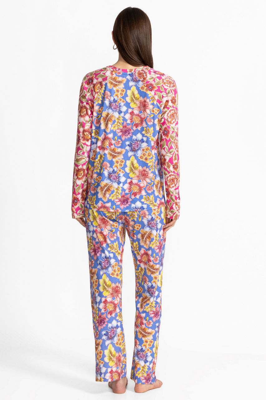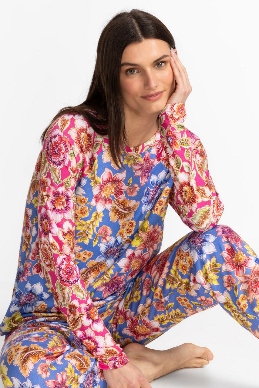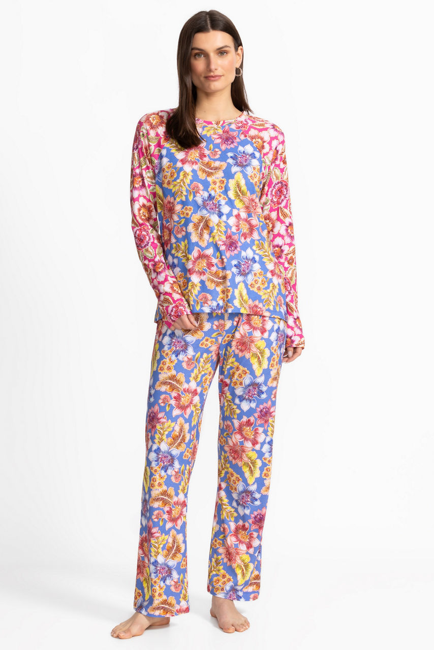 Beautifully adorned with a bold floral print, the Raglan PJ Set is crafted in an ultra-soft cotton blend. Featuring a crew neckline with a contrasting trim and long sleeves, this two-piece set is finished with long pants for a cozy feel. Pair with the Jonesy Sleep Robe and coordinating slippers for a cozy evening in.