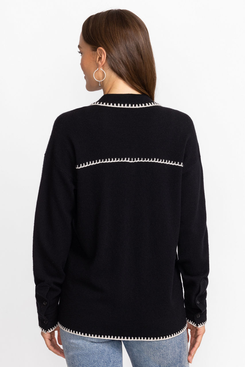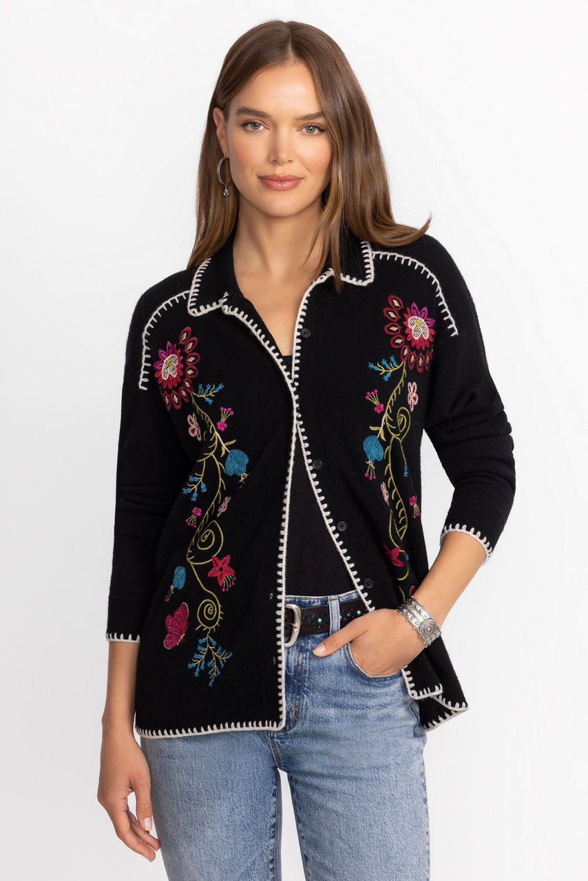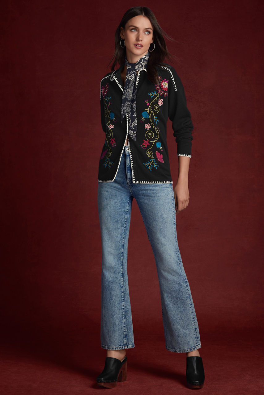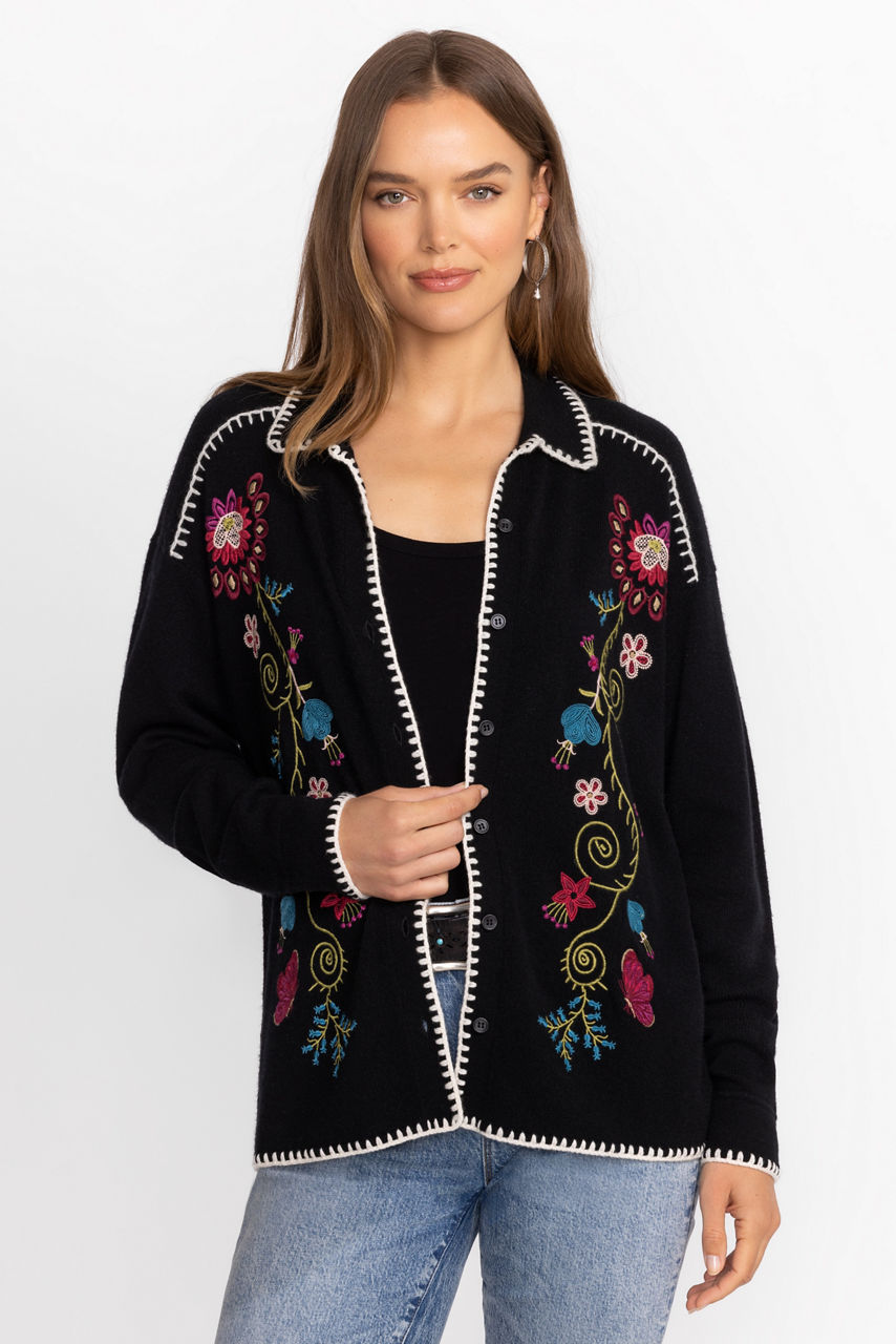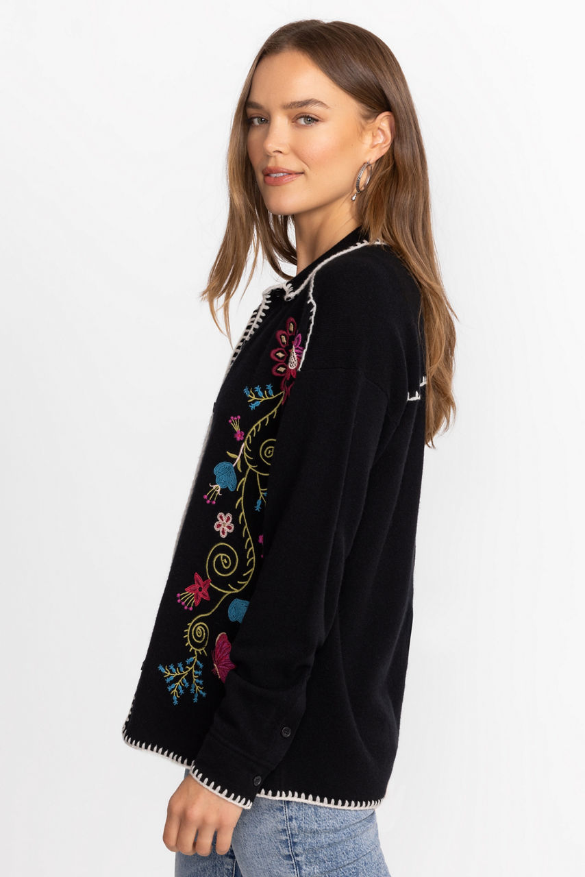 Crafted from a luxurious blend of wool and cashmere, the Sisa Shirtagan is the perfect combination of versatility and whimsy. Featuring a button-front with a peter pan collar accented with contrasting whipstitch detailing, this cozy piece is embellished with colorful placement embroidery. Pair with fitted pants and a coordinating cami for a fresh workday look.