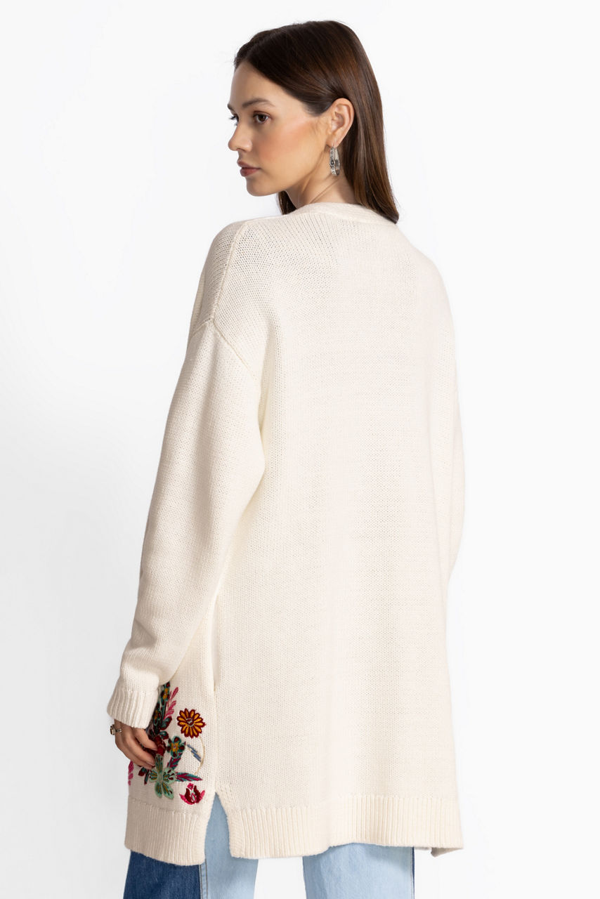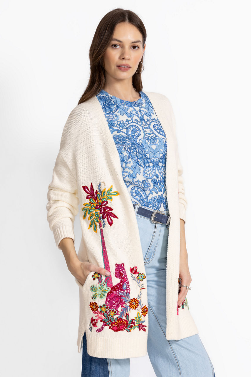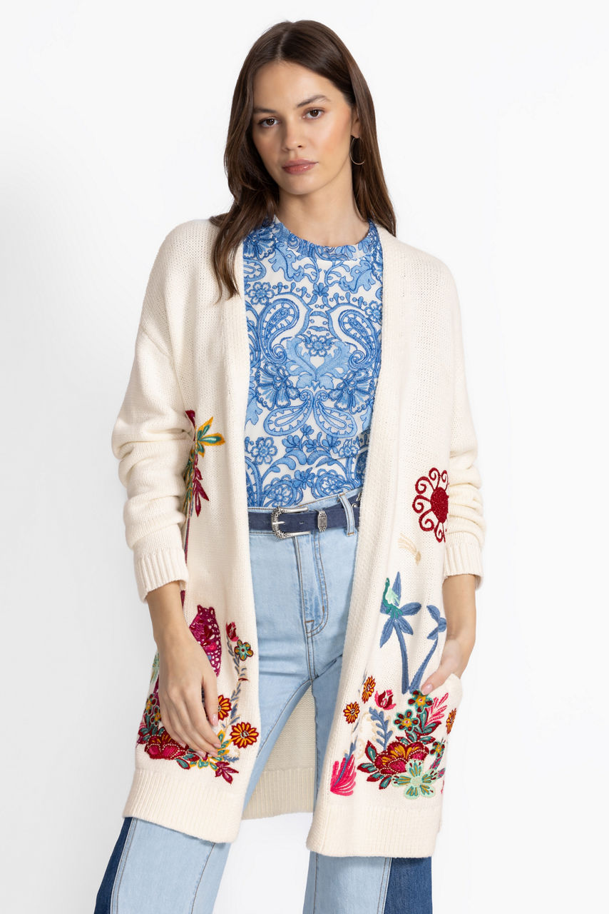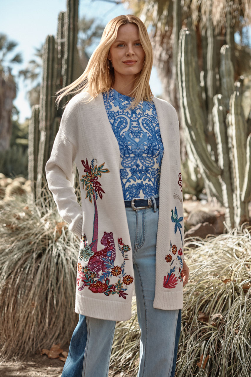 Crafted from a cozy cotton blend, the Side Slit Cardigan offers an extra layer of warmth for the cooler season. Designed with an open front and longer length, this cardigan is finished with intricate embroidered designs in vibrant colors. Layer over a coordinating cami and pair with fitted denim for a resort-worthy casual look.