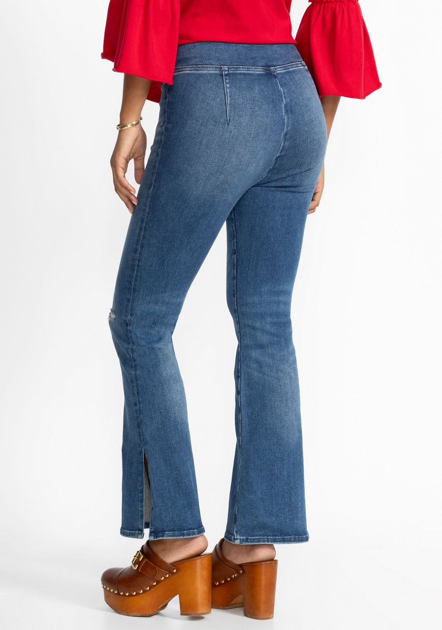 Equal parts fresh and modern, the Side Slit Pull On Kick Flare Jeans are crafted from a lightweight cotton blend with a hint of stretch. The easy pull-on design offers a fitted silhouette and is finished with slits at the sides for added texture. Pair with a tunic length pullover and trendy ankle boots for an on-trend look.