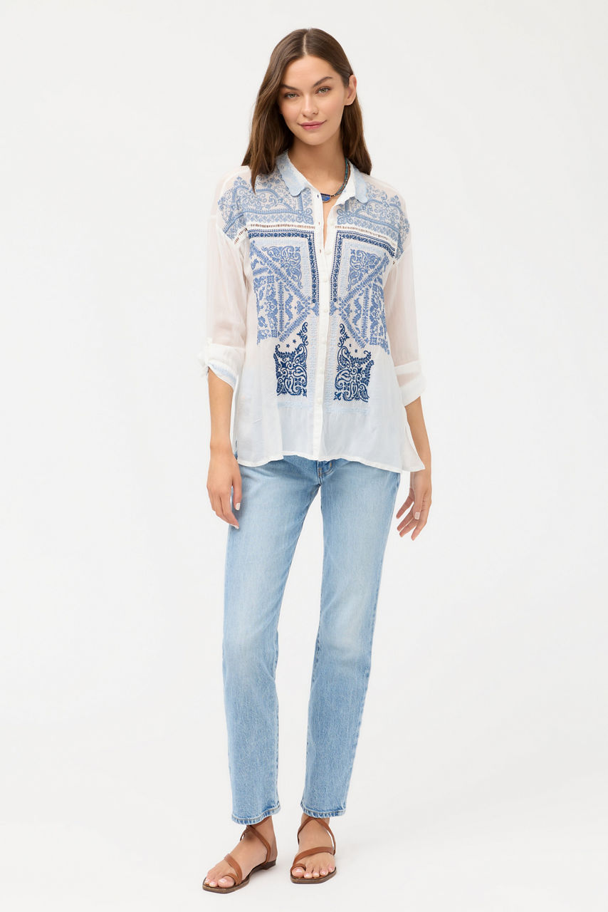 Crafted from a lightweight, flowing fabric, the Bandana Slim Audrey Collared Shirt features an intricate embroidered pattern. Designed with a button-front and drop shoulder, this beautifully embellished blouse is finished with roll-tab sleeves and side slits for a relaxed fit. Pair with fitted denim and espadrille wedges for a fresh weekend look.