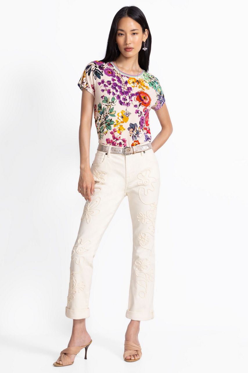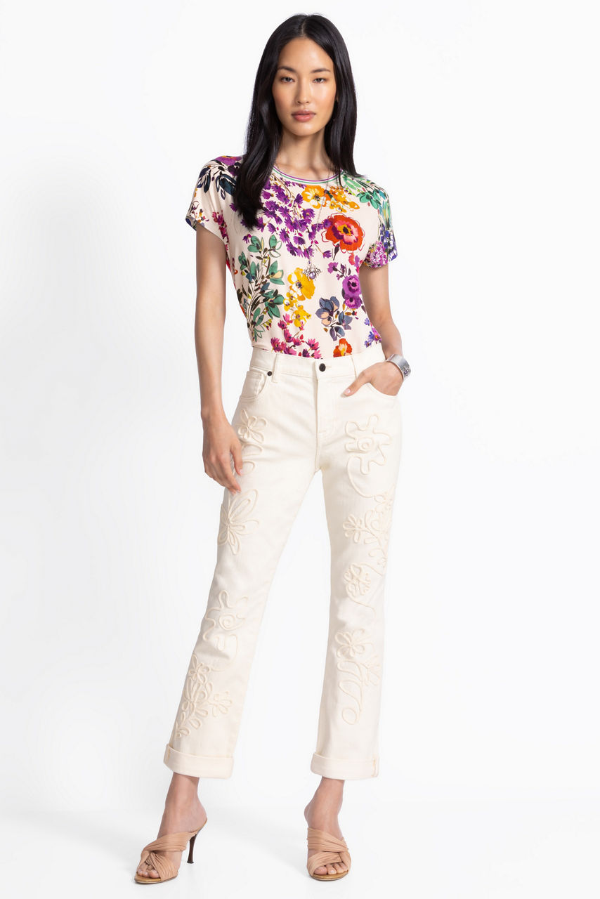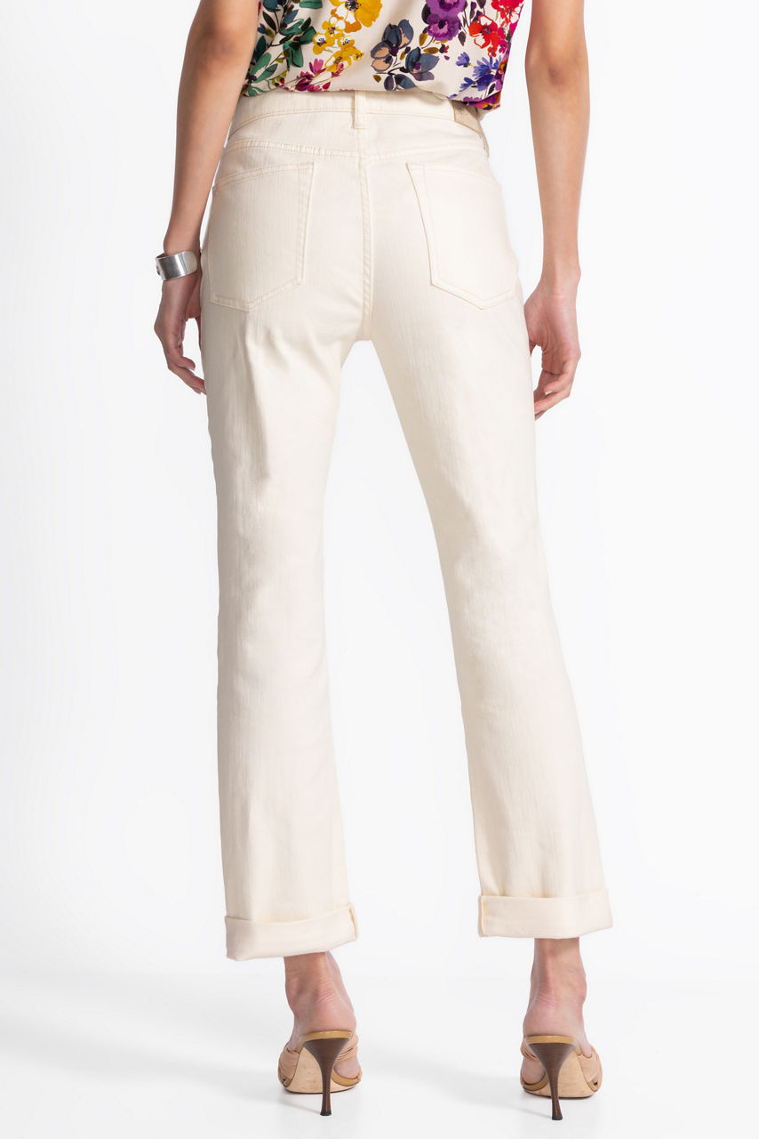 Crafted from a luxuriously soft cotton blend with a hint of stretch, the Janika Soutache Boyfriend Jeans are equal parts comfortable and stylish. Designed with a classic zippered button front, these relaxed-fit jeans are embellished with detailed embroidery and traditional Soutache braided elements for an exciting textured look. Pair with a fitted tee and fashion sneakers for a polished casual ensemble.