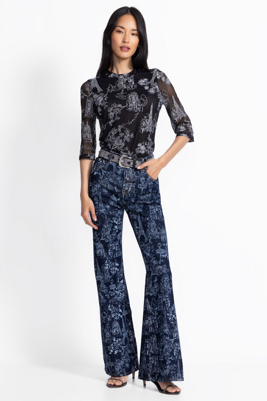 Embellished with a unique floral design on a rich indigo backdrop, the Louise Straight Flare Jeans are crafted from a rich cotton blend. Featuring a traditional 5-pocket design with a front fly, these dark wash jeans are finished with a straight leg and flared detailing at the cuffs. Pair with a crisp white button down and bold silver jewelry for a stunning finished look.