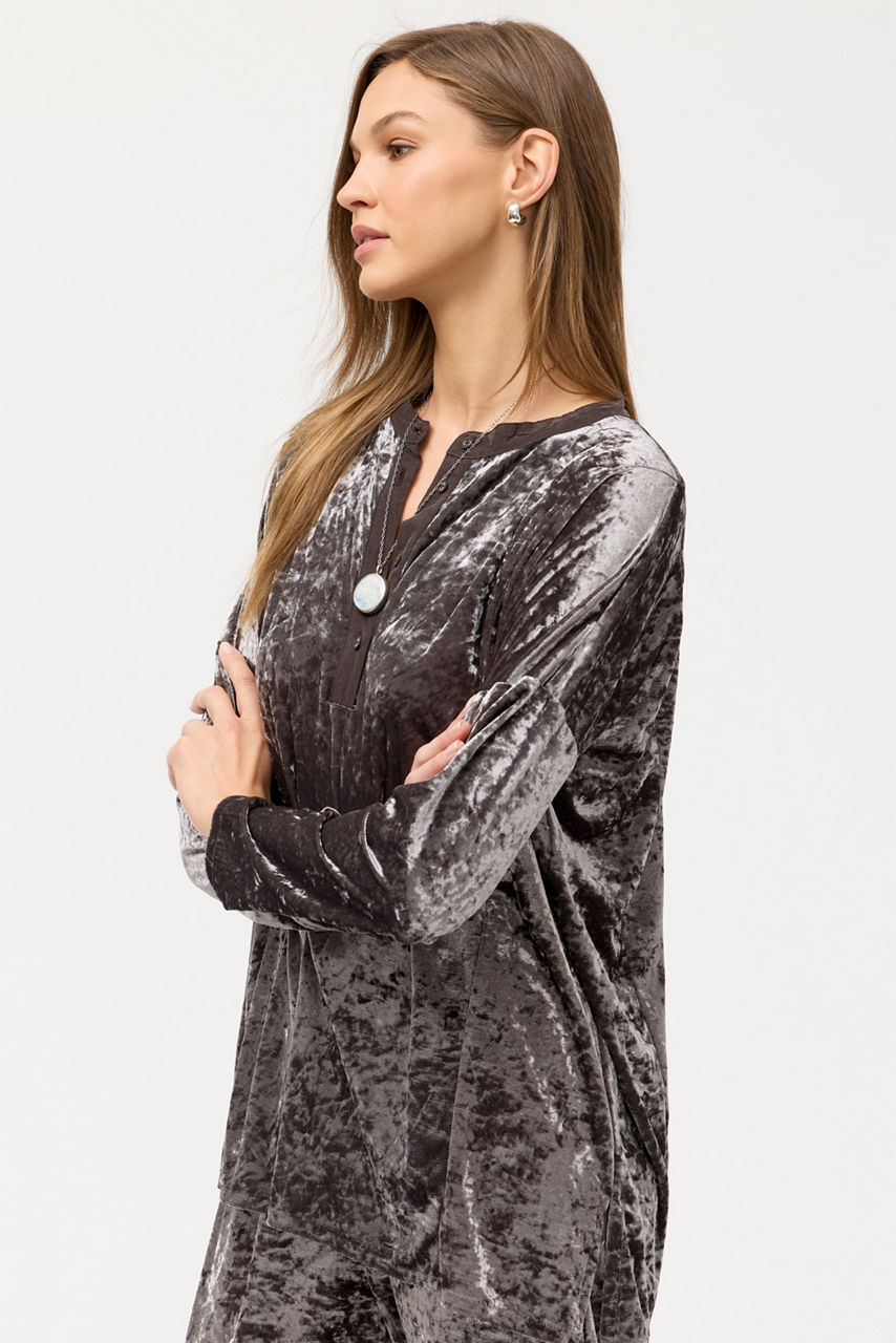 Crafted from a rich velvety texture, the Velvet Boxy Top is equal parts cozy and classic. Designed with a Henley button-closure and drop shoulder long sleeves, this casual top offers a wide cut bodice for a relaxed fit. Pair with skinny jeans and coordinating flats and an easy daily tote for a day of errands.