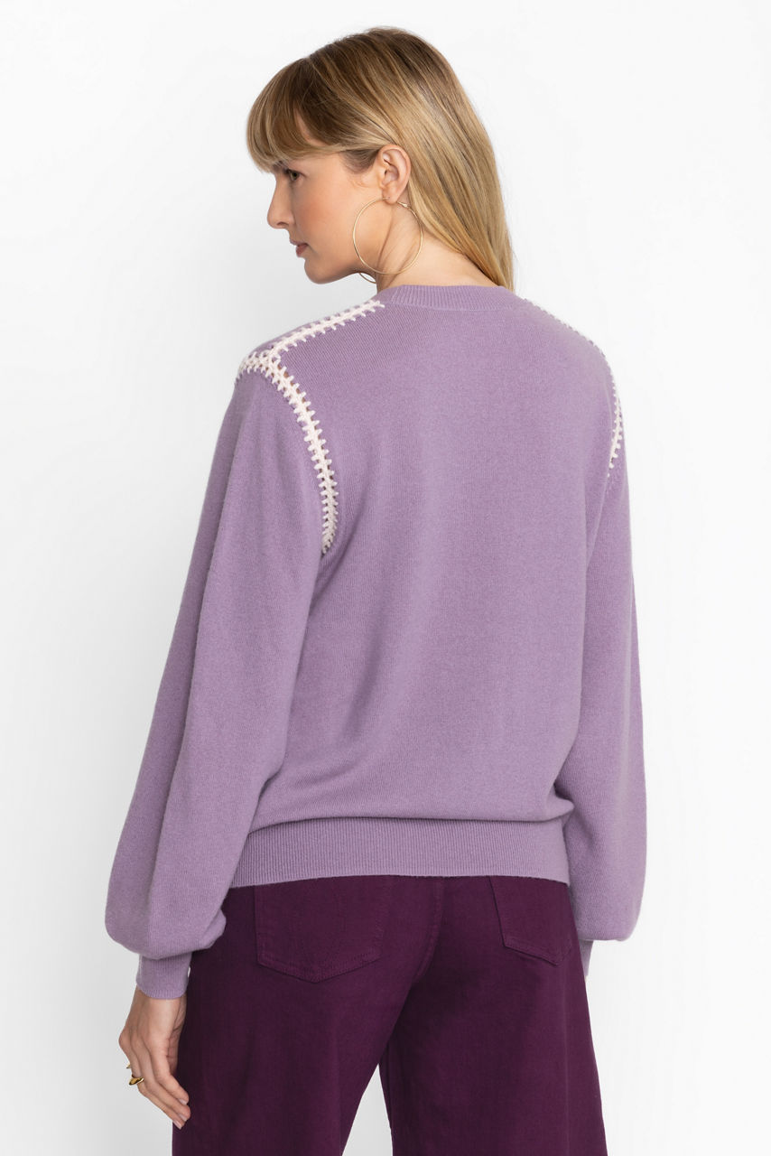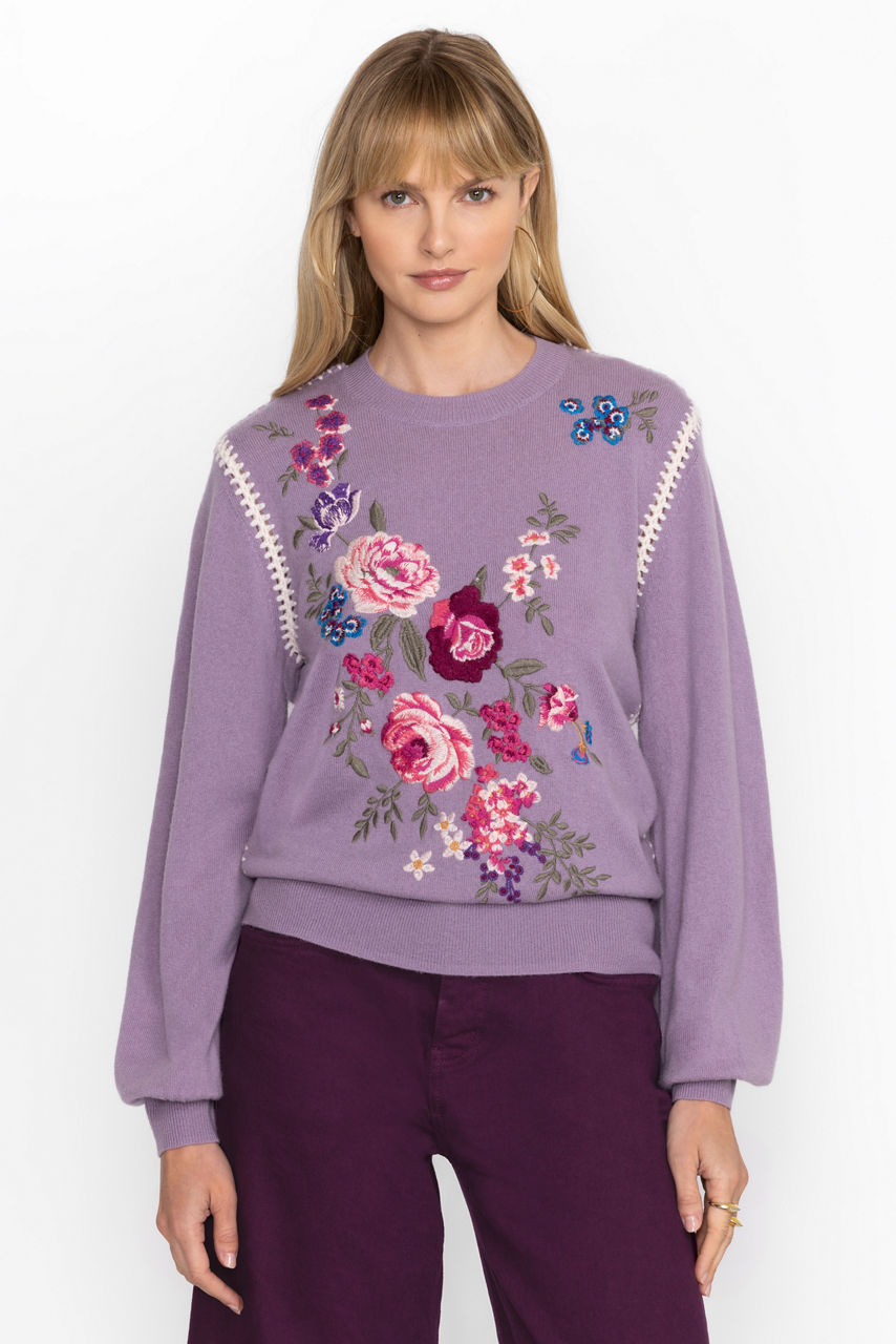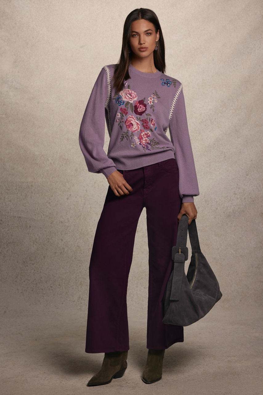 Embellished with a distinctly feminine floral array, the Georgiana Whipstitch Crewneck Sweater is crafted from a cozy wool and cashmere blend. Featuring a crew neckline and gently puffed bell sleeves, this unique pullover is finished with a bold and decorative whipstitch. Pair with flared denim and trendy ankle boots for a chic weekend look.