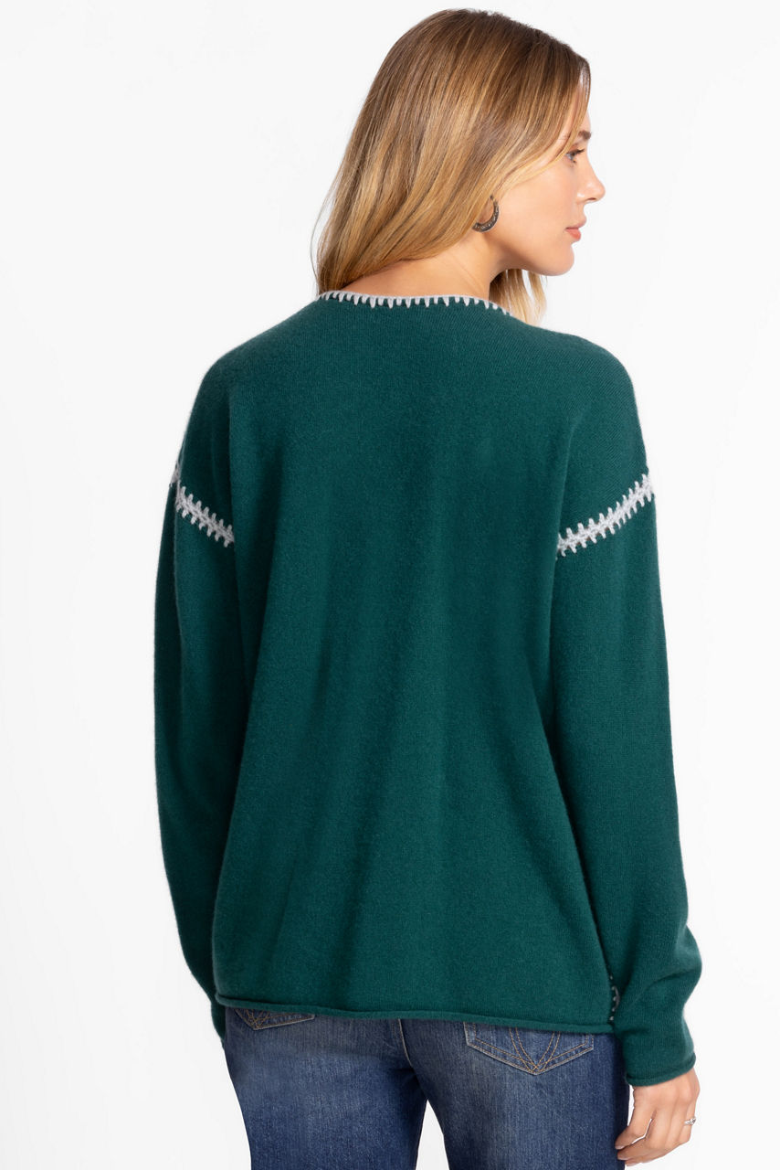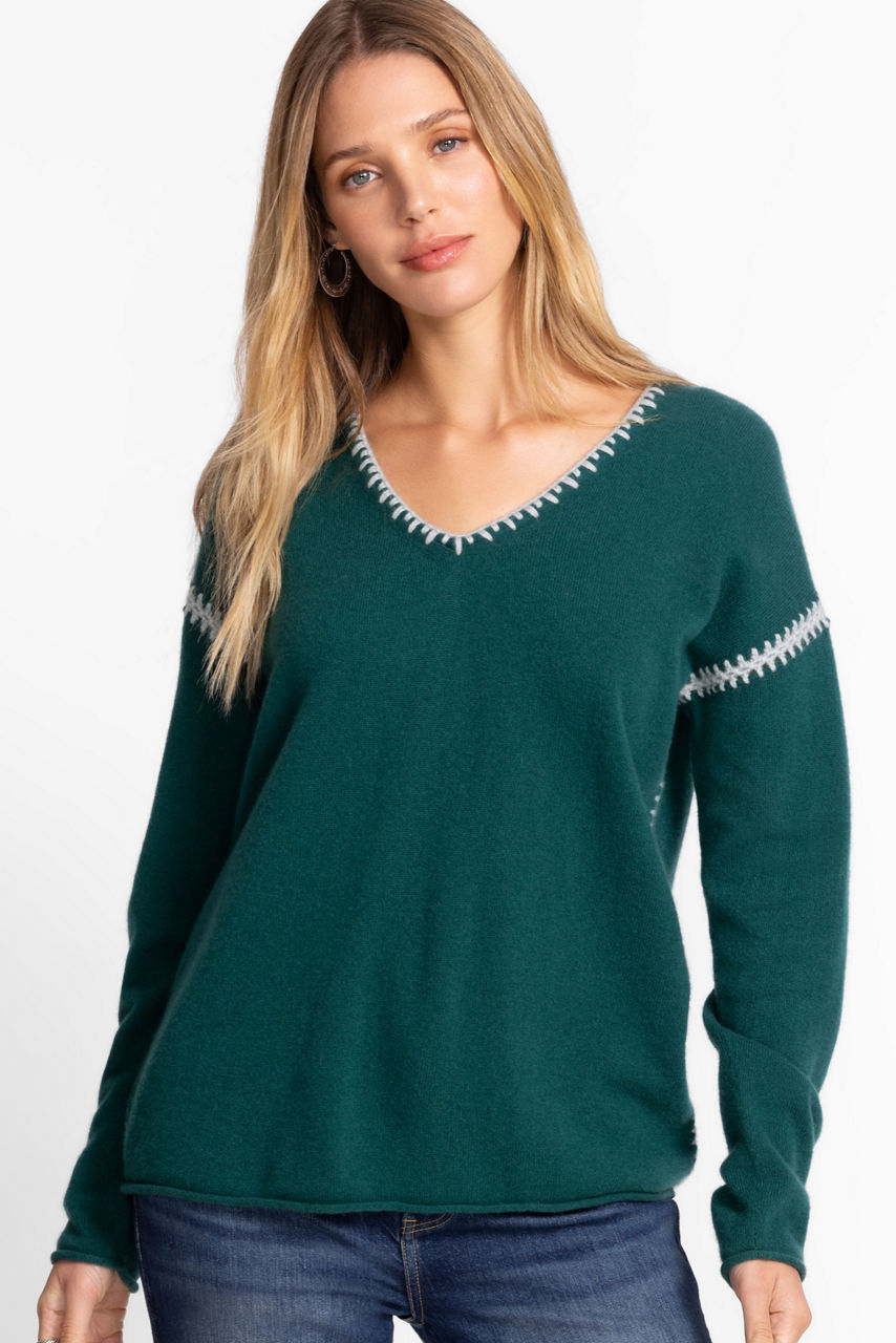 The Whipstitch V-Neck Sweater is crafted from 100% cashmere, blending plush comfort with unmistakable style. Designed with a V-neckline and dropped shoulders, this cozy pullover is embellished at the seams with a decorative whipstitch. Pair with a bold maxi skirt and tall boots for a timeless evening look.